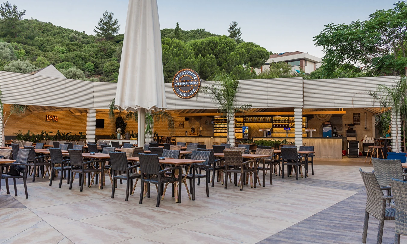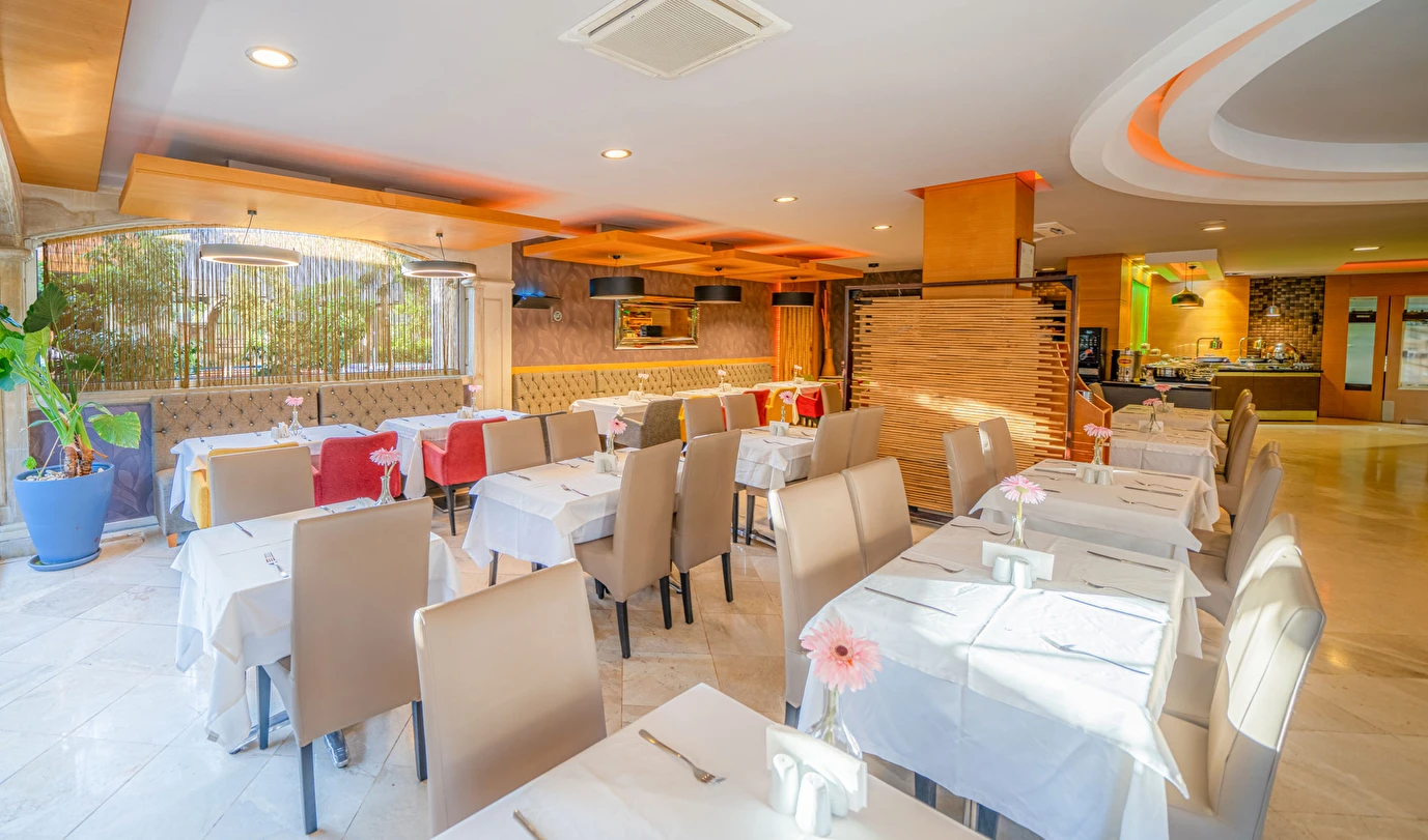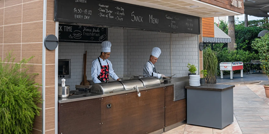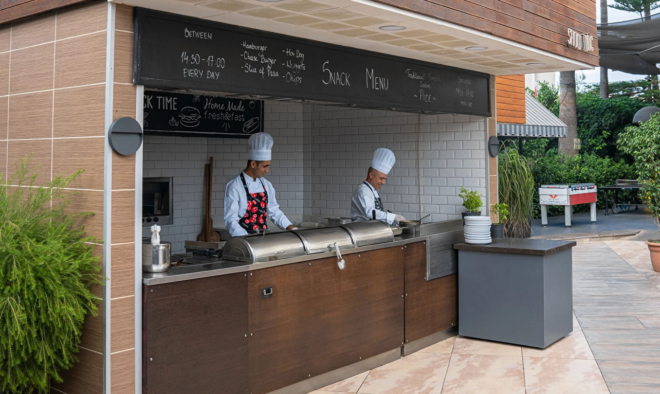 Sabah kahvaltısı, öğle ve akşam yemekleri açık büfe olup, tesisin belirlemiş olduğu markalar dahilinde yerli alkollü ve alkolsüz içecekler 10:00 ile 23:00 saatleri arasında ücretsizdir.