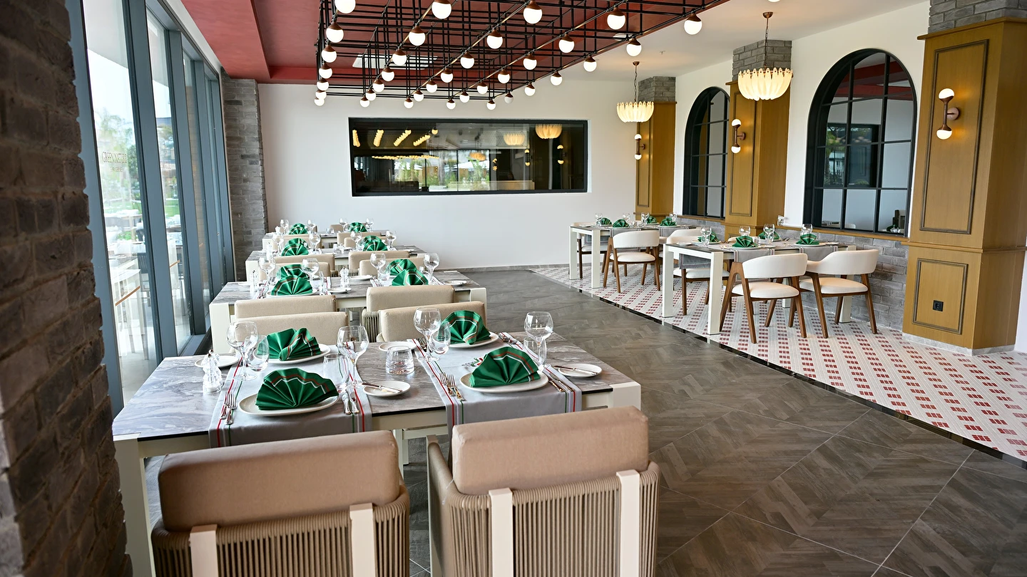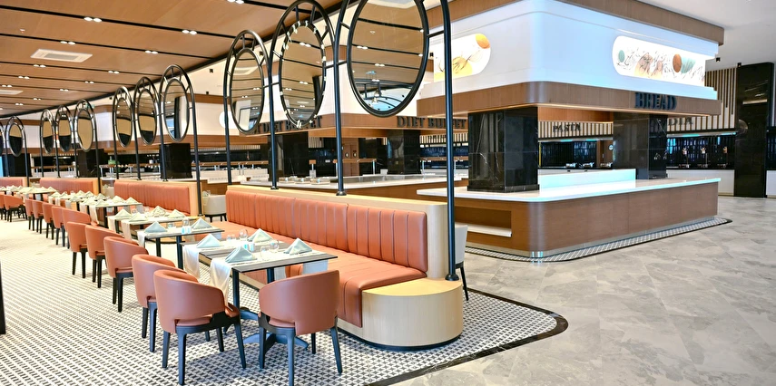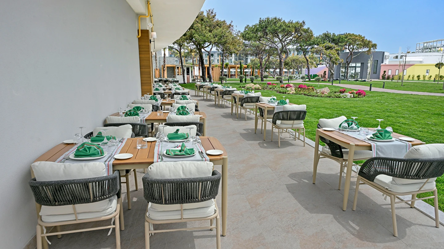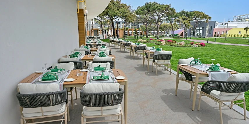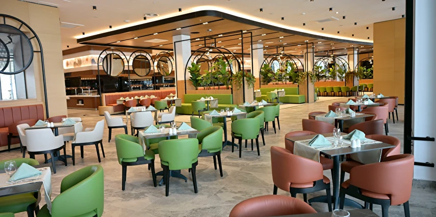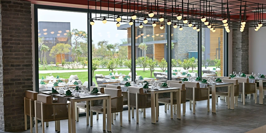 Sabah kahvaltısı, öğle ve akşam yemekleri açık büfe olup tesisin belirlemiş olduğu markalar dahilinde 24 saat ücretsizdir. Kahvaltıda taze sıkılmış portakal suyu ana restoranda sunulmaktadır.