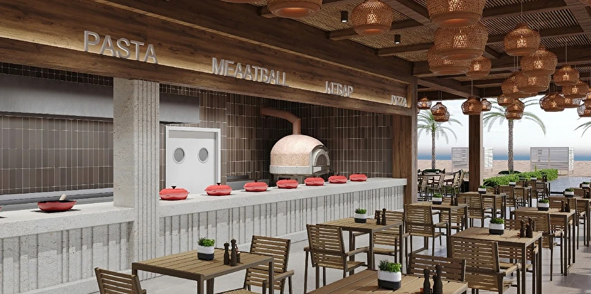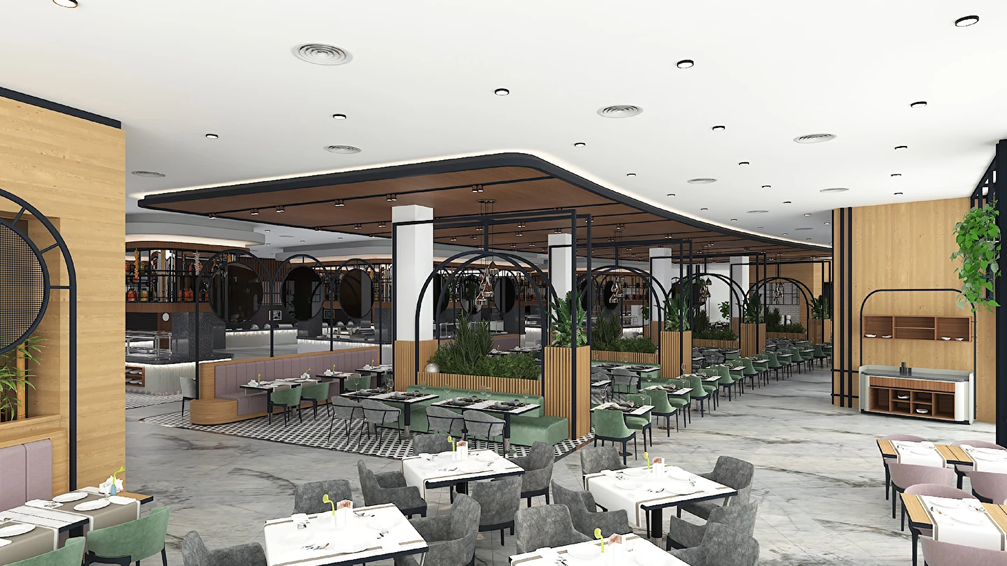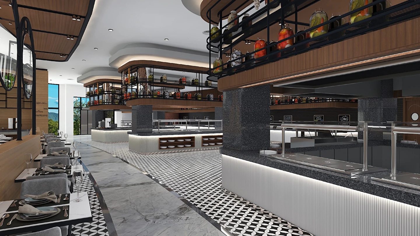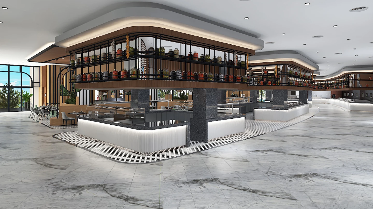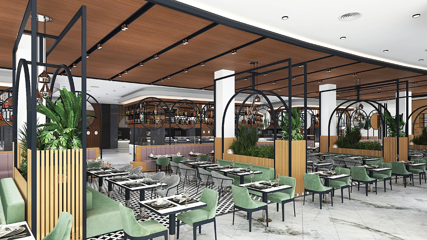 Sabah kahvaltısı, öğle ve akşam yemekleri açık büfe olup tesisin belirlemiş olduğu markalar dahilinde 24 saat ücretsizdir. Kahvaltıda taze sıkılmış portakal suyu ana restoranda sunulmaktadır.