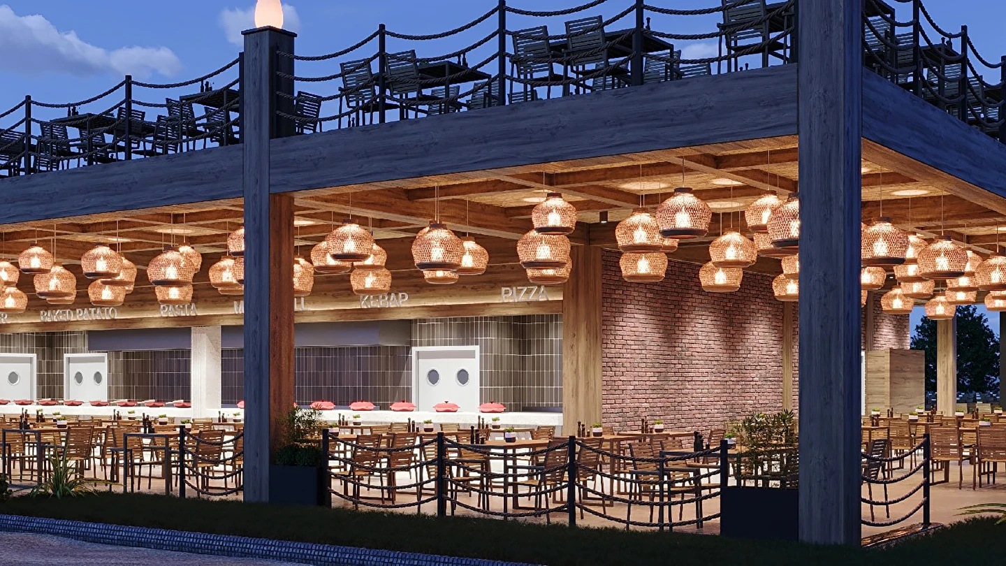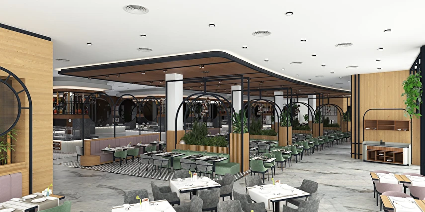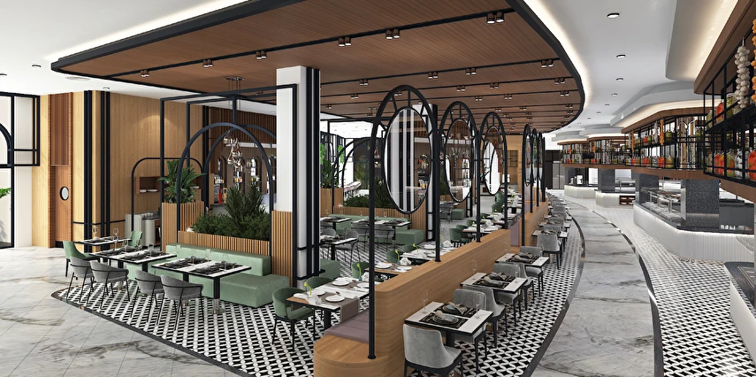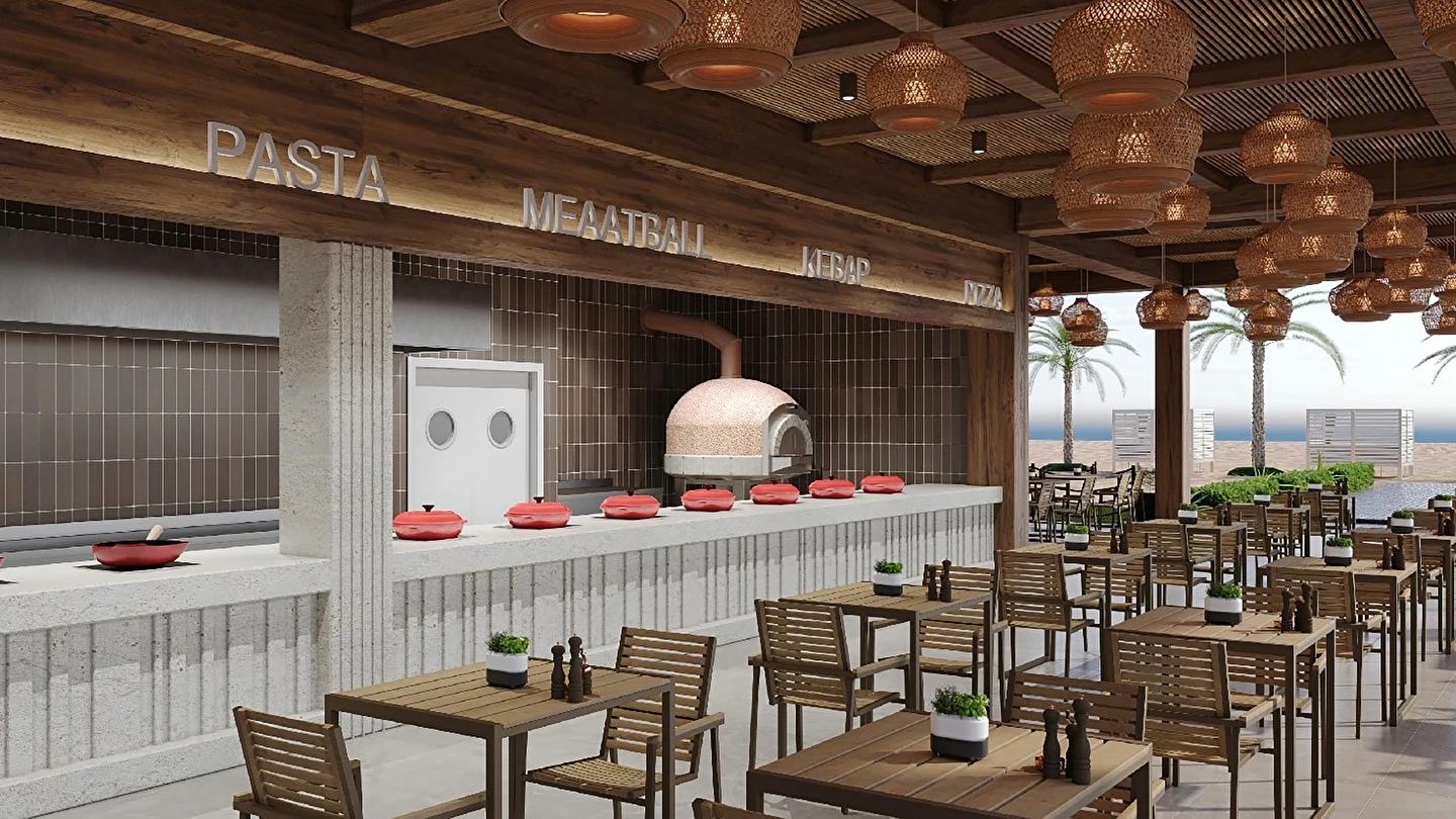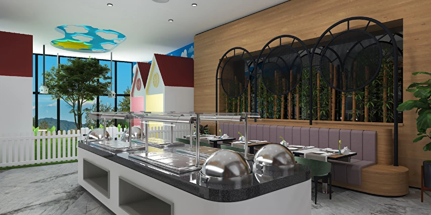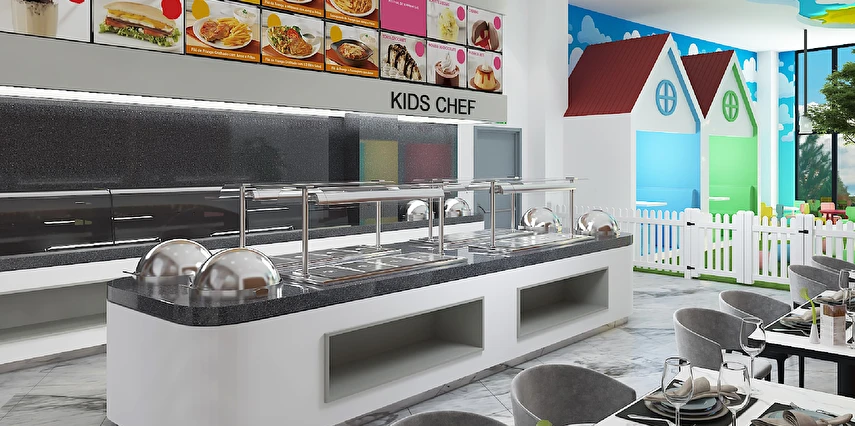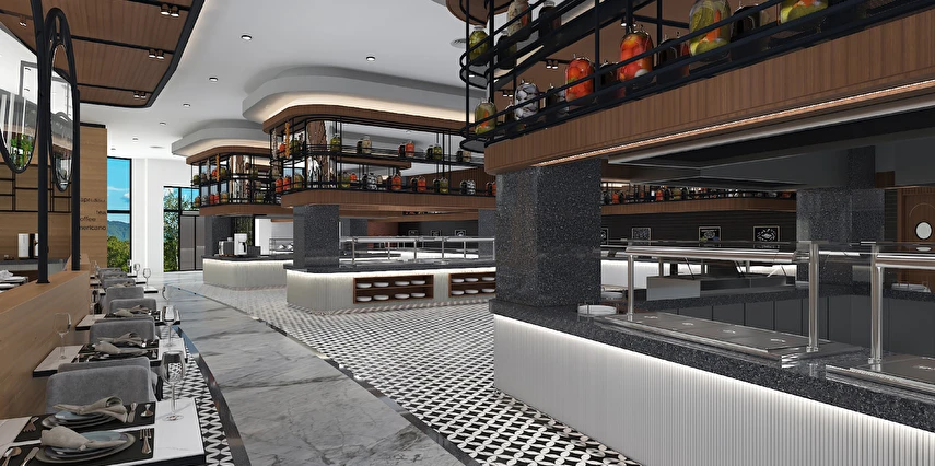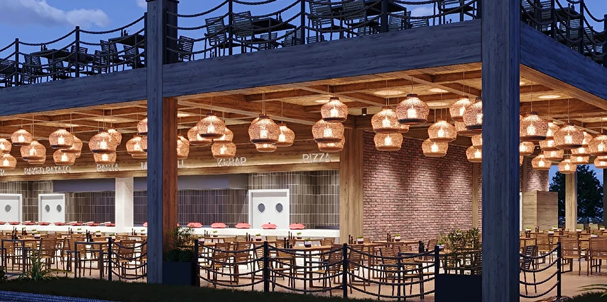 Sabah kahvaltısı, öğle ve akşam yemekleri açık büfe olup tesisin belirlemiş olduğu markalar dahilinde 24 saat ücretsizdir. Kahvaltıda taze sıkılmış portakal suyu ana restoranda sunulmaktadır.