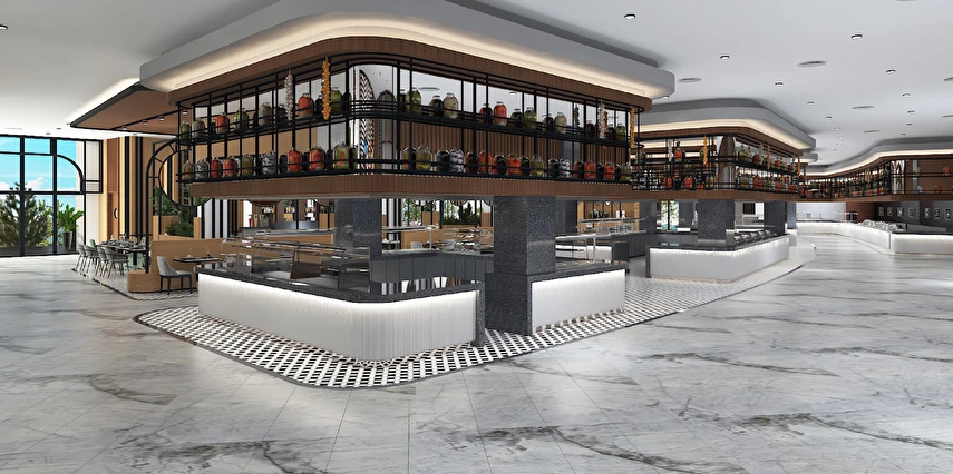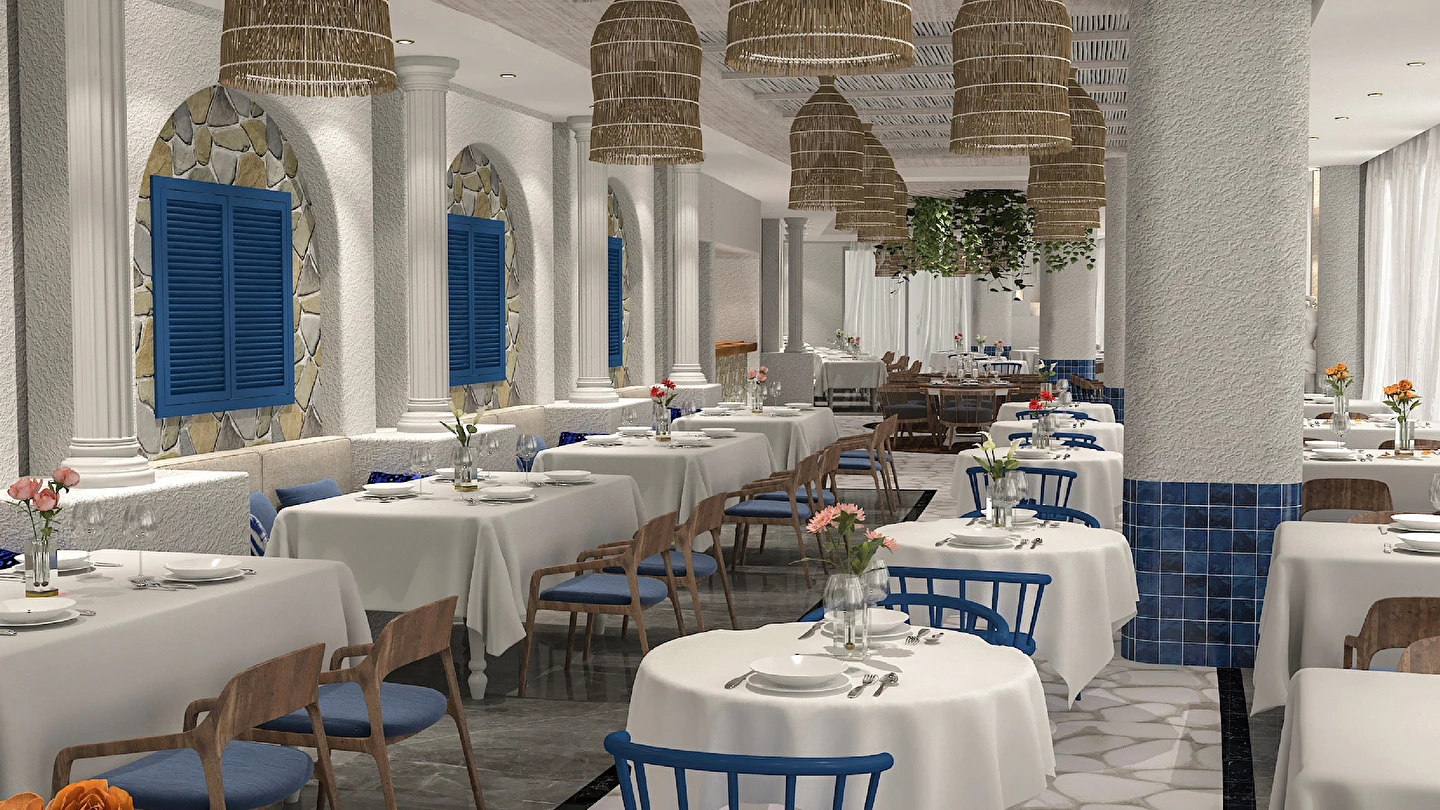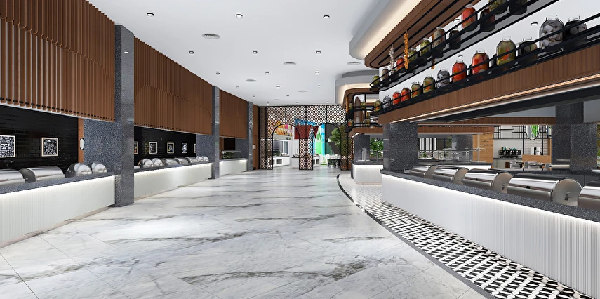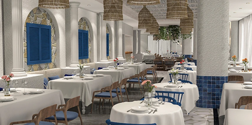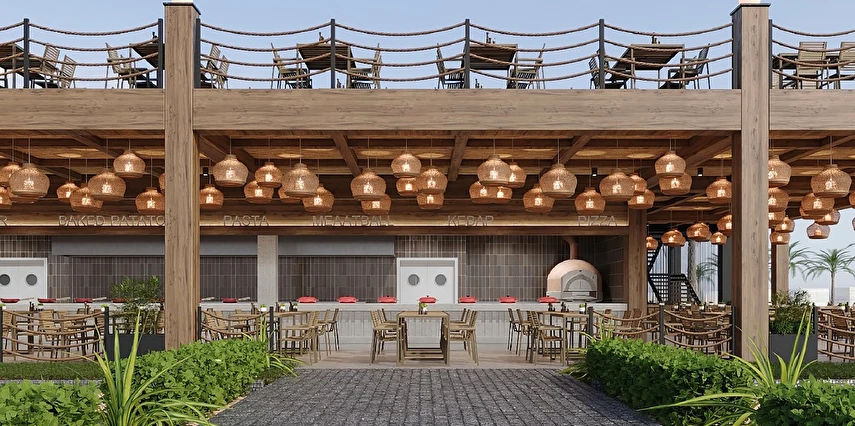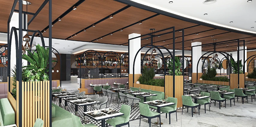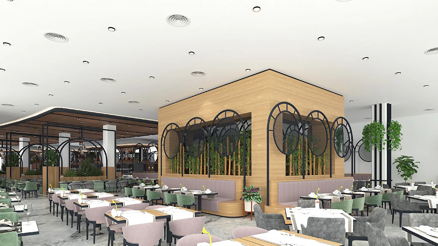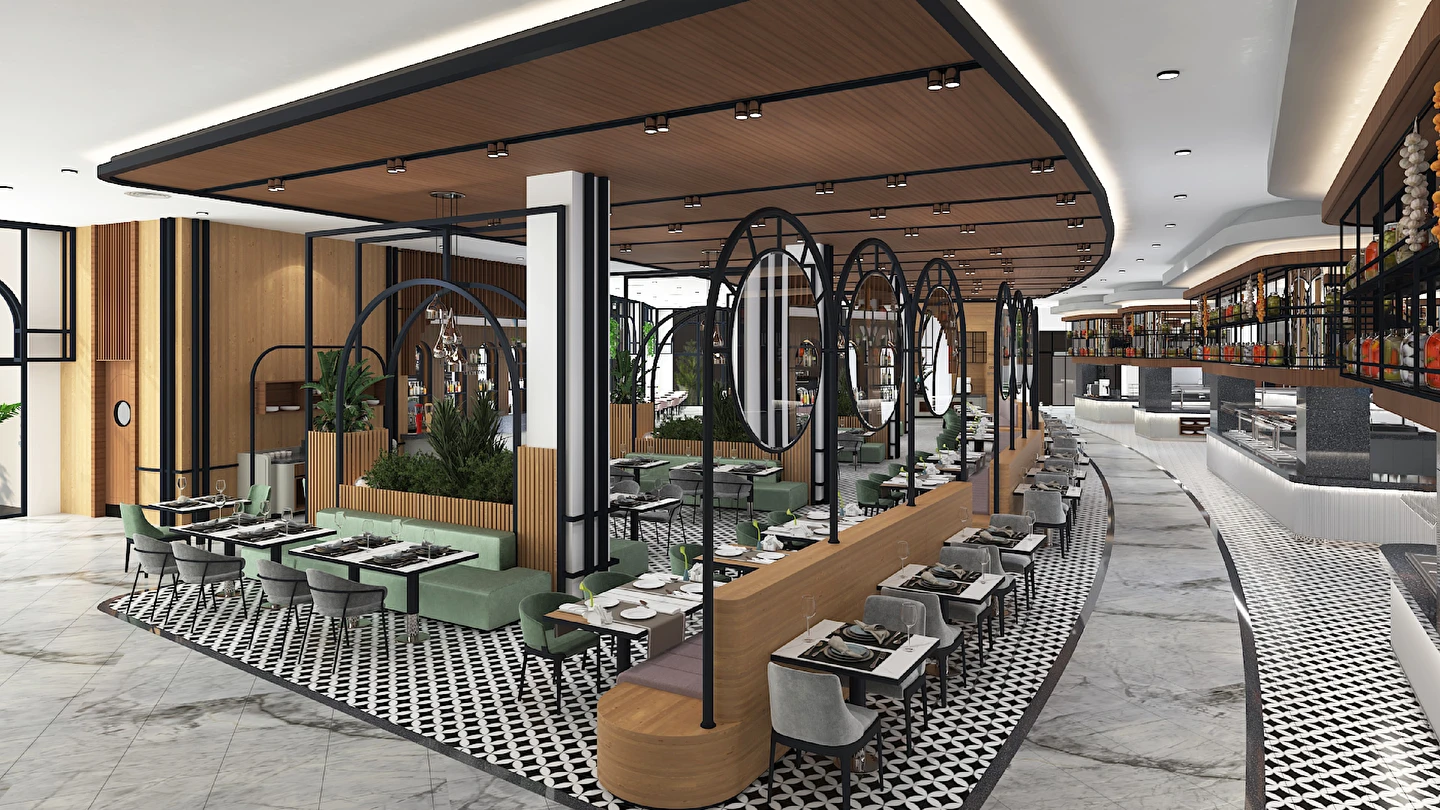 Sabah kahvaltısı, öğle ve akşam yemekleri açık büfe olup tesisin belirlemiş olduğu markalar dahilinde 24 saat ücretsizdir. Kahvaltıda taze sıkılmış portakal suyu ana restoranda sunulmaktadır.