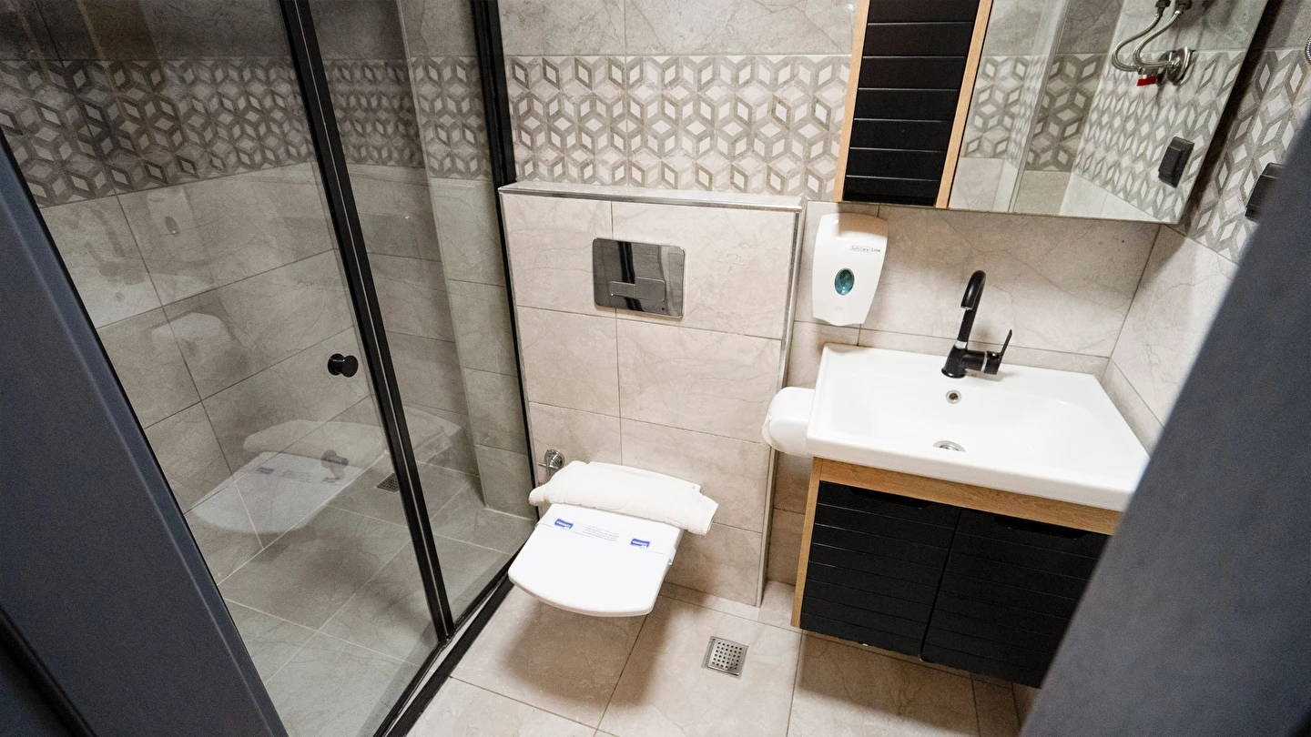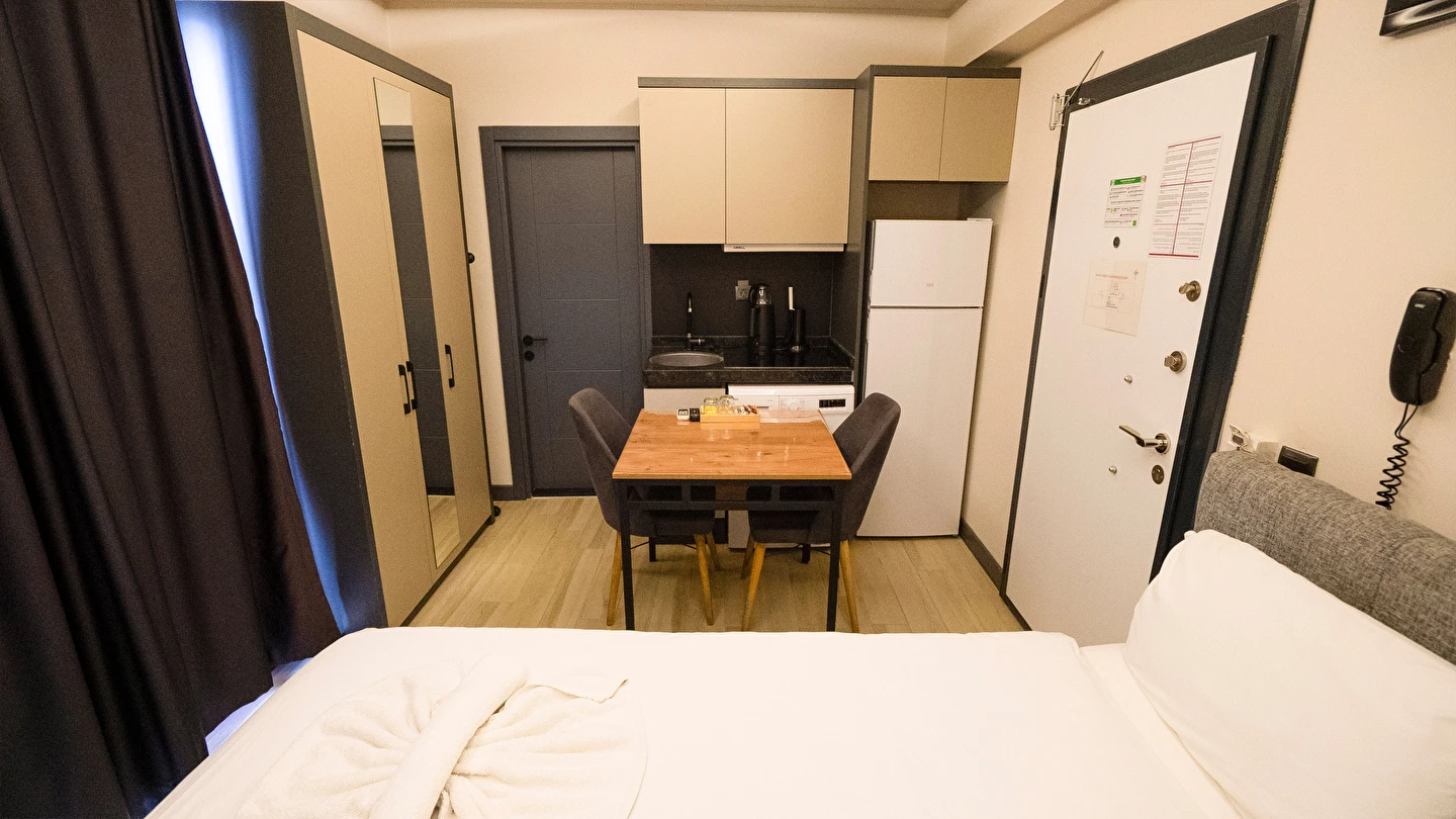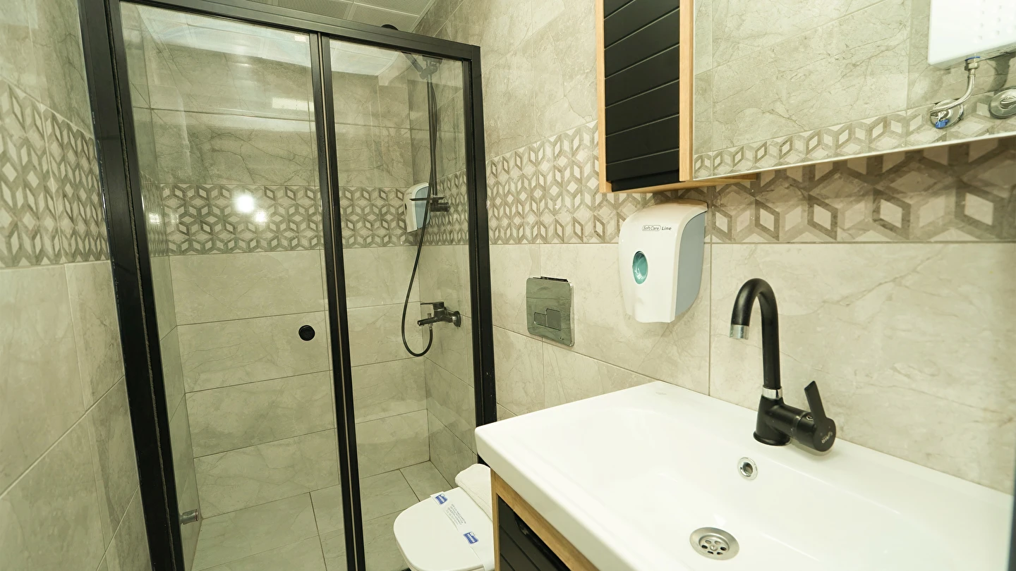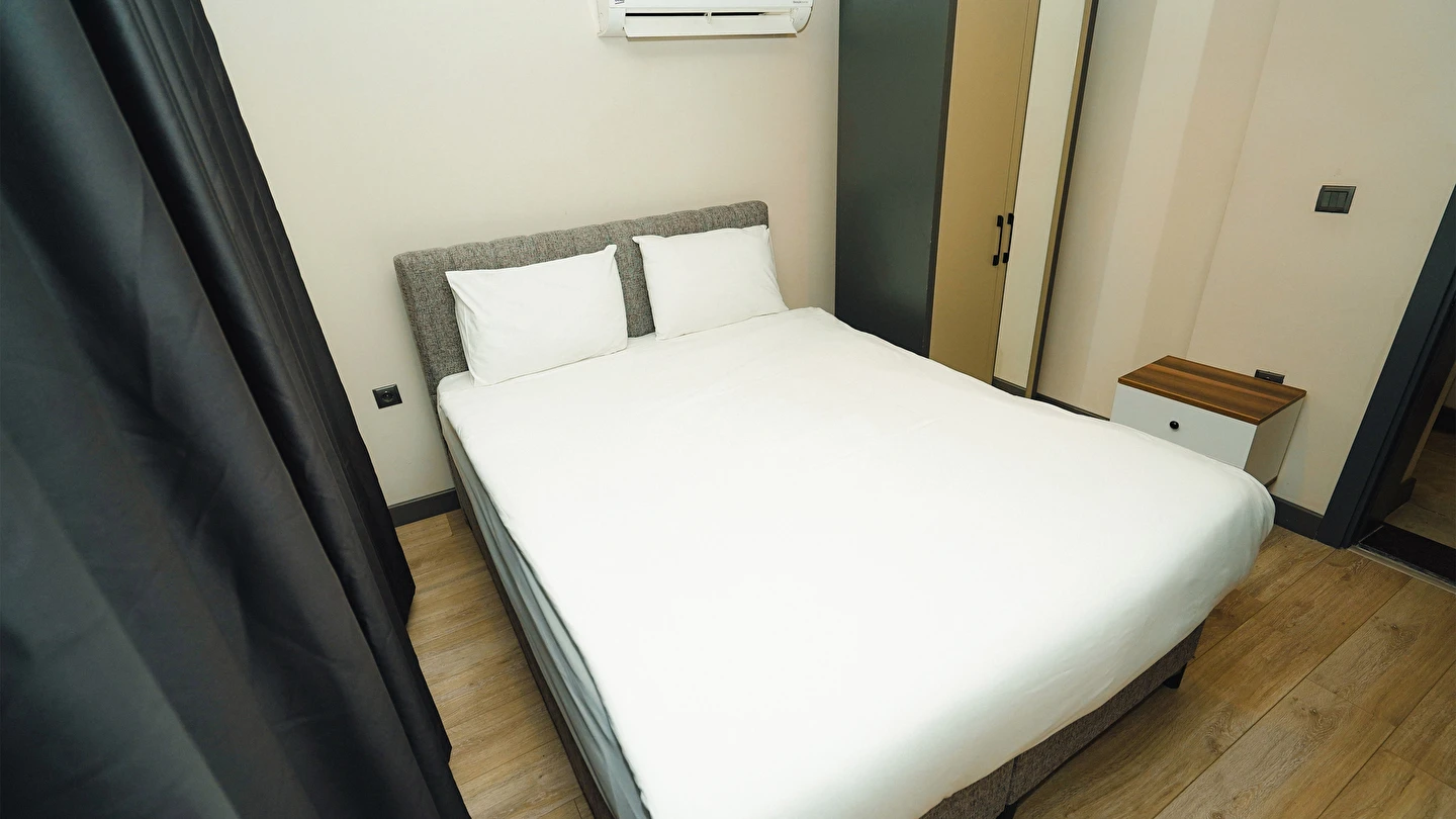Odalarımız özel olarak Temmuz 2023'te inşa edilmiş ısı ve ses izolasyonuna sahip, asansörlü, 7/24 güvenlik, resepsiyon ve günlük oda temizliği hizmeti veren residence binamız içerisinde bulunmaktadır.