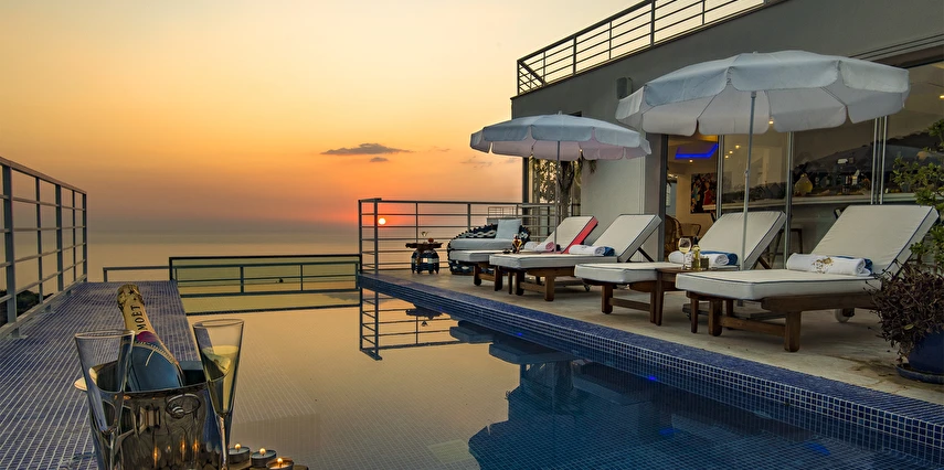 Sonsuzluk havuzunun içerisinde gün batımı, Özel dizeyn baliden gelen koltuklarımız, Begonville süslü bahçelerimiz...