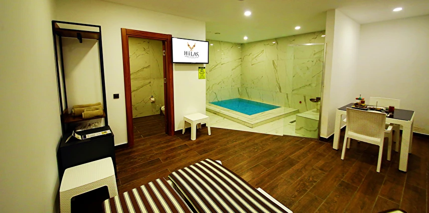 Mitolojide su perisi anlamına gelen ve nehirde peri kızlarıyla birlikte hayatını sürdüren mitolojik bir kahramandan adını alan Hilas, suyun tüm mucizelerini sizlerle buluşturuyor. Güzellik suyu olarak adlandırılan bu termal su, hastalıklara şifa oluyor, vücudunuzu dinlendiriyor ve yenilenmenizi sağlıyor. Otelimizde kadınlar ve erkekler için ayrı ayrı tahsis edilmiş olan saunalar, termal havuzlar, spa ve hamamlar bulunuyor. Sabit 36 derece olan termal su, tüm bu konforla birleşiyor ve sizlere unutamayacağınız bir keyif sunuyor. Ayrıca 60 odalı otelimizin her bir odasında, lobi katında bulunan özel banyolarda ve bu banyoların içinde yer alan ufak termal havuzlarda da güzellik suyunun şifası sizlerle olmaya devam ediyor.