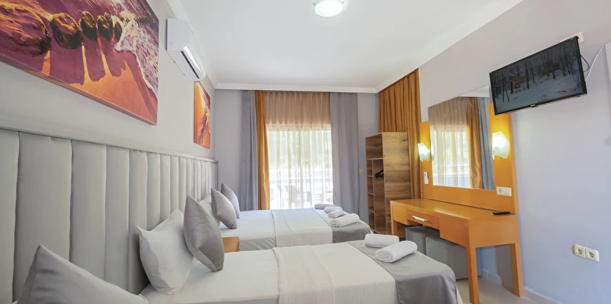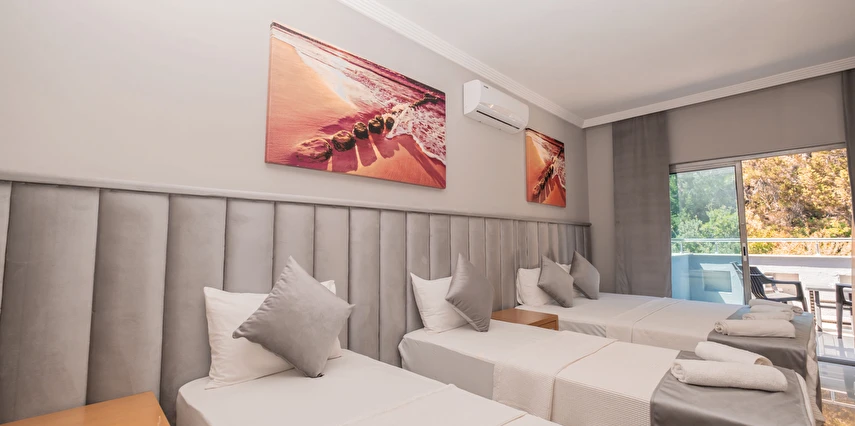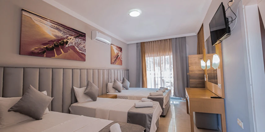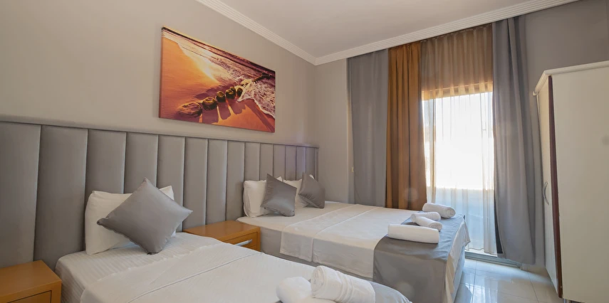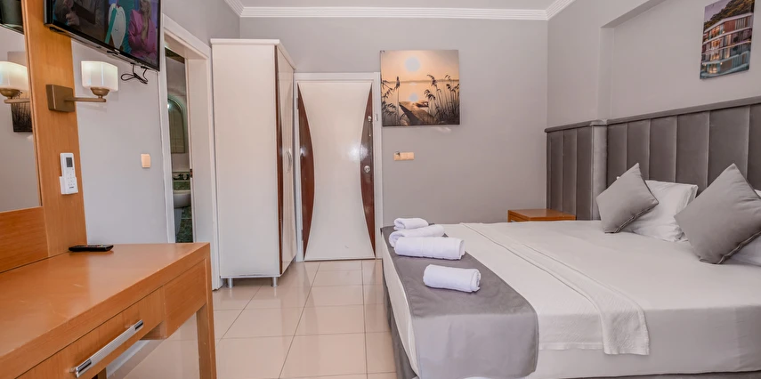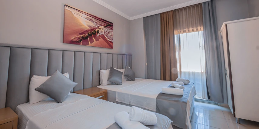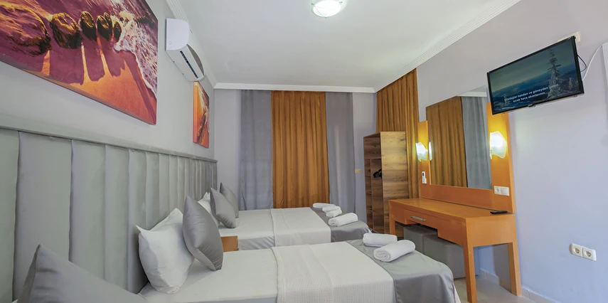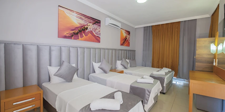 Modern ve sade bir anlayışla dekore edilmiş odalar, misafirlerin konforu düşünülerek tasarlanmıştır. Odalarda klima, televizyon, minibar, ücretsiz Wi-Fi ve özel banyo gibi temel ihtiyaçlar yer almakta; bazı odalar balkonlu yapısıyla Kemer’in keyifli havasını yaşama imkânı sunmaktadır. Farklı kişi kapasitelerine uygun oda seçenekleri sayesinde çiftler, arkadaş grupları ve aileler için uygundur.