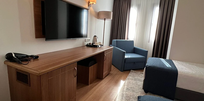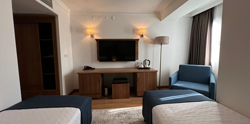 Daha Fazla GösterŞehrin tam merkezinde yer alan otel, Ege Denizi’ne hakim bir konumuyla muhteşem manzaraya göz kırpar.İş ve alışveriş merkezleri ile fuar alanlarına yürüme mesafesindedir. Kentin sık ve zarif yerleşim alanında, sıra sıra bar ve restoranların bulunduğu yerdedir. Odalarda, özel banyo, kablolu TV, çay-kahve, ücretsiz Wi-Fi ve klimalı bulunmaktadır.Odalarımız gerek iş, gerekse eğlence amaçlı seyahat eden misafirlerin tüm ihtiyaçlarını karşılayacak şekilde düzenlenmiştir.