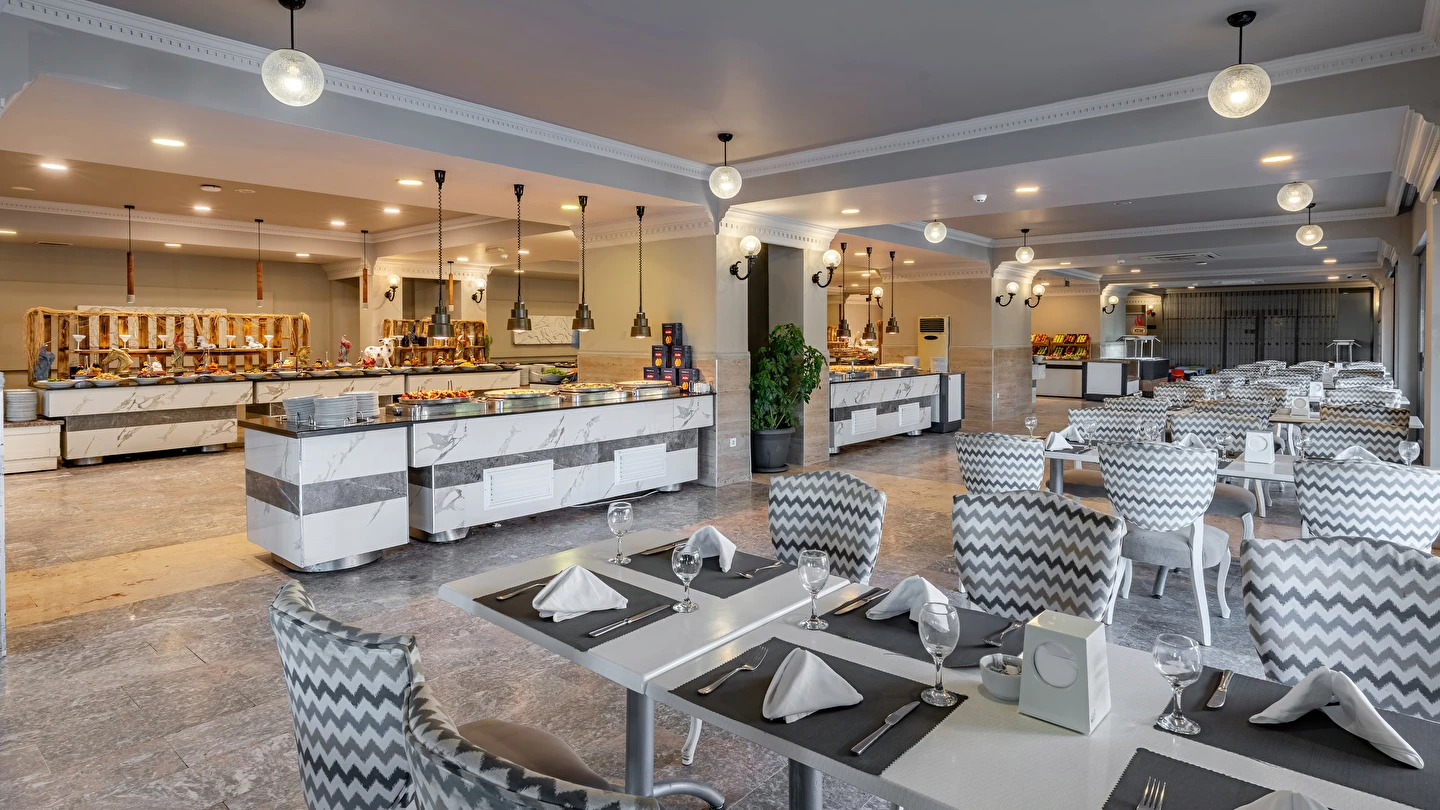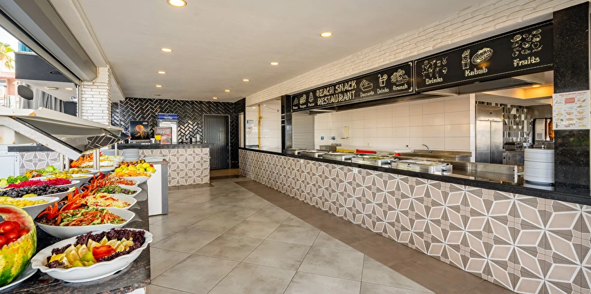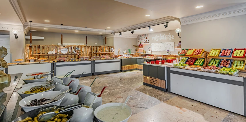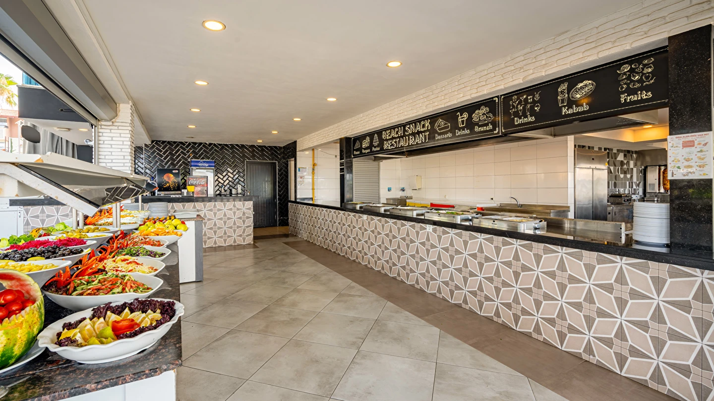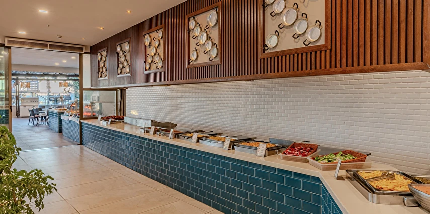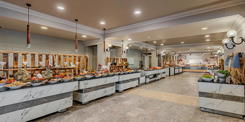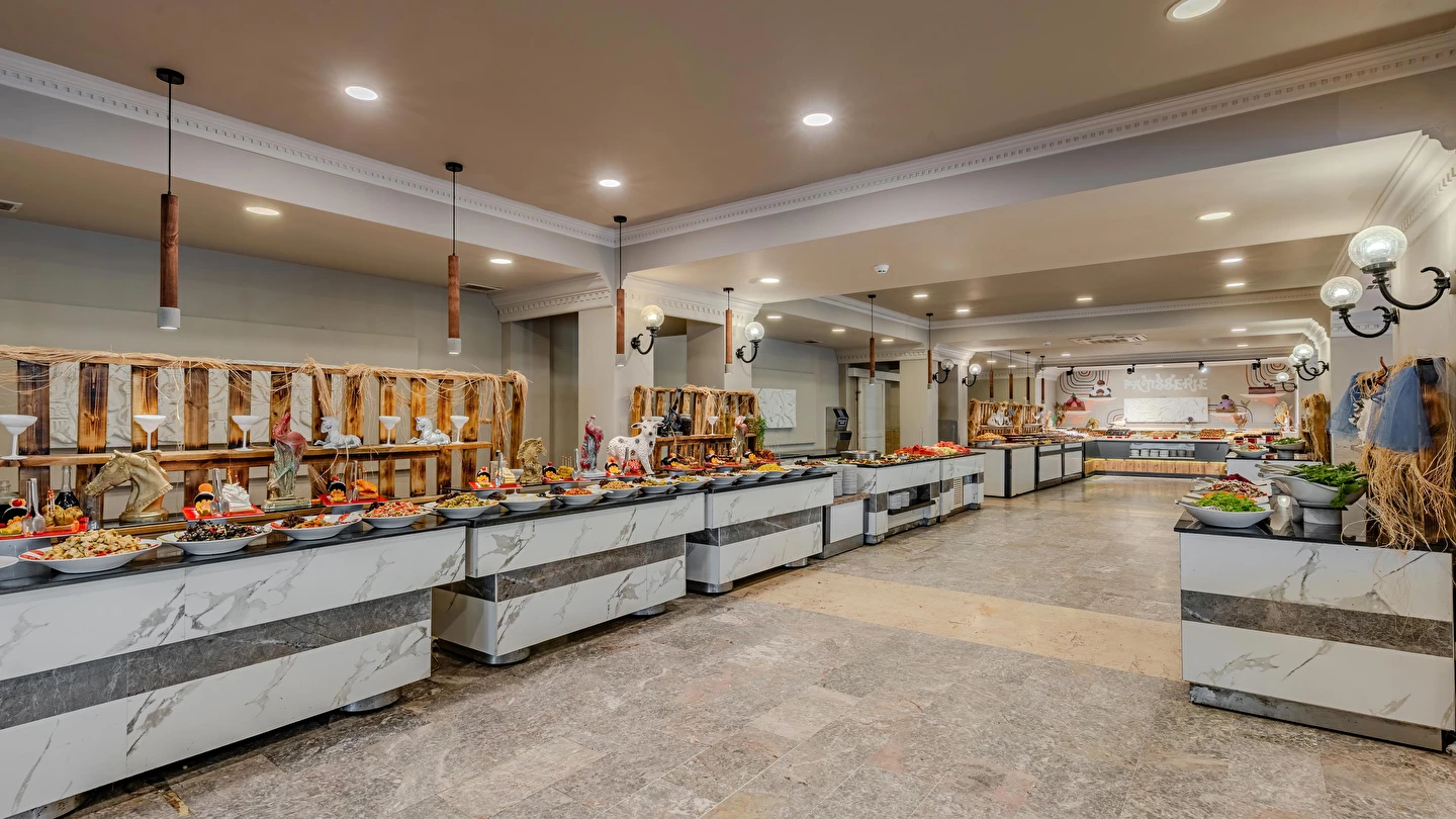 Sabah kahvaltısı, öğle ve akşam yemekleri açık büfe olup tesisin belirlemiş olduğu markalar dahilinde yerli alkollü ve alkolsüz içecekler 10:00 ile 24:00 saatleri arasında ücretsizdir. Taze sıkışmış meyve suları ve ithal içecekler ücretlidir.