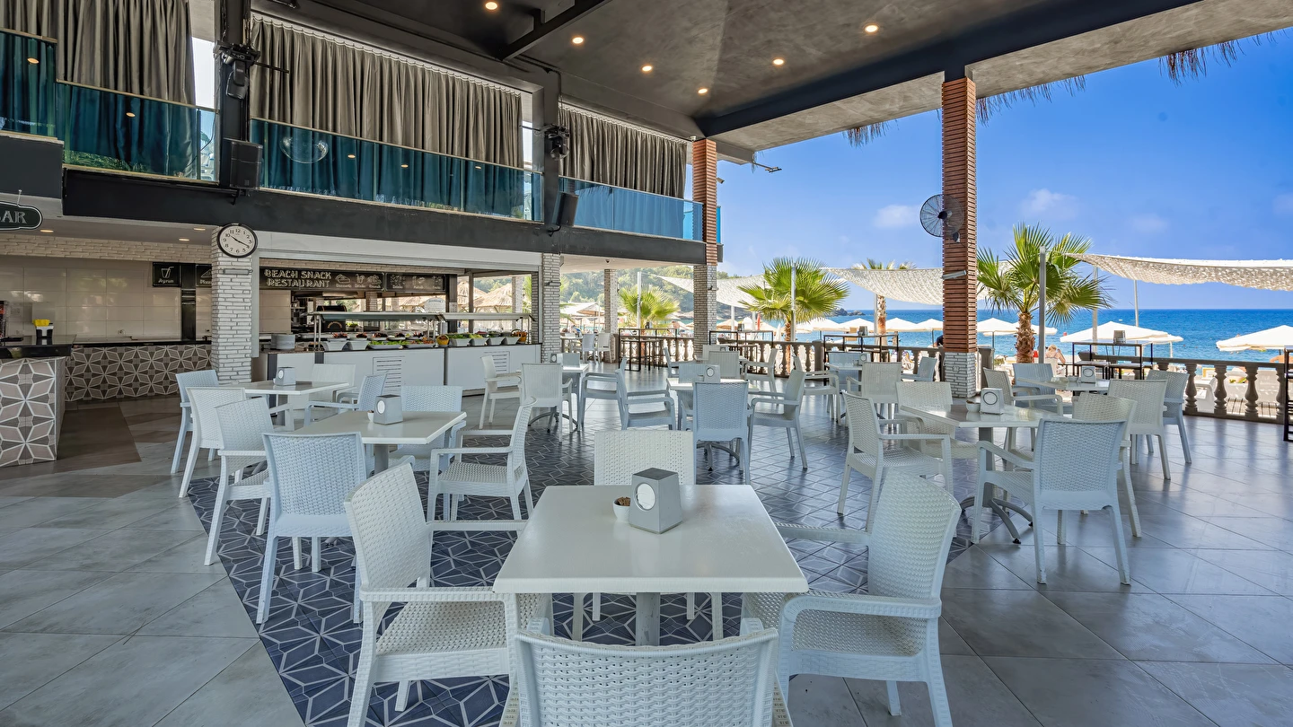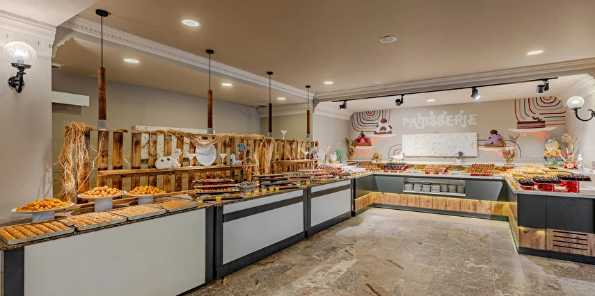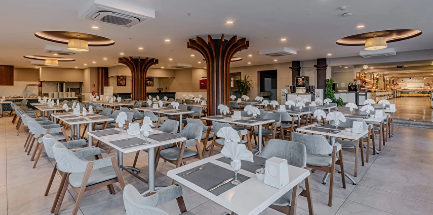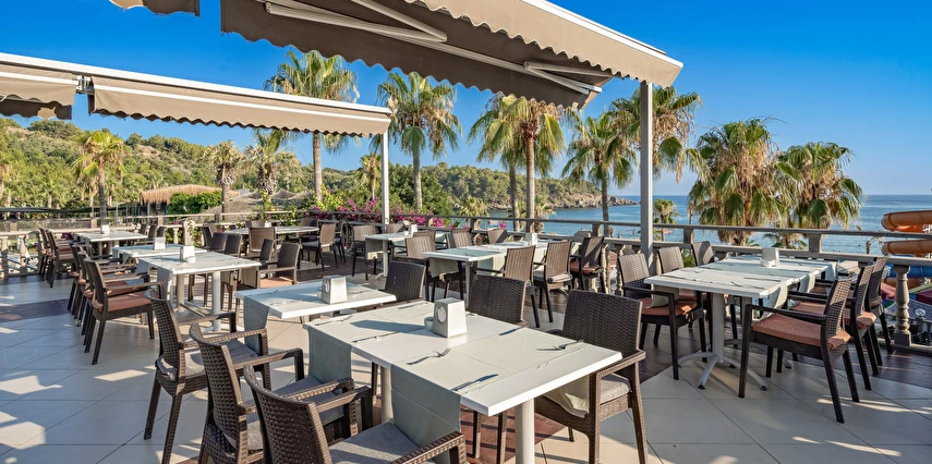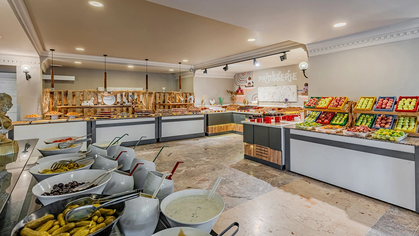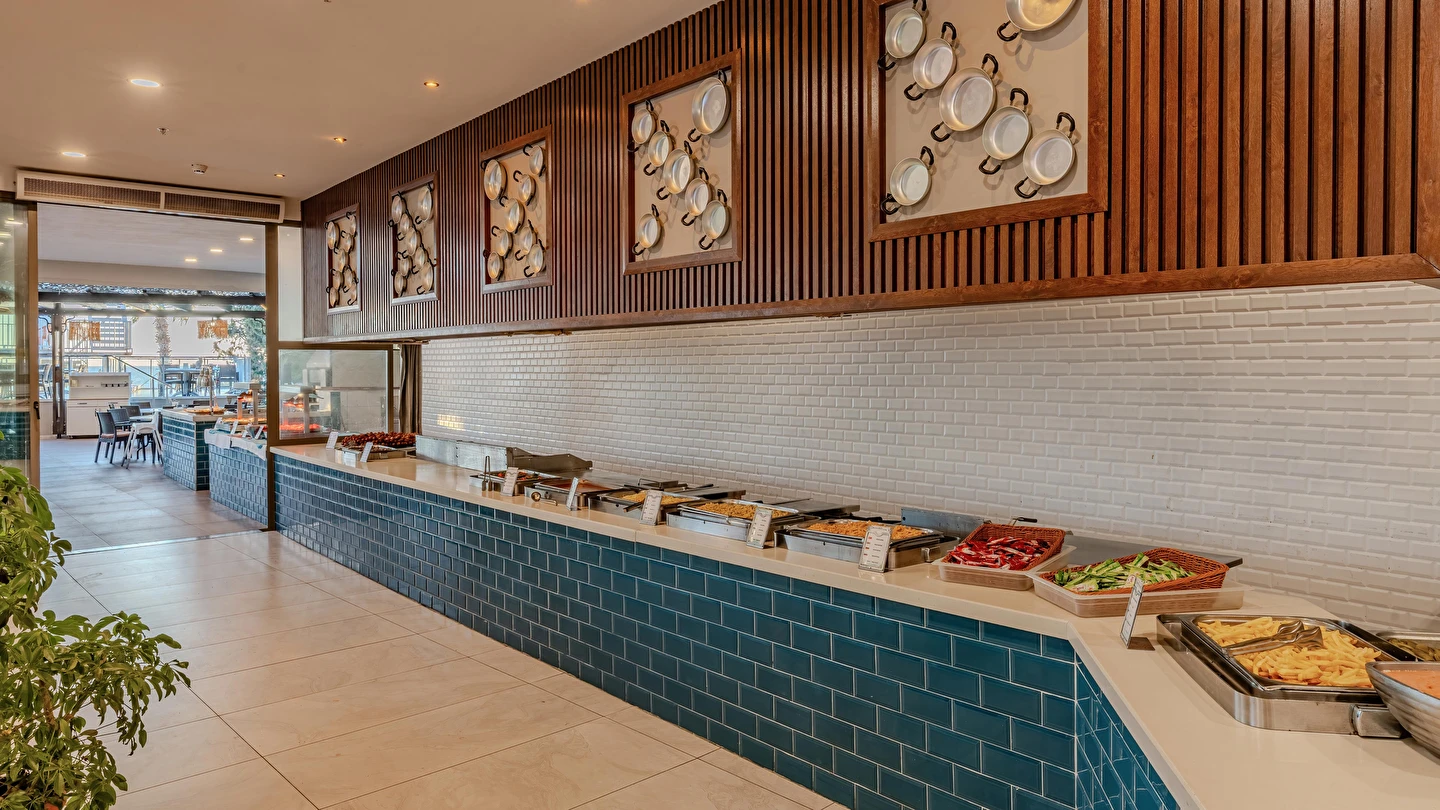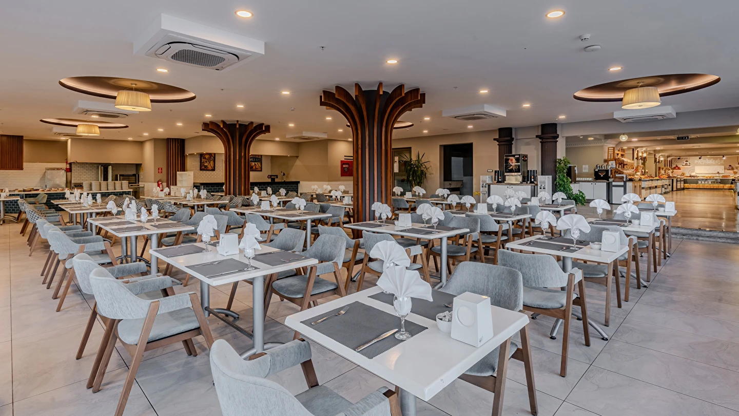 Sabah kahvaltısı, öğle ve akşam yemekleri açık büfe olup tesisin belirlemiş olduğu markalar dahilinde yerli alkollü ve alkolsüz içecekler 10:00 ile 24:00 saatleri arasında ücretsizdir. Taze sıkışmış meyve suları ve ithal içecekler ücretlidir.