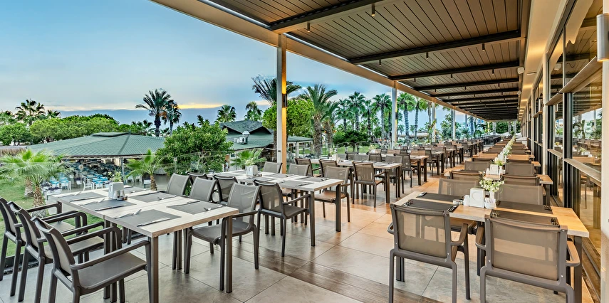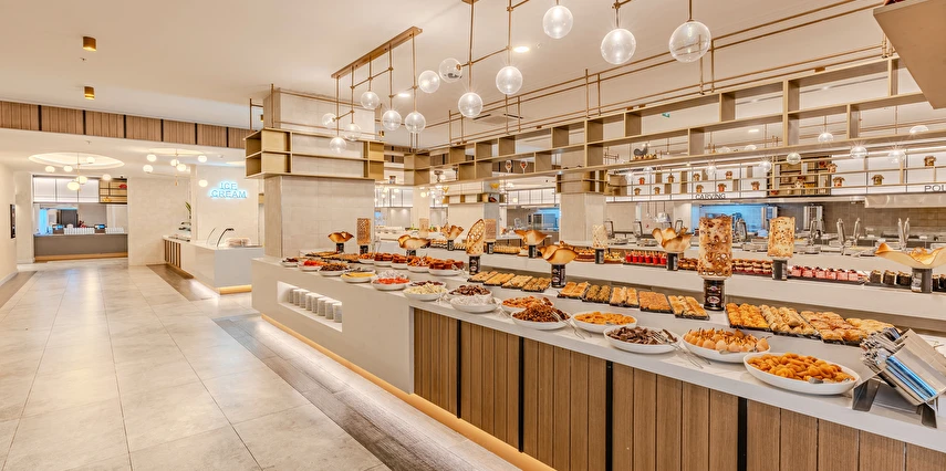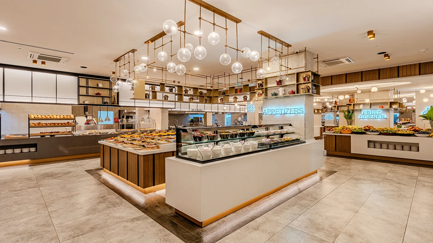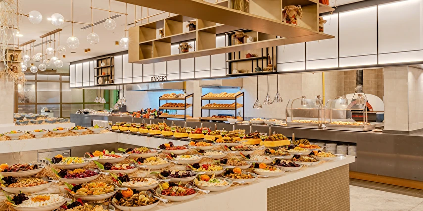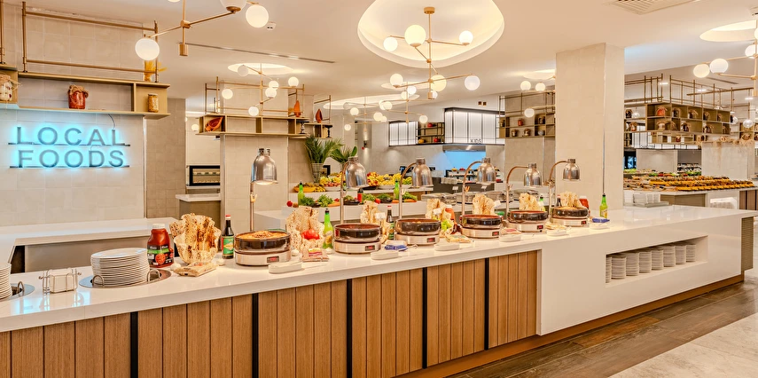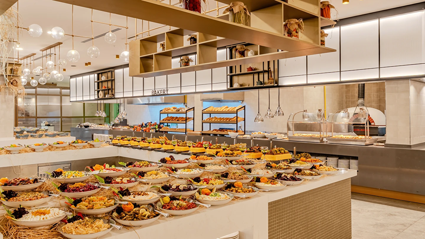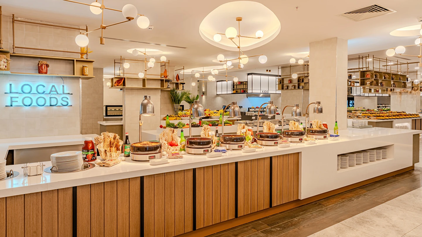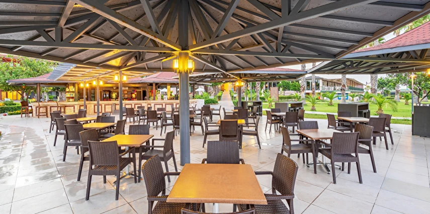 Sabah kahvaltısı, öğle ve akşam yemekleri açık büfe olup tesisin belirlemiş olduğu markalar dahilinde yerli alkollü ve alkolsüz içecekler 24 saat ücretsizdir. Tüm barlarda ve restoranlarda taze sıkılmış meyve suları ücretlidir.