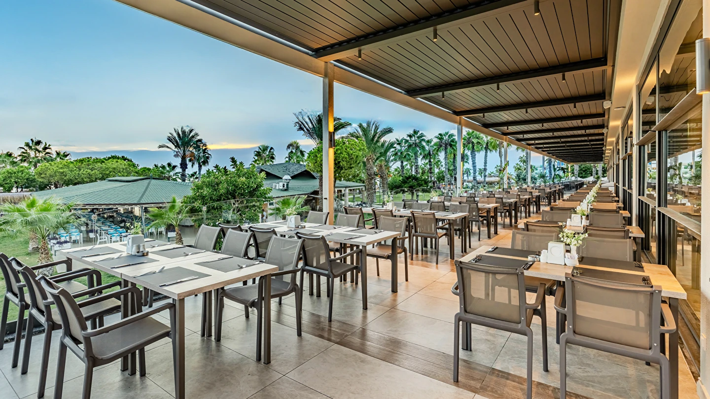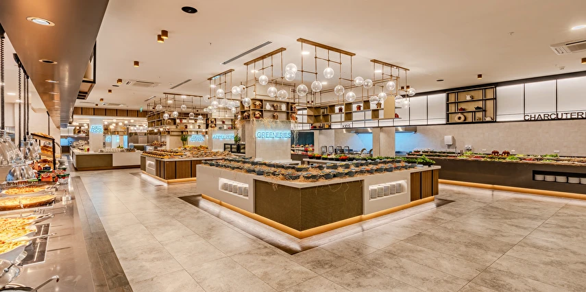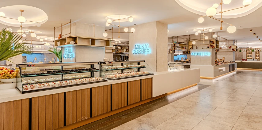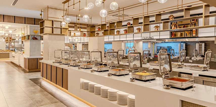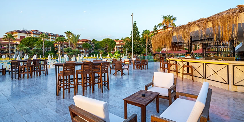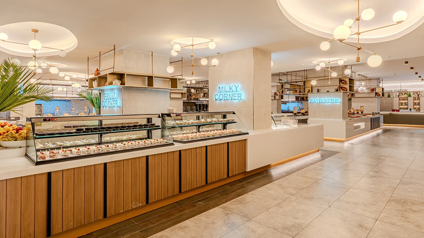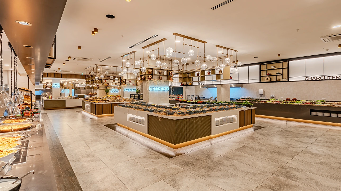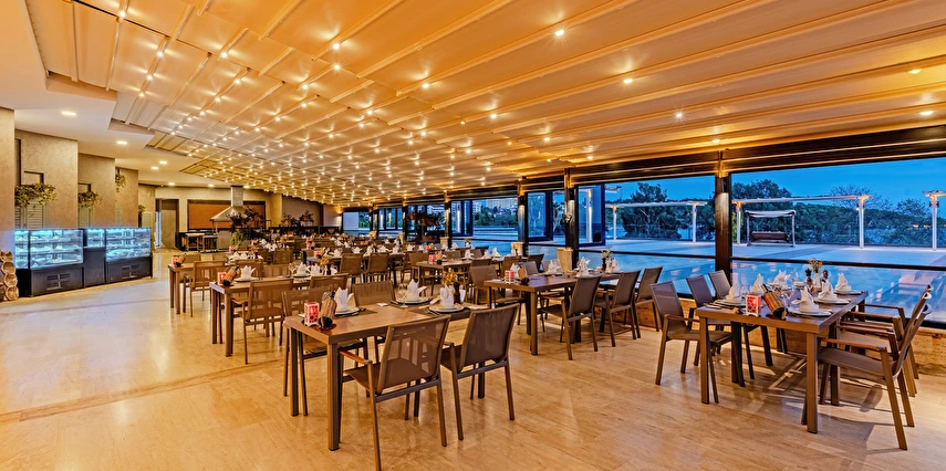 Sabah kahvaltısı, öğle ve akşam yemekleri açık büfe olup tesisin belirlemiş olduğu markalar dahilinde yerli alkollü ve alkolsüz içecekler 24 saat ücretsizdir. Tüm barlarda ve restoranlarda taze sıkılmış meyve suları ücretlidir.