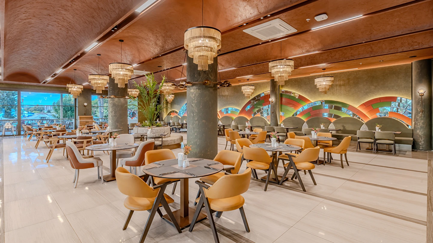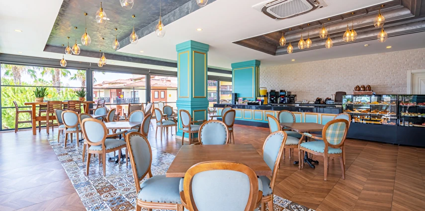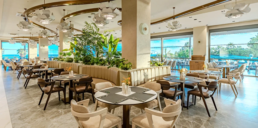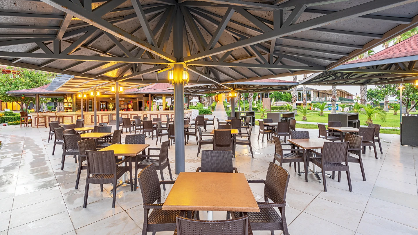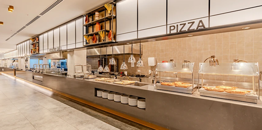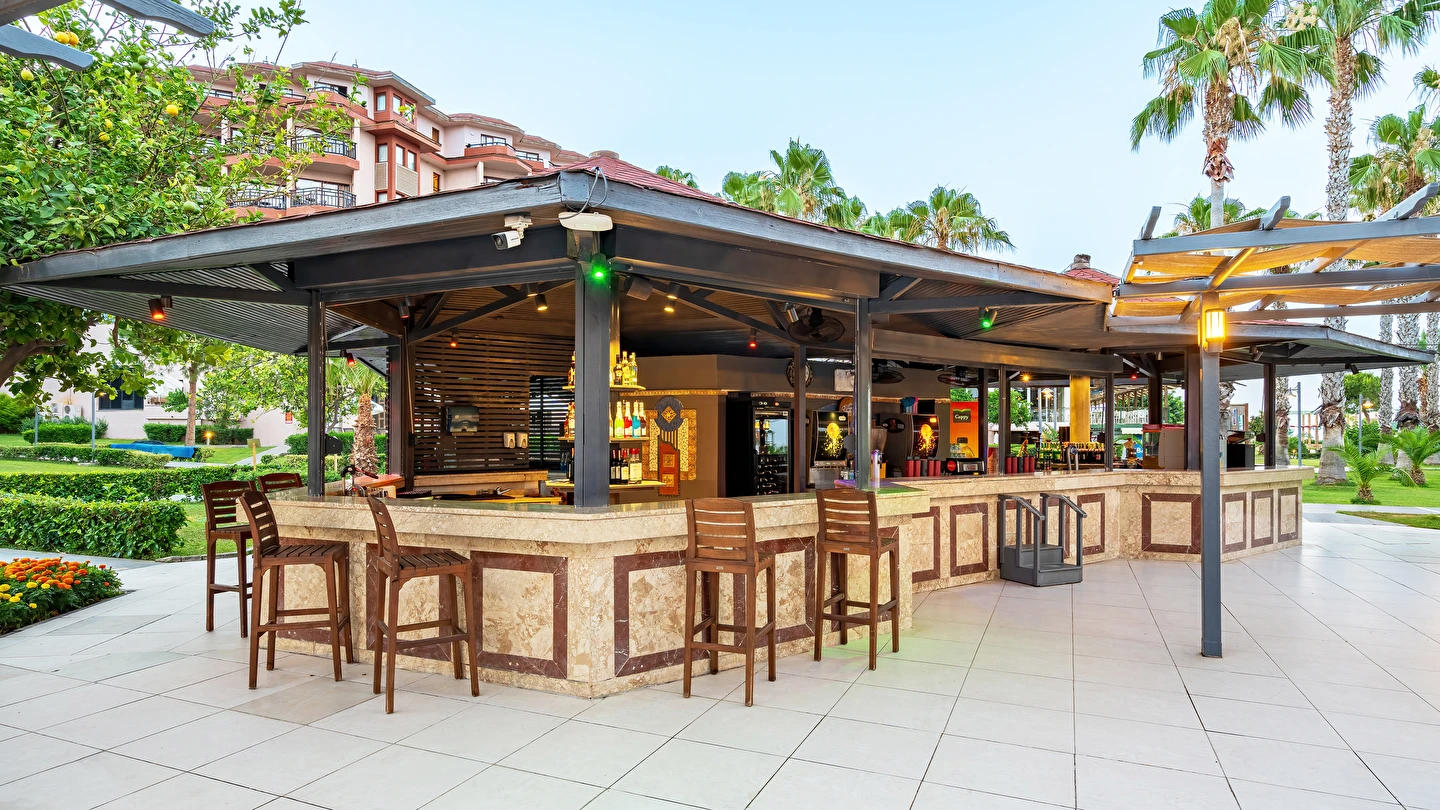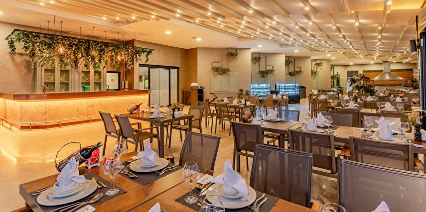 Sabah kahvaltısı, öğle ve akşam yemekleri açık büfe olup tesisin belirlemiş olduğu markalar dahilinde yerli alkollü ve alkolsüz içecekler 24 saat ücretsizdir. Tüm barlarda ve restoranlarda taze sıkılmış meyve suları ücretlidir.
