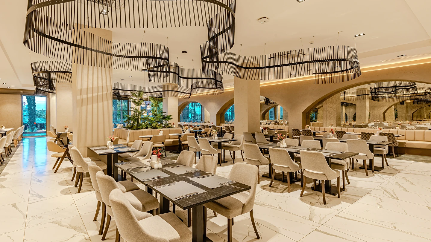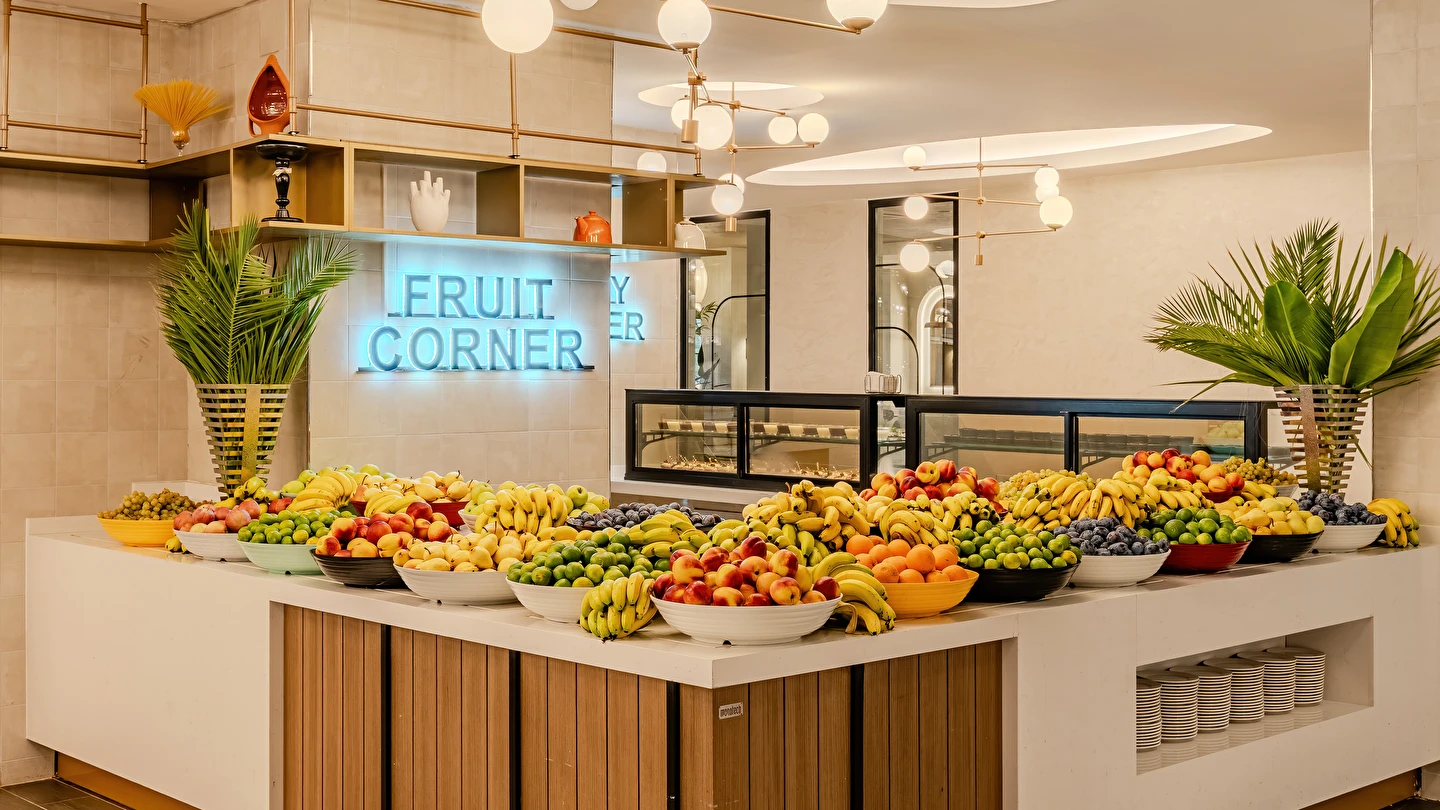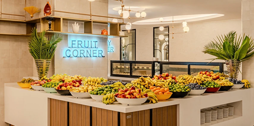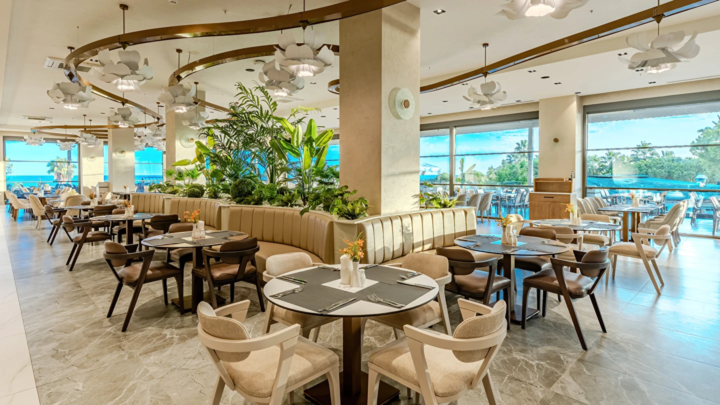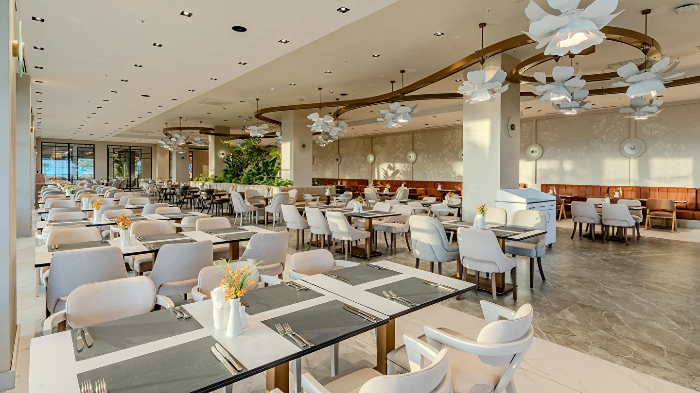 Sabah kahvaltısı, öğle ve akşam yemekleri açık büfe olup tesisin belirlemiş olduğu markalar dahilinde yerli alkollü ve alkolsüz içecekler 24 saat ücretsizdir. Tüm barlarda ve restoranlarda taze sıkılmış meyve suları ücretlidir.