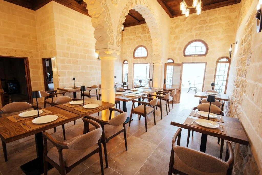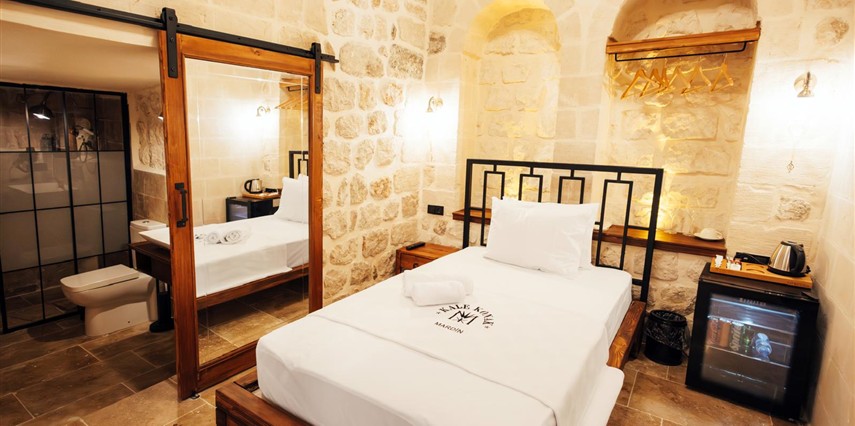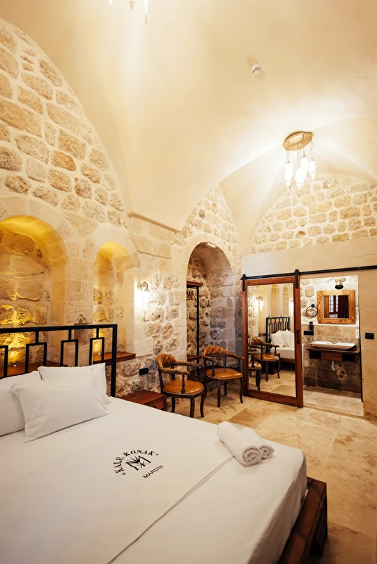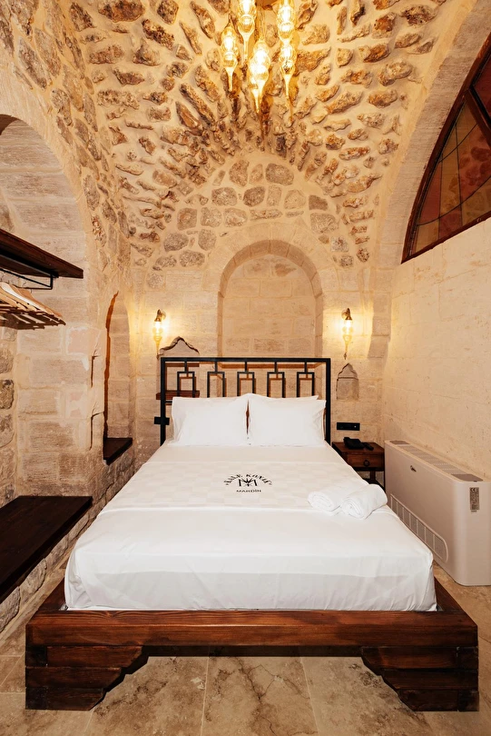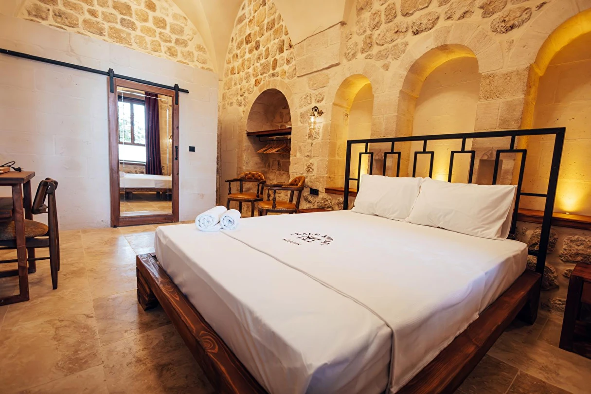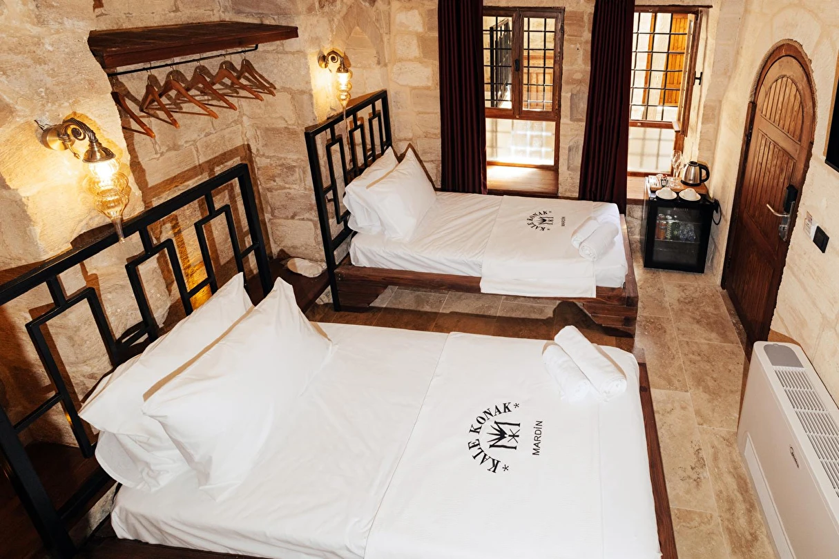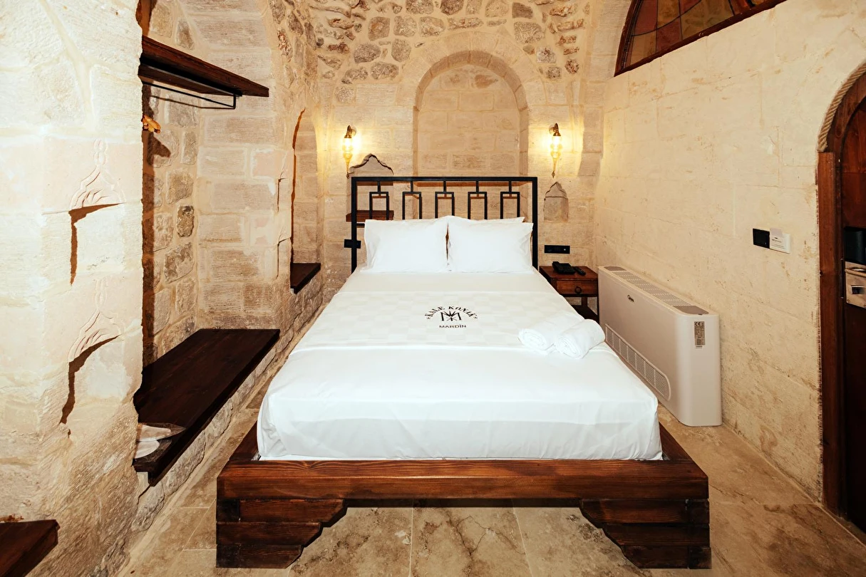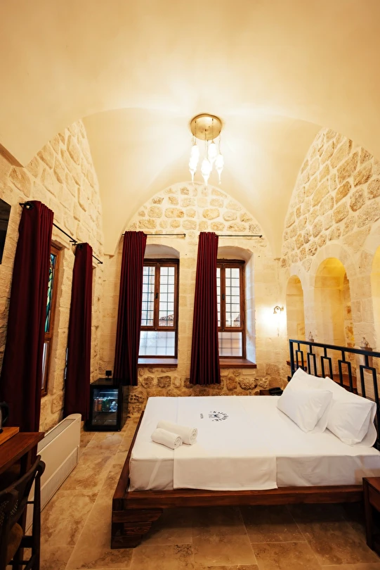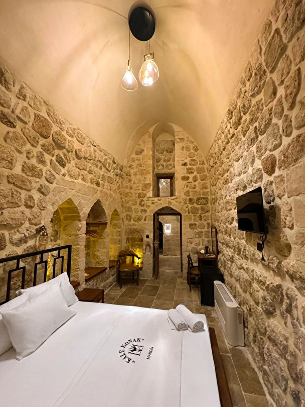 Yüzyıllık taş işçiliğine sahip tarihi konağımızda, geleneksel Mardin mimarisi modern konforla buluşuyor. Sabahları Mezopotamya’ya doğan güneşi izlerken yöresel kahvaltının tadını çıkarabilir, akşamları ise Mardin’in ışıklarıyla bütünleşen büyüleyici atmosferde huzur dolu anlar yaşayabilirsiniz.