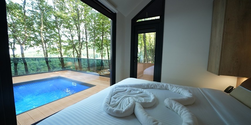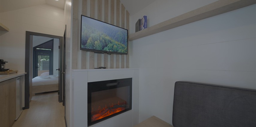 Daha Fazla GösterYemyeşil çam ve Çınar ağaçları arasında bulunan Tiny house ünitelerimiz, siz değerli müşterilerimizin konforlu ve huzurlu bir tatil geçirebilmesi için en ince detaylar ve teknolojik imkanlar ile hazırlanmıştır.Tiny House ünitelerimiz, 2 yetişkin 1 çocuk (10+) için uygundur.Akıllı ev sistemi,yangın alarmı,elektrikli şömine,kablosuz internet,android Tv,ısıtmalı havuz,hem havuz hem yatak odasında kullanılabilir sinevizyon sistemi,kahve makinesi,su ısıtıcı,mini buzdolabı,kasa,yerden ısıtma sistemi ve ısıtmalı 9,5 m2 ısıtmalı havuzu ve manzaralı özel terasları ile kahvaltı dahil konseptte sizlere hizmet vermektedir.