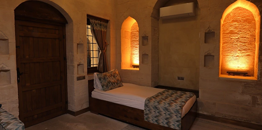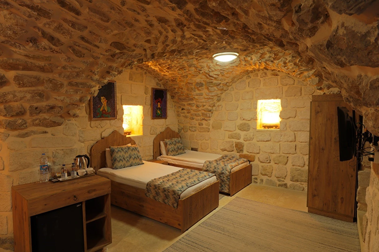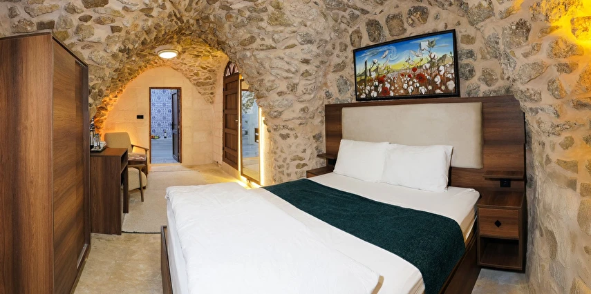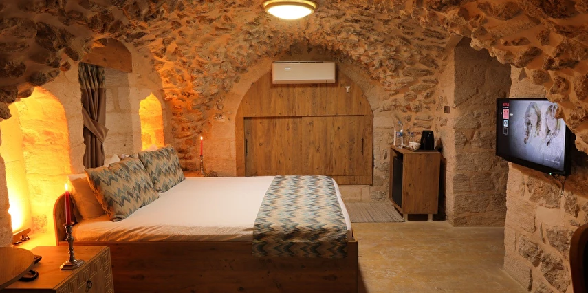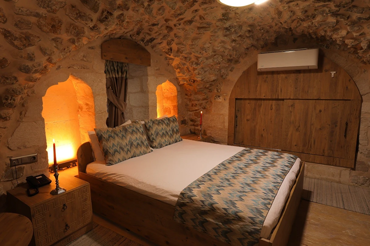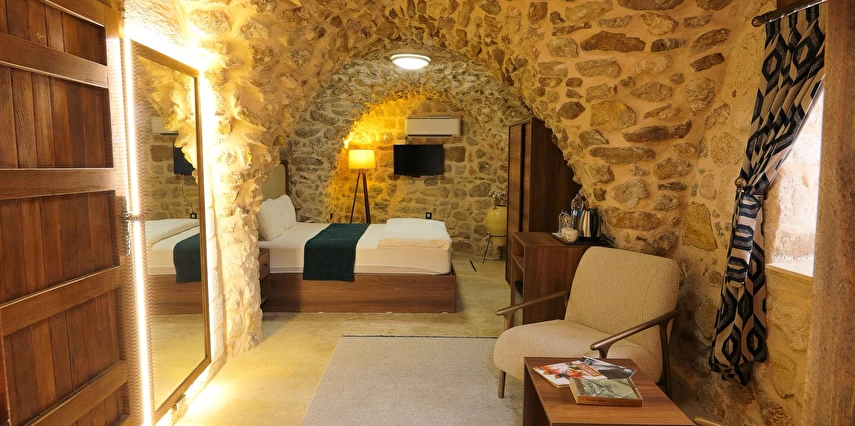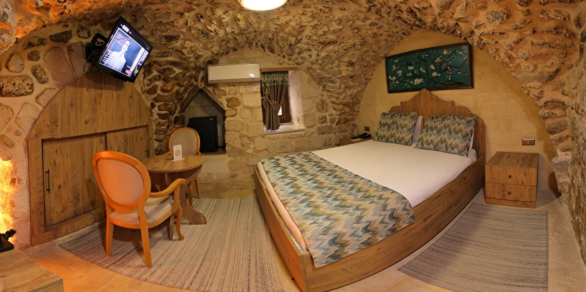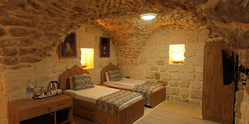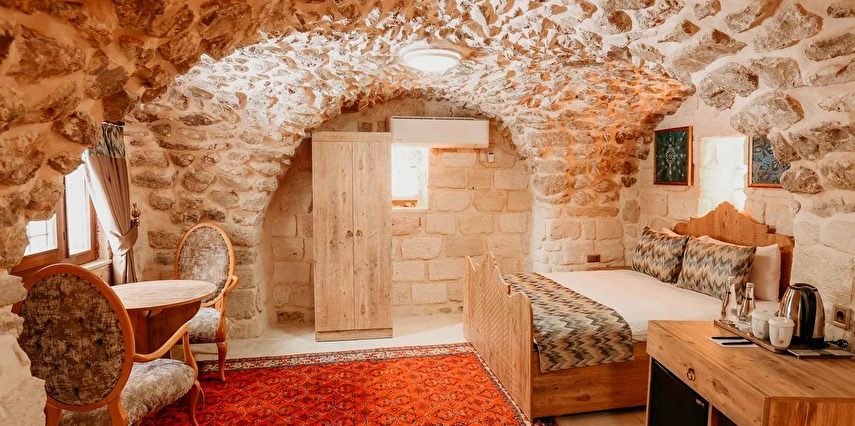 Otelin özenle restore edilmiş taş odaları; klima, ücretsiz Wi-Fi, konforlu yataklar ve özel banyo gibi modern olanaklarla donatılmıştır. Tarihi dokuyu yansıtan dekorasyon, misafirlere Mardin’e özgü otantik bir konaklama deneyimi yaşatırken, sessiz ve huzurlu ortam dinlenmek için idealdir.