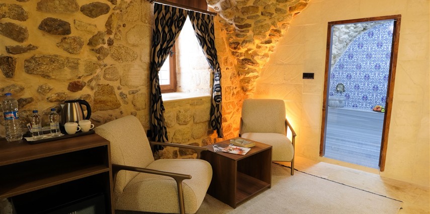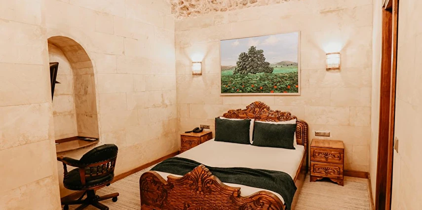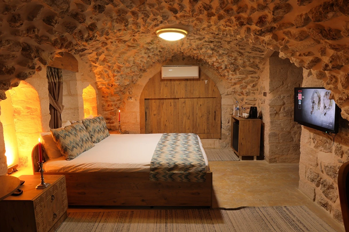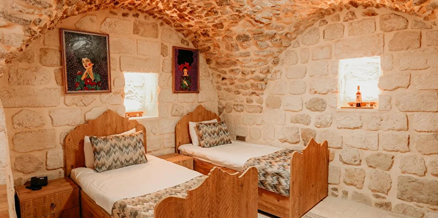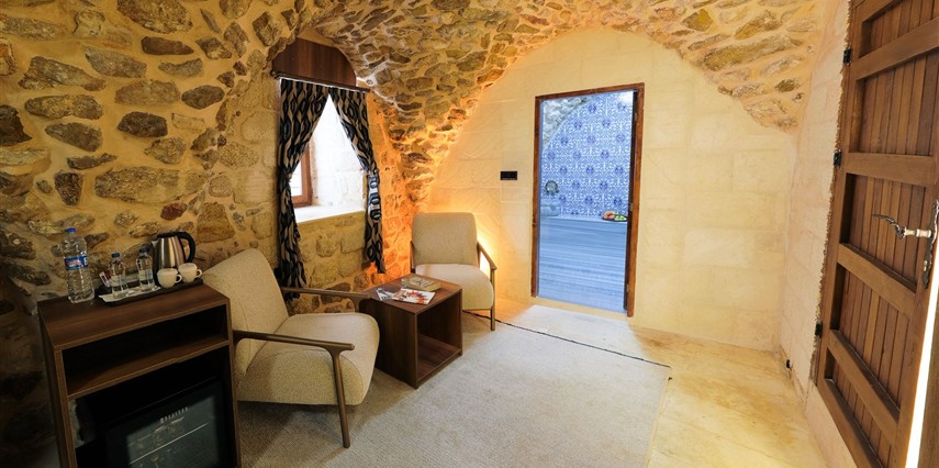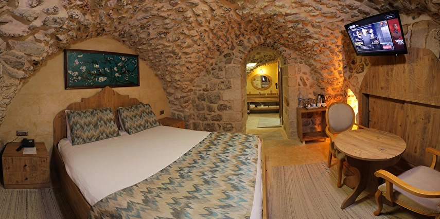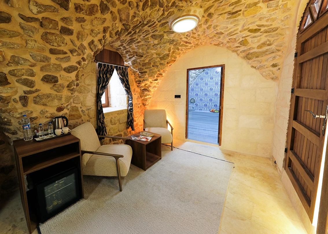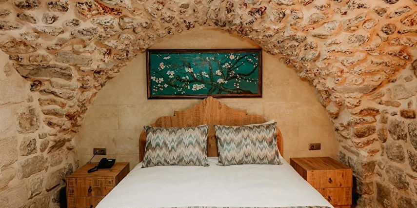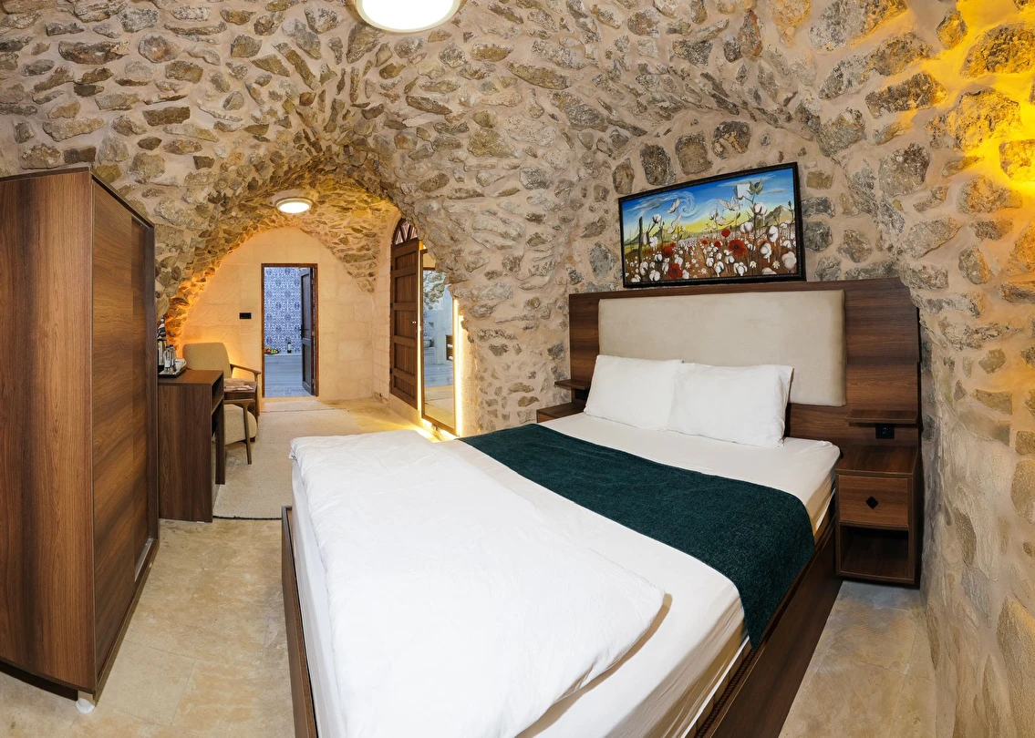 Otelin özenle restore edilmiş taş odaları; klima, ücretsiz Wi-Fi, konforlu yataklar ve özel banyo gibi modern olanaklarla donatılmıştır. Tarihi dokuyu yansıtan dekorasyon, misafirlere Mardin’e özgü otantik bir konaklama deneyimi yaşatırken, sessiz ve huzurlu ortam dinlenmek için idealdir.