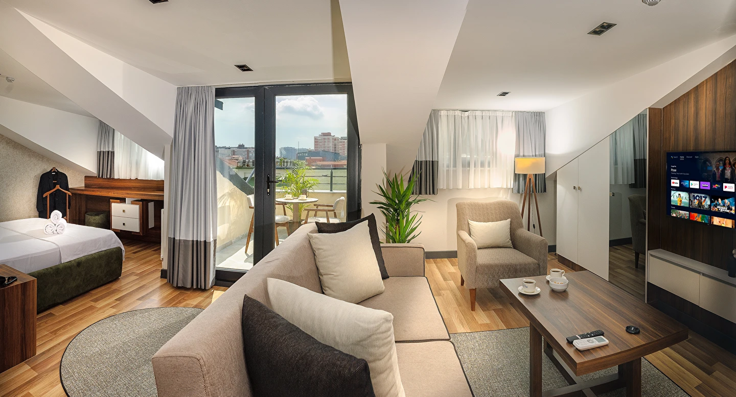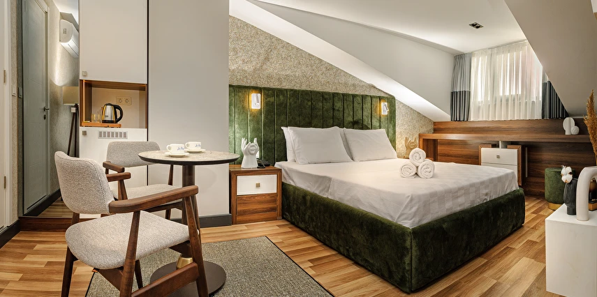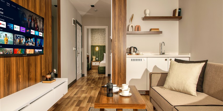 Daha Fazla GösterLa Mia Suites mimari çizimler yapılmış olan 15, 20, 40 ve 50 m² odalarımızda konaklama yapabileceğiniz 1+1 ve 1+0 olmak üzere 2 tip odası mevcuttur. Otel bünyesinde kullandığımız havlular, çarşaflar, kılıflar her gün kuru temizleme servisimiz tarafından en iyi şekilde yıkanır, ütülenir ve dezenfekte edilip otel misafirlerinin kullanımına sunulur. Her oda içerisinde 102 ekran Smart TV bulunmasının yanı sıra profesyonel saç kurutma makinaları, A kalite tek kullanımlık ürünler, yaysız özel yataklar ve konforlu koltuk takımları bulunur. Tesis bir turizm şirketi olmasıyla birlikte misafirlerimizin güvenli ve huzurlu bir şekilde konaklama yapması en önemli ilkelerimizdendir.