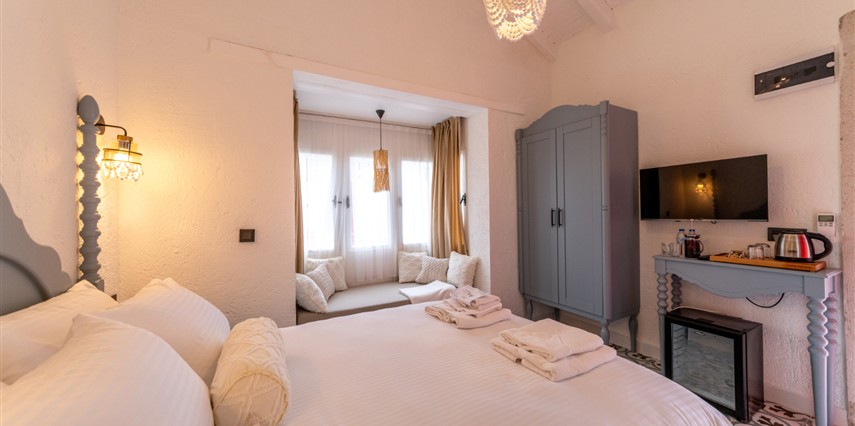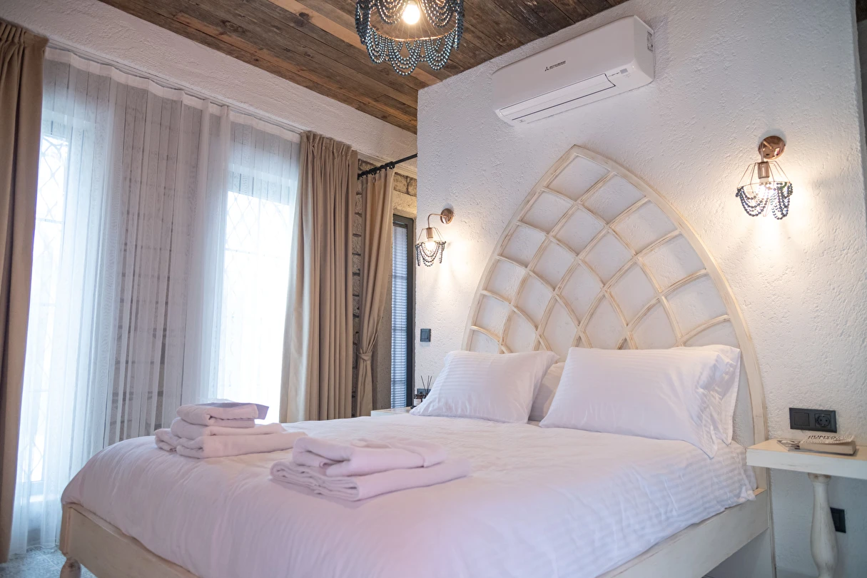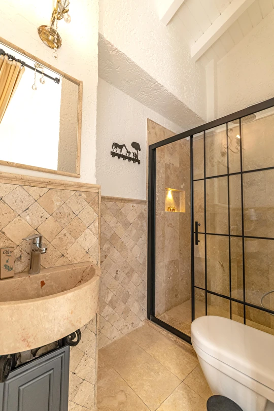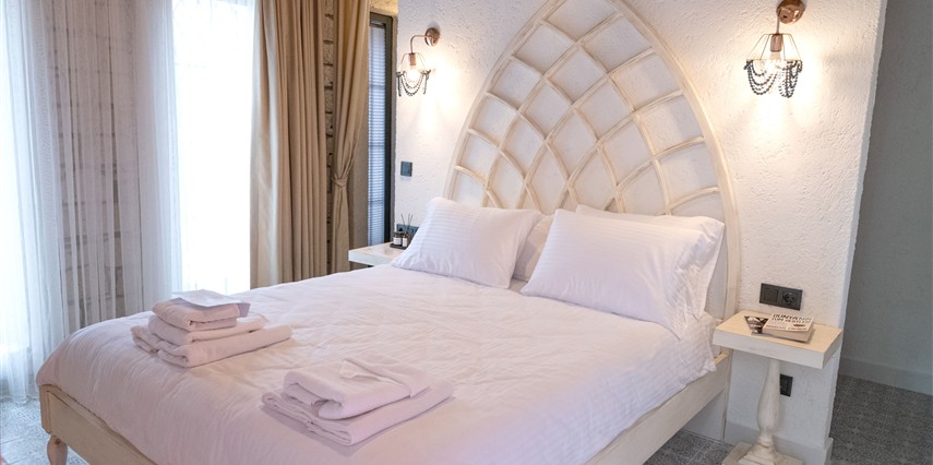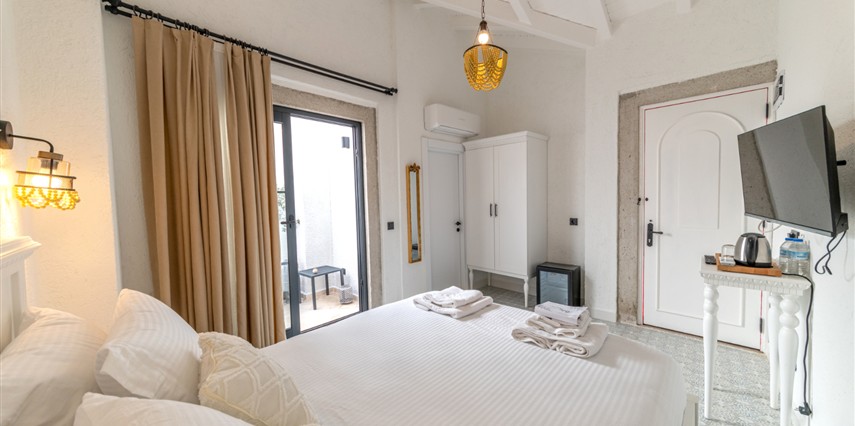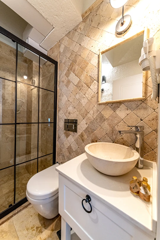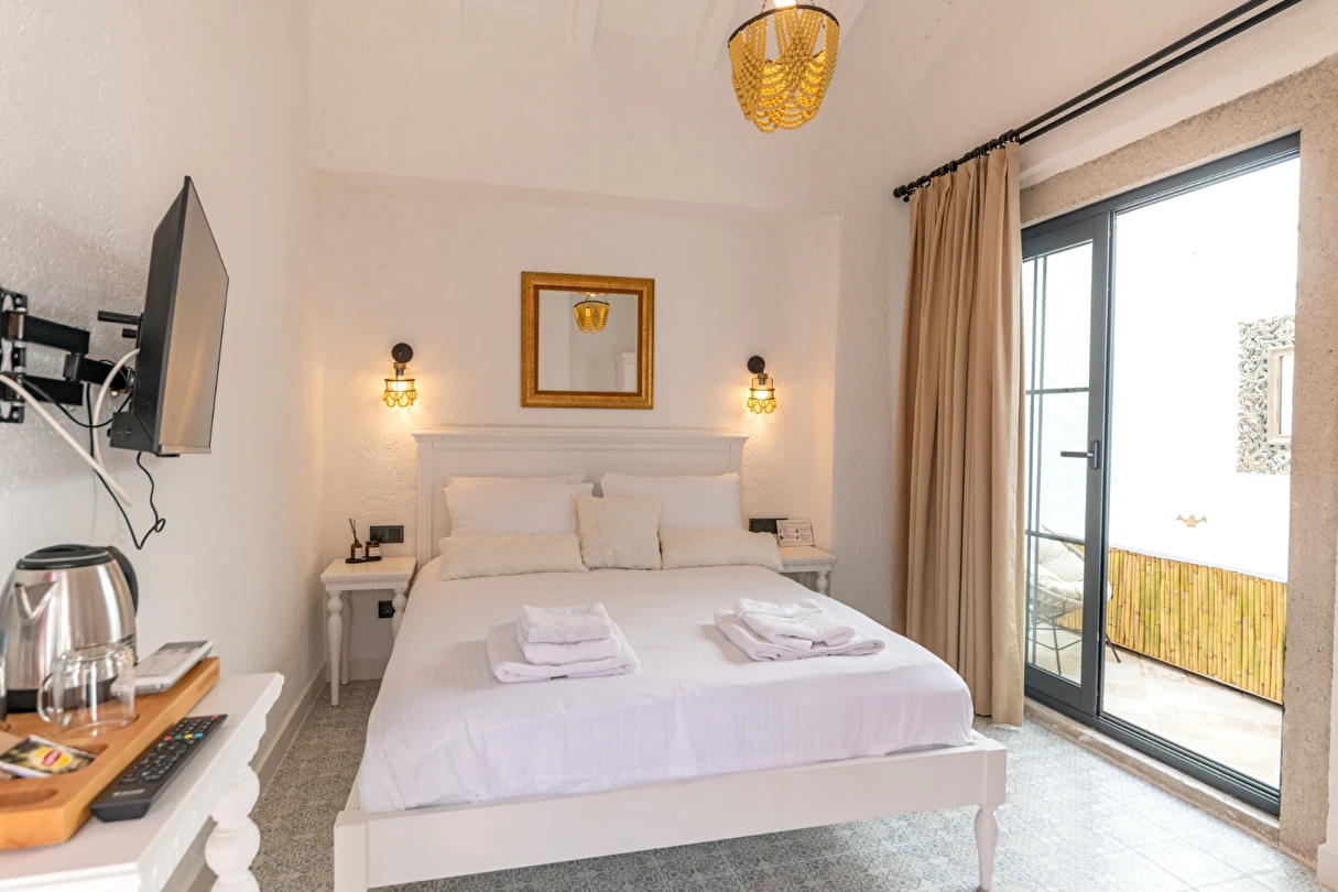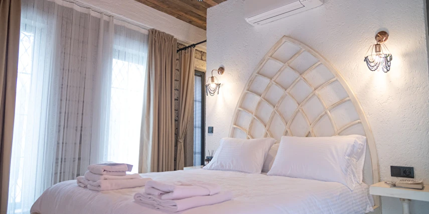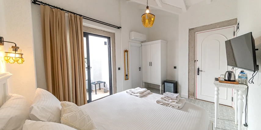 Doğal taş detaylarıyla öne çıkan odamızda, sadece size ait açık hava jakuzisi, özel oturma alanı ve ferah bir konaklama deneyimi sizi bekliyor.
