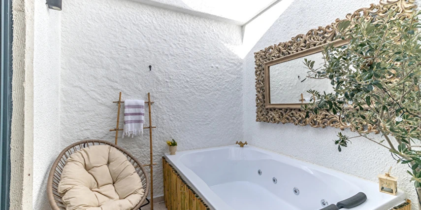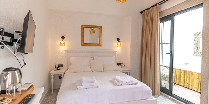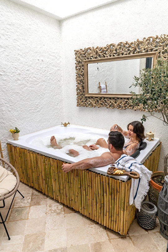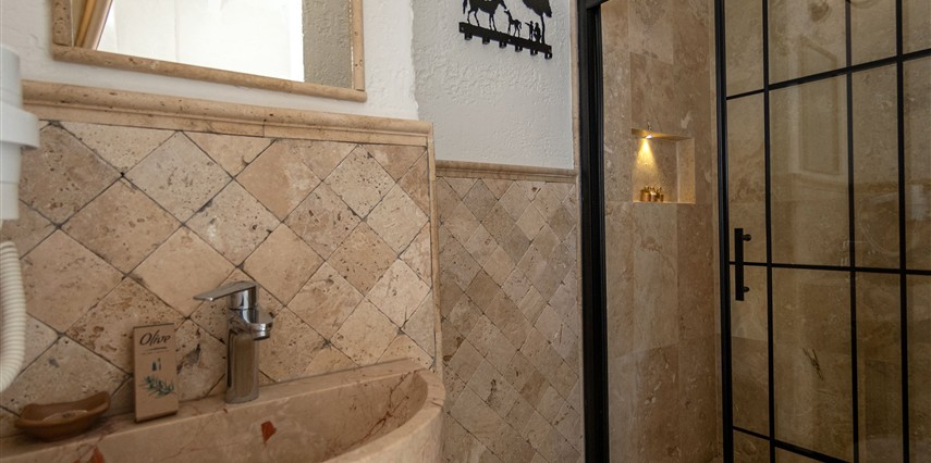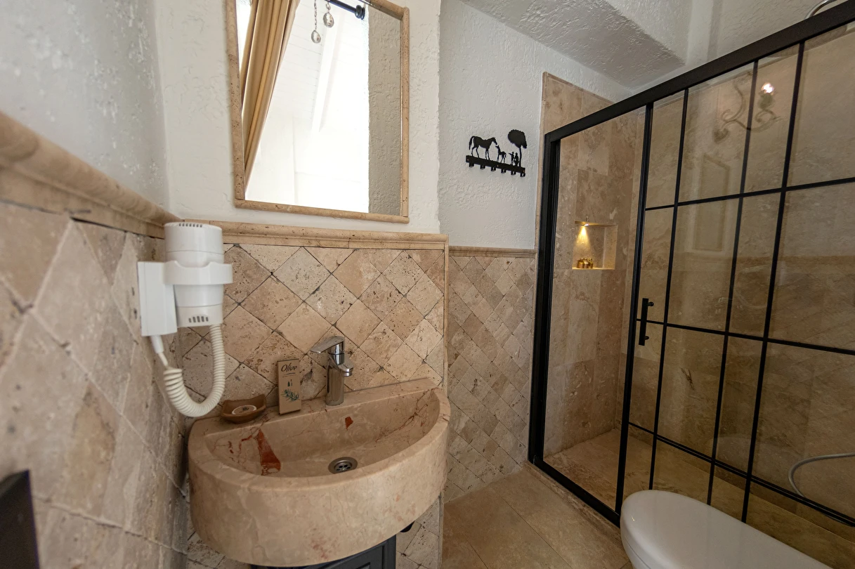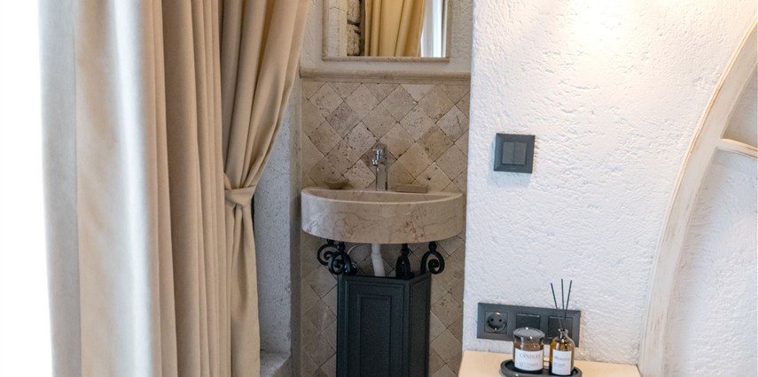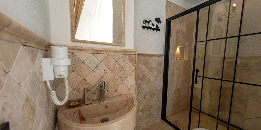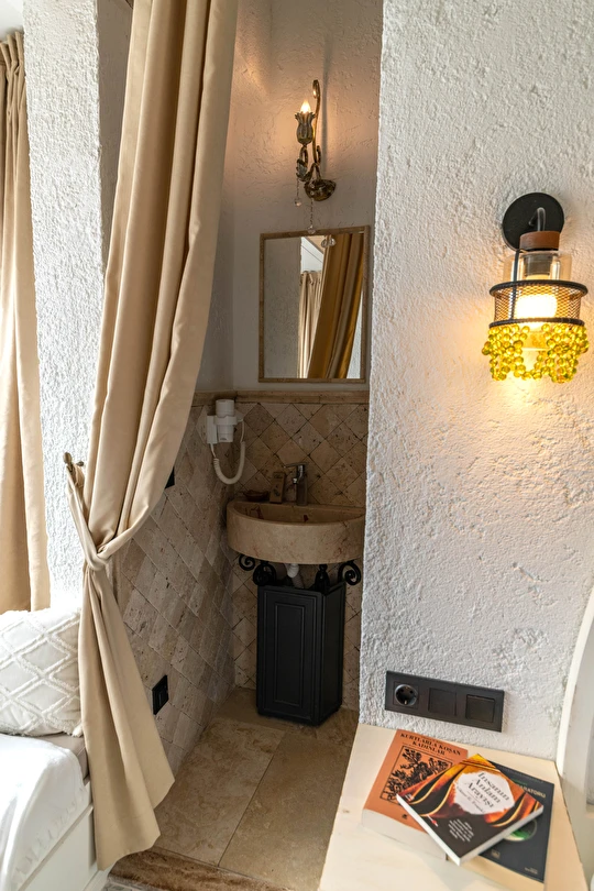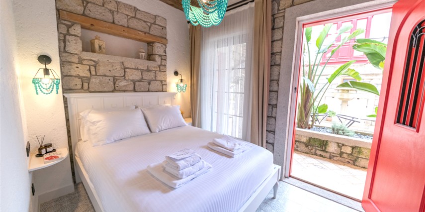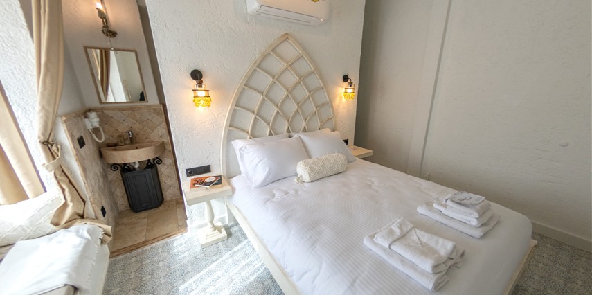 Doğal taş detaylarıyla öne çıkan odamızda, sadece size ait açık hava jakuzisi, özel oturma alanı ve ferah bir konaklama deneyimi sizi bekliyor.