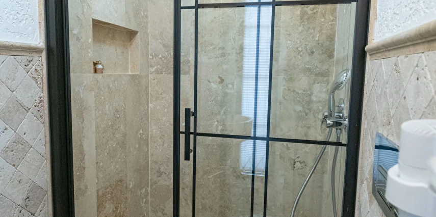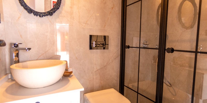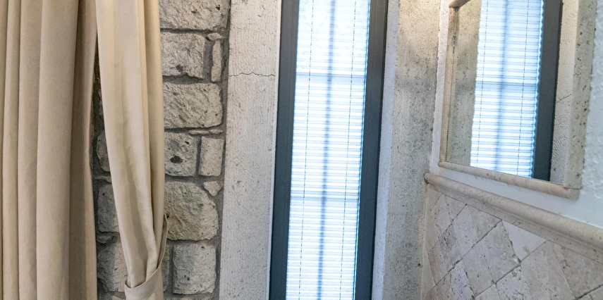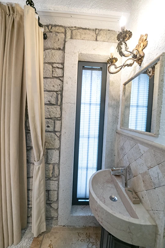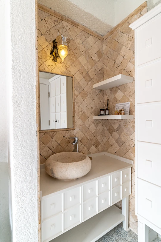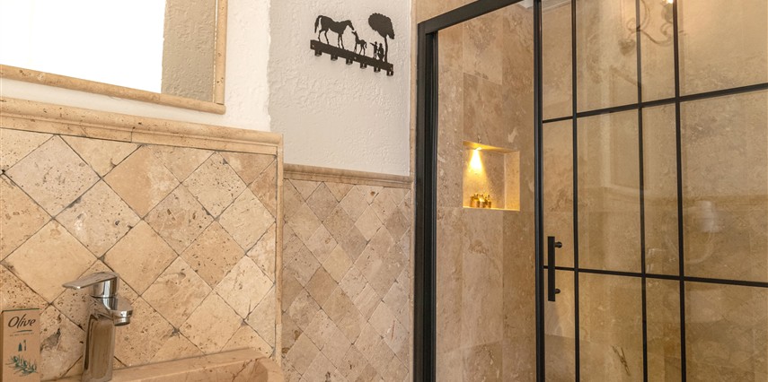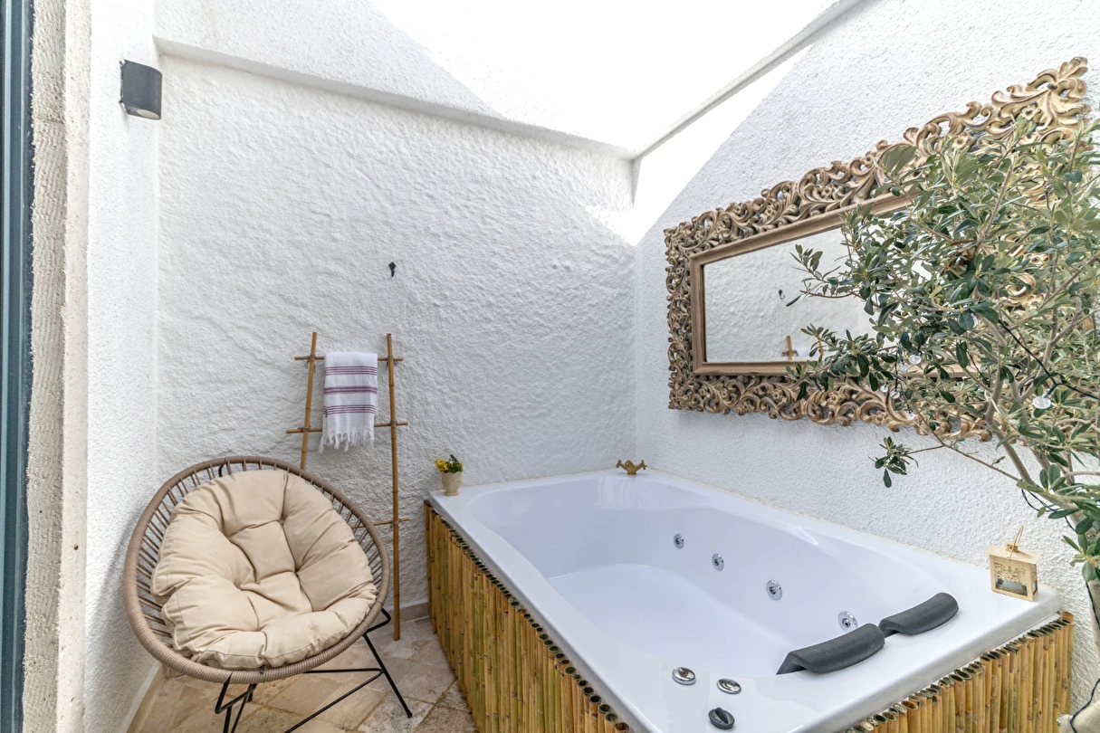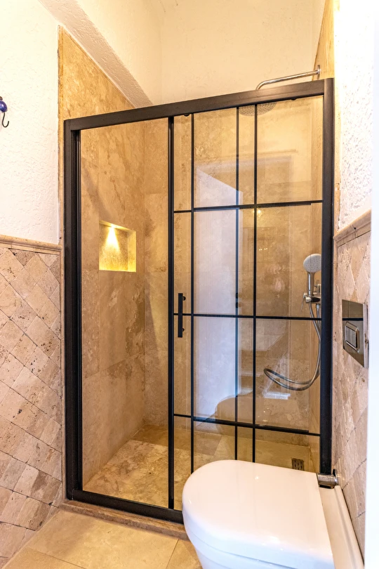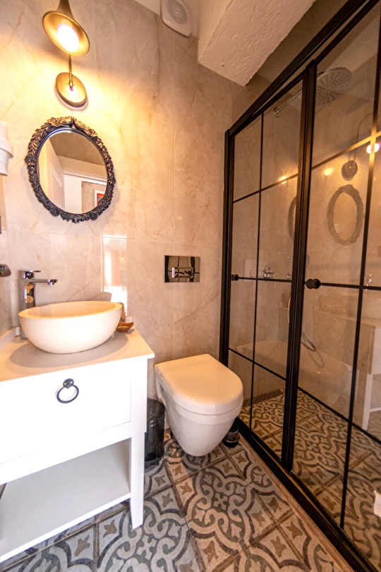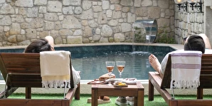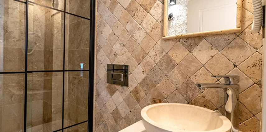 Doğal taş detaylarıyla öne çıkan odamızda, sadece size ait açık hava jakuzisi, özel oturma alanı ve ferah bir konaklama deneyimi sizi bekliyor.