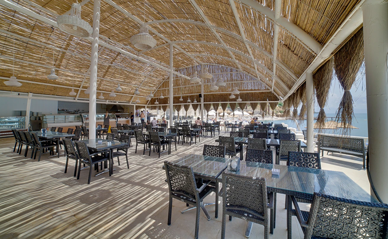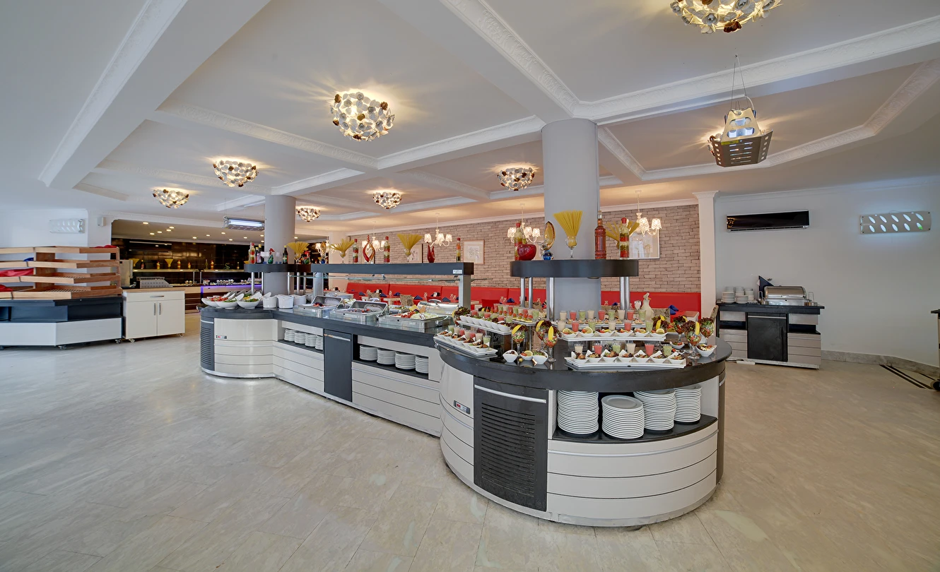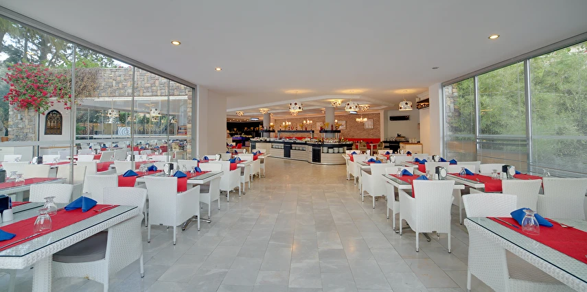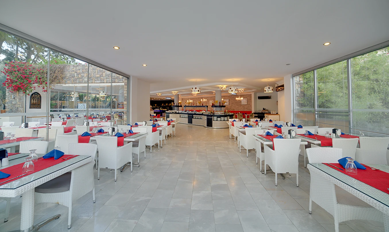01.06-15.09 tarihleri arasında hizmet veren A ‘la Carte Restoranlarında en az 6 gece kalan misafirler, bir gün öncesinden rezervasyon yaptırmak şartıyla 1 defa ücretsizdir. Şişe olarak servis edilen tüm içecekler ve tüm yabancı içecekler, kokteyller, taze sıkılmış meyve suları ücretlidir. A’la carte restoranlar haftanın bir günü kapalıdır.