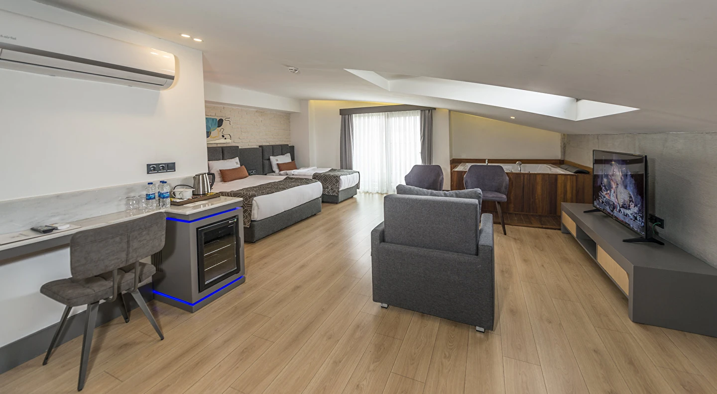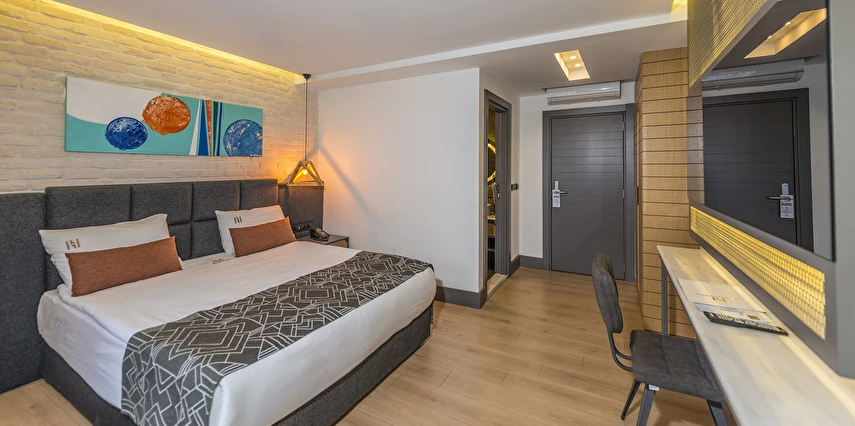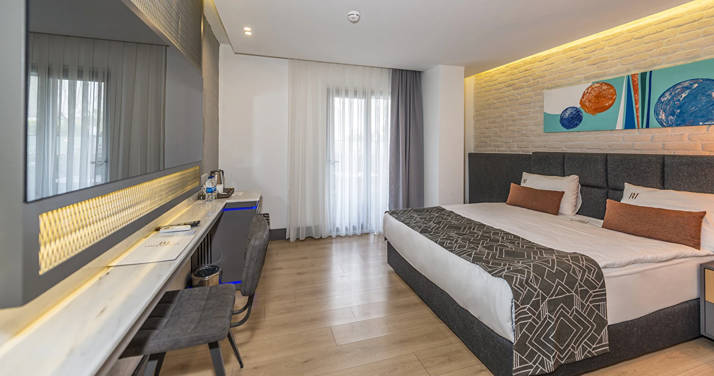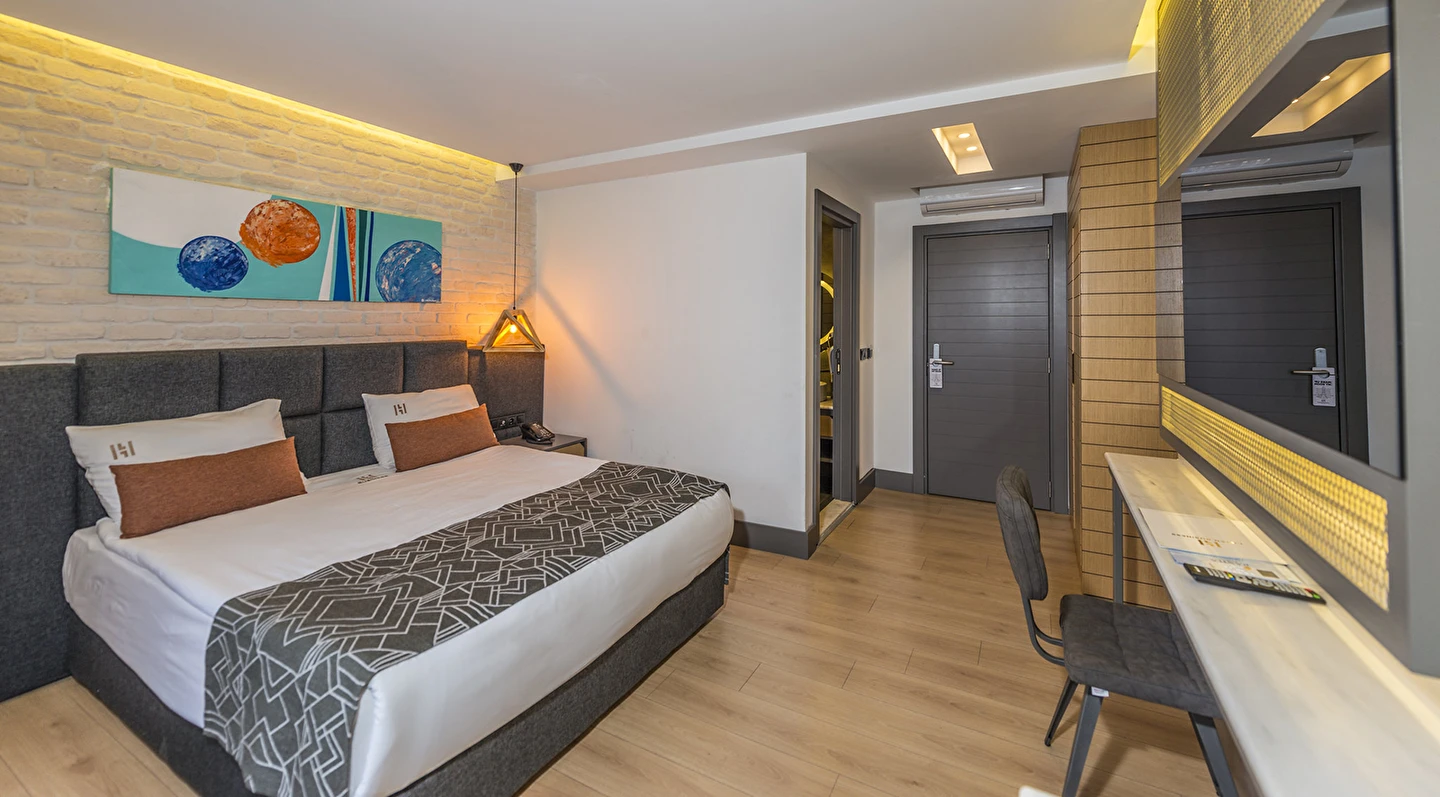 Premium Donanım: Yüksek hızlı ücretsiz Wi-Fi, Smart TV, minibar, dijital kasa ve özel tasarım banyo bukletleri.