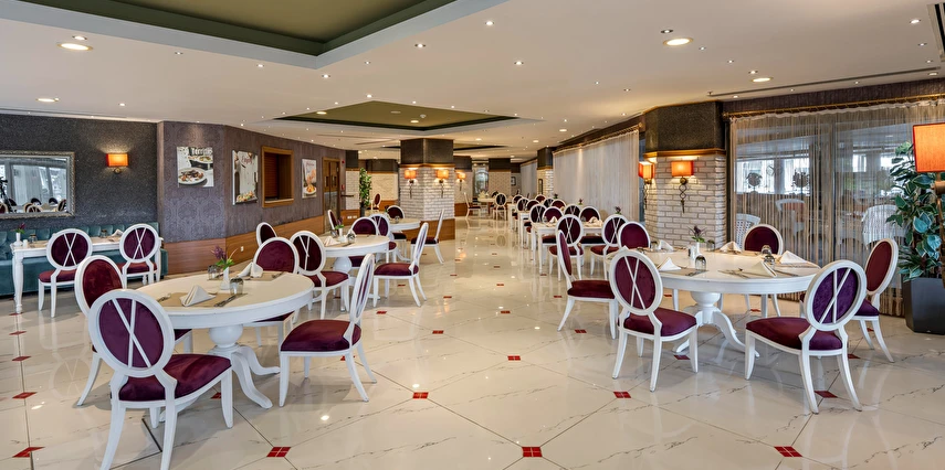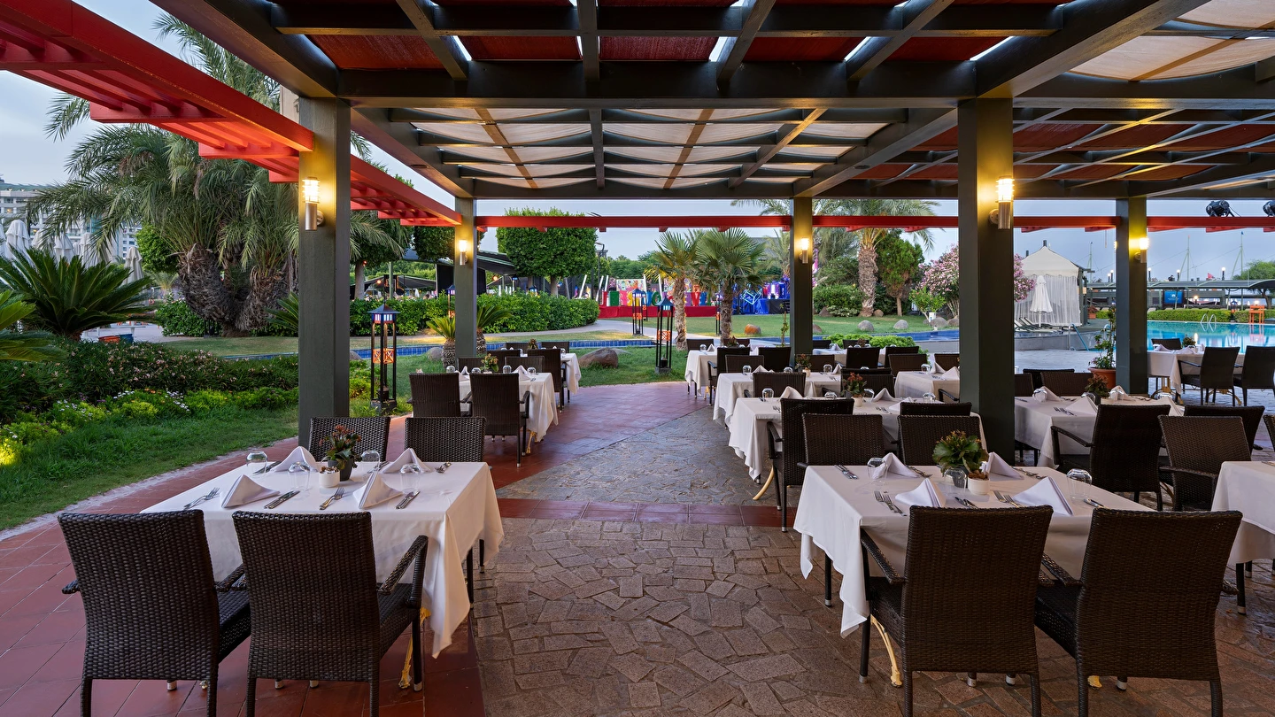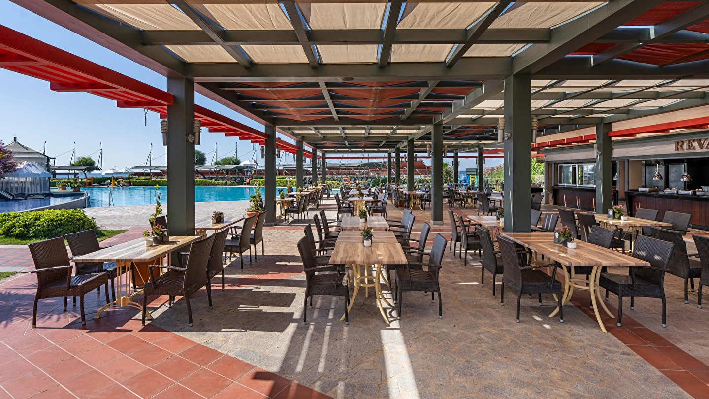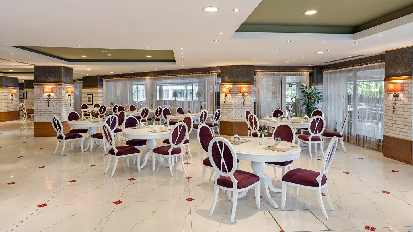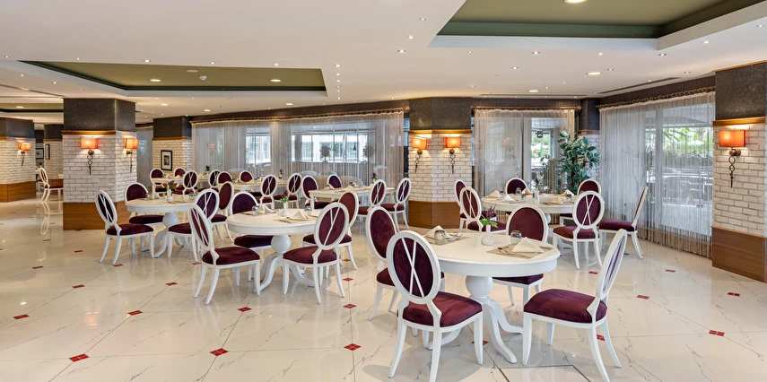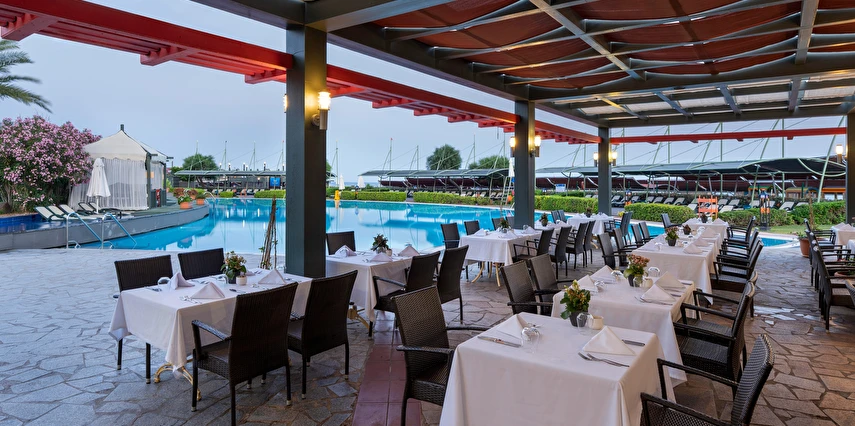 Sabah kahvaltısı, öğle ve akşam yemekleri açık büfe olup tesisin belirlediği markalar dahilinde yerli alkollü ve alkolsüz içecekler 24 saat ücretsizdir. Tüm şişelenmiş kutu, kapalı yerli ve yabancı içecekler, ithal içkiler, Taze sıkılmış meyve suyu, paket dondurma ücretlidir.