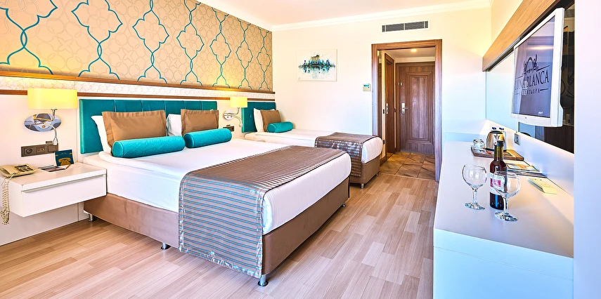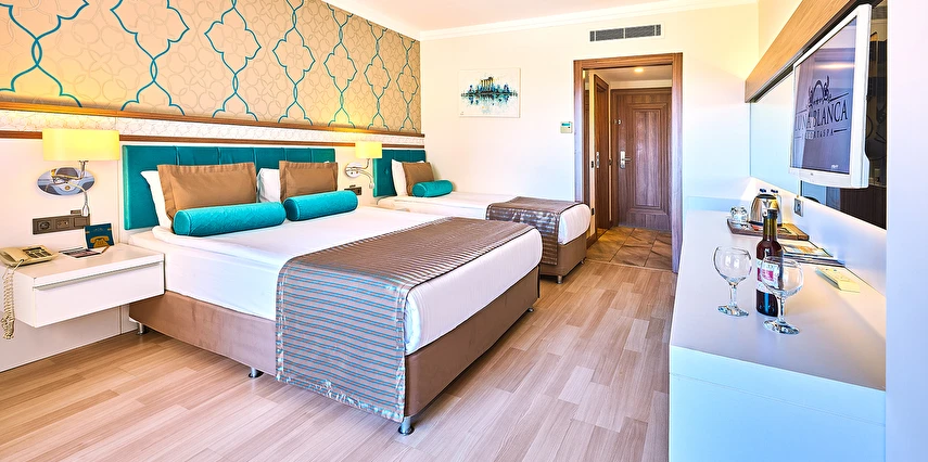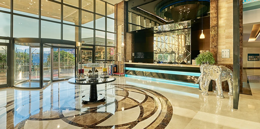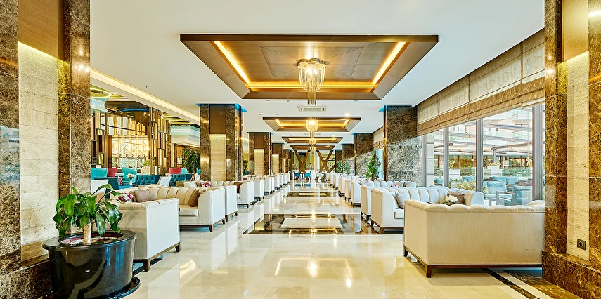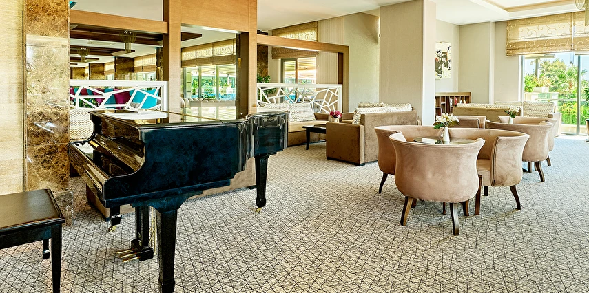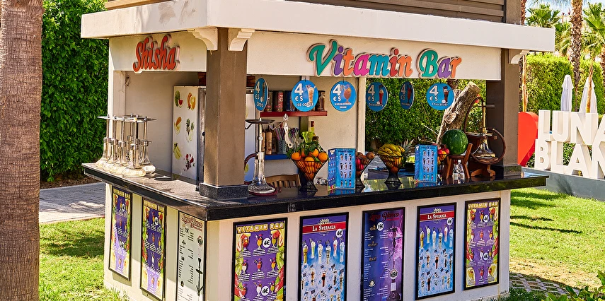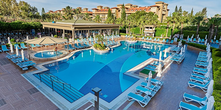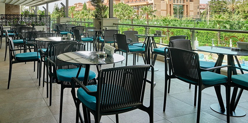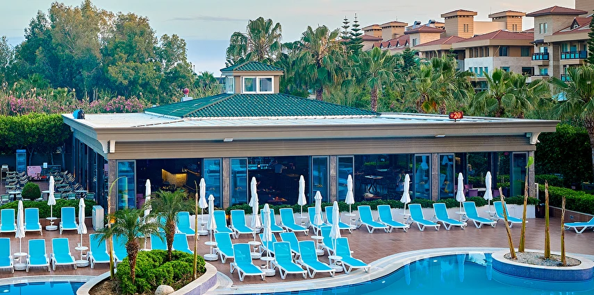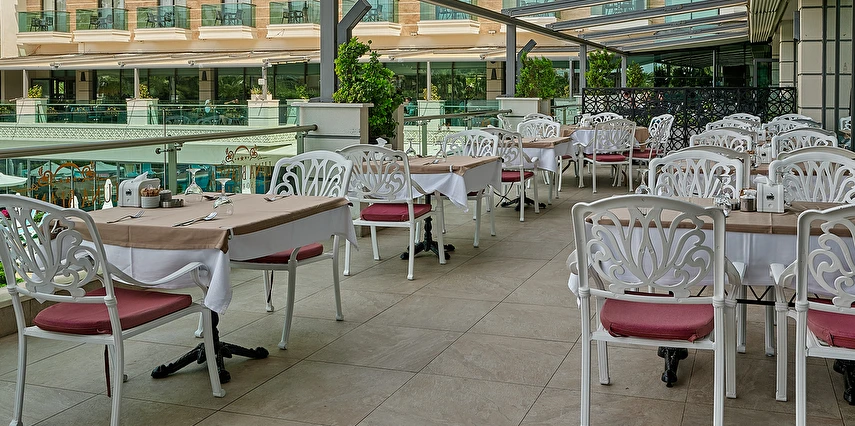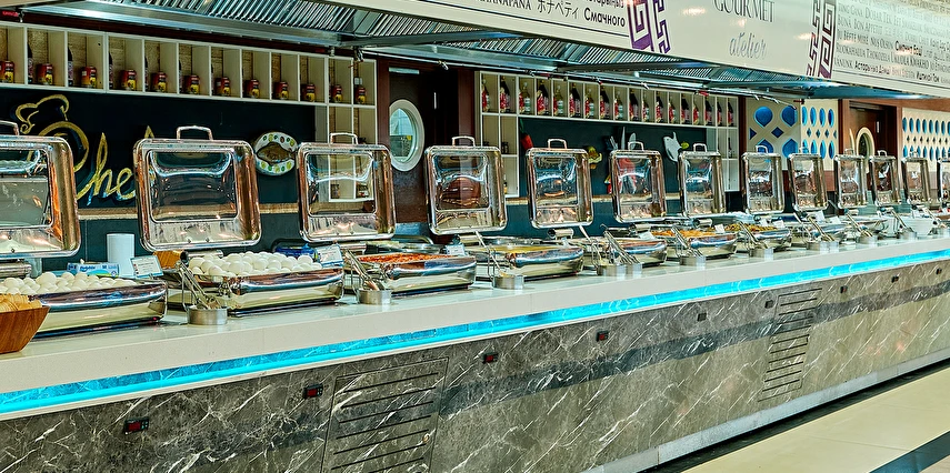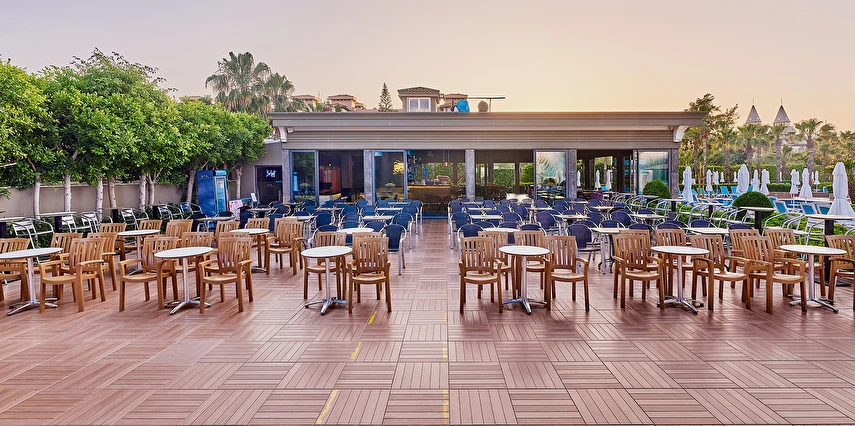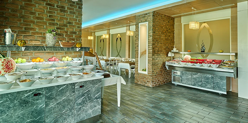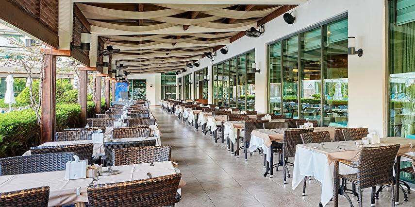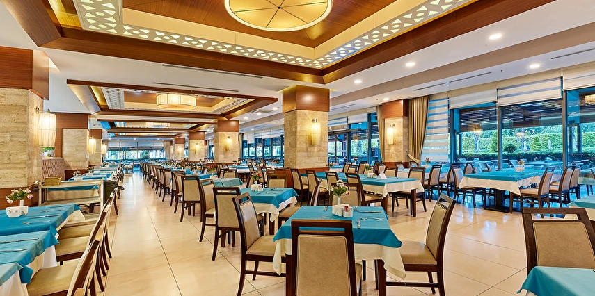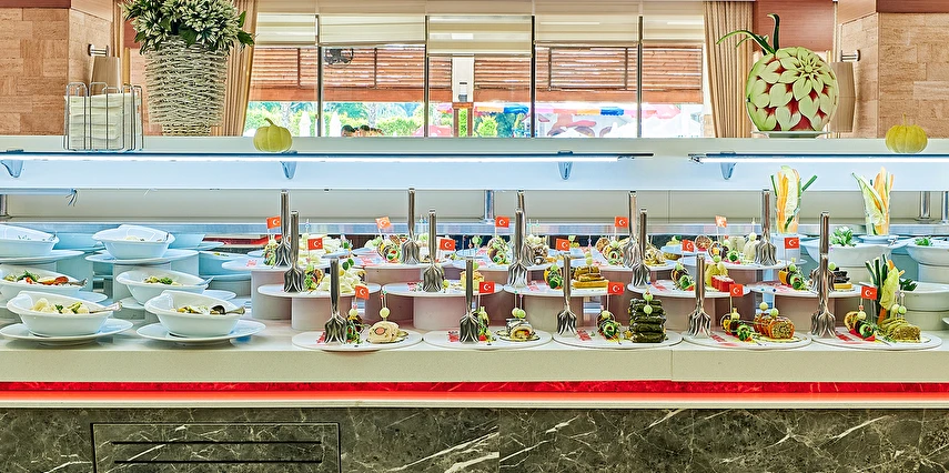 Kahvaltı, öğle ve akşam yemeği açık büfe olup tesisin belirlemiş olduğu markalar dahilinde yerli ve belirlenen ithal alkollü - alkolsüz içecekler 24 saat ücretsizdir. Taze sıkılmış meyve suları, ithal şampanyalar, kaliteli şaraplar, tüm şişe içkiler, lüks içecekler (12 yıl ve üzeri viskiler, bourbon viskiler, premium konyaklar) ücretlidir. Tüm restoran ve barlarda içecekler bardak ile servis edilir.
