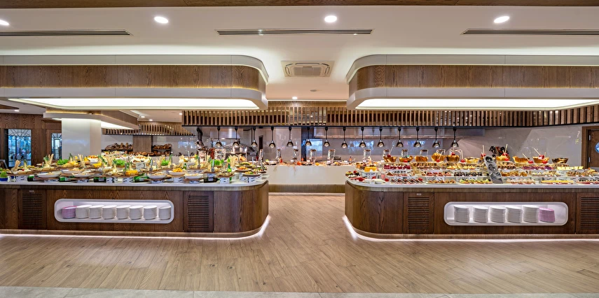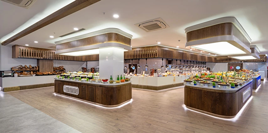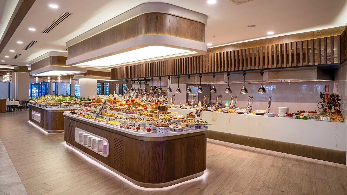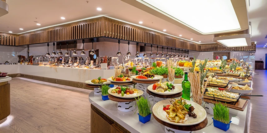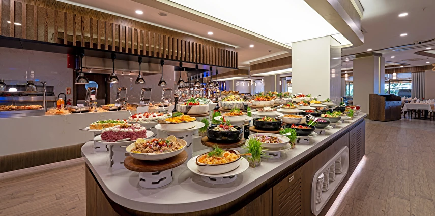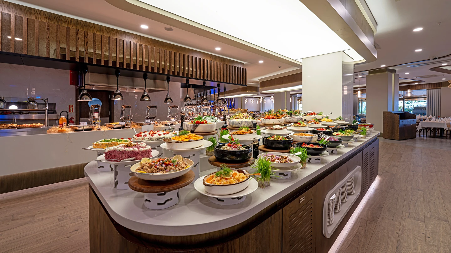 Sabah kahvaltısı, öğle yemeği ve akşam yemeği açık büfe olup, tesisin belirlemiş olduğu markalar dahilinde yerli alkollü ve alkolsüz içecekler 24 saat ücretsizdir. Konsept harici üst kalite, özel üretim içkiler ve şişe içecekler, taze sıkılmış meyve suları ücretlidir. Türk kahvesi ücretsizdir. Tüm içecekler servis personeli tarafından masaya servis edilir. (Kahvaltı hariç) .