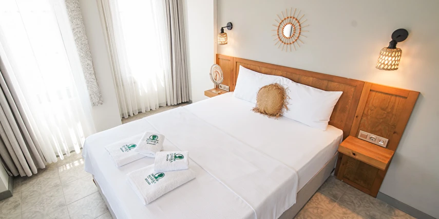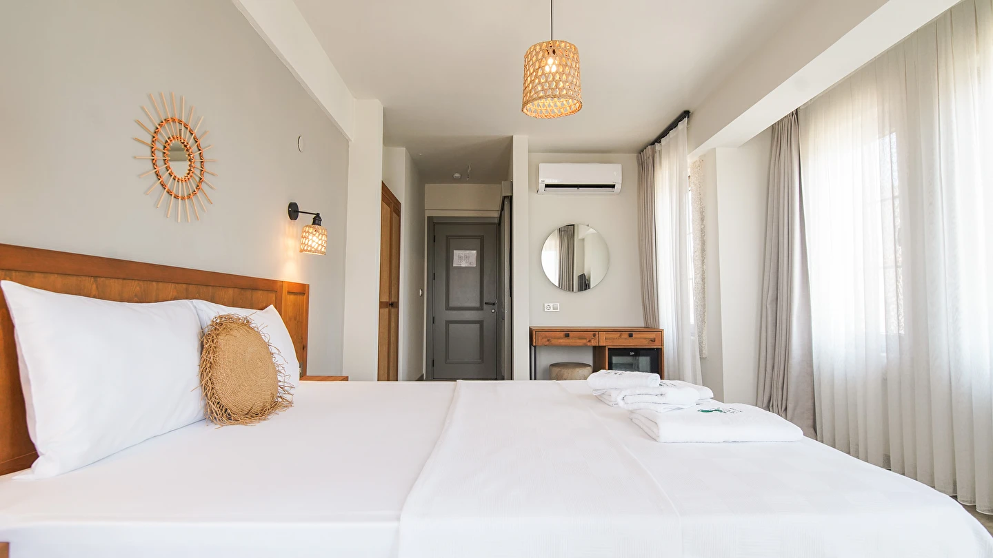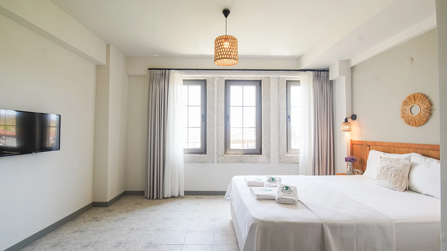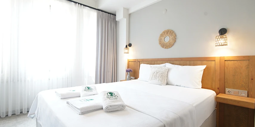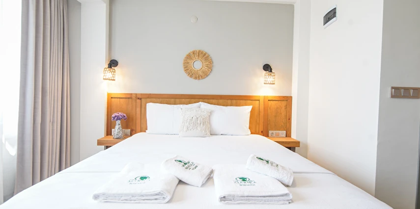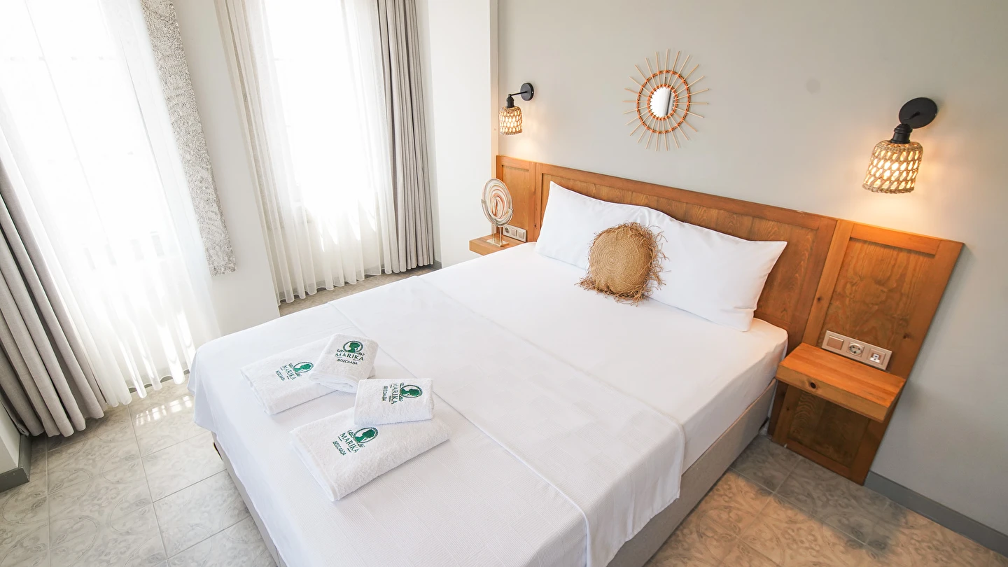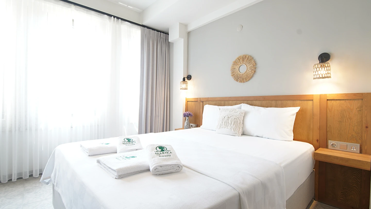 Marika Otel’in odaları aydınlık, ferah ve temiz tasarımlı olup, farklı oda tipleriyle çiftlerden ailelere kadar çeşitli konaklama ihtiyaçlarına uygundur. Birçok odadan bahçe ve deniz manzarası sunulur, böylece sabahları doğa ve denizle güne başlamak mümkündür.