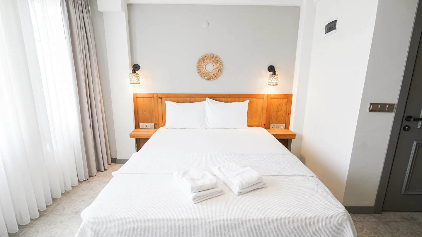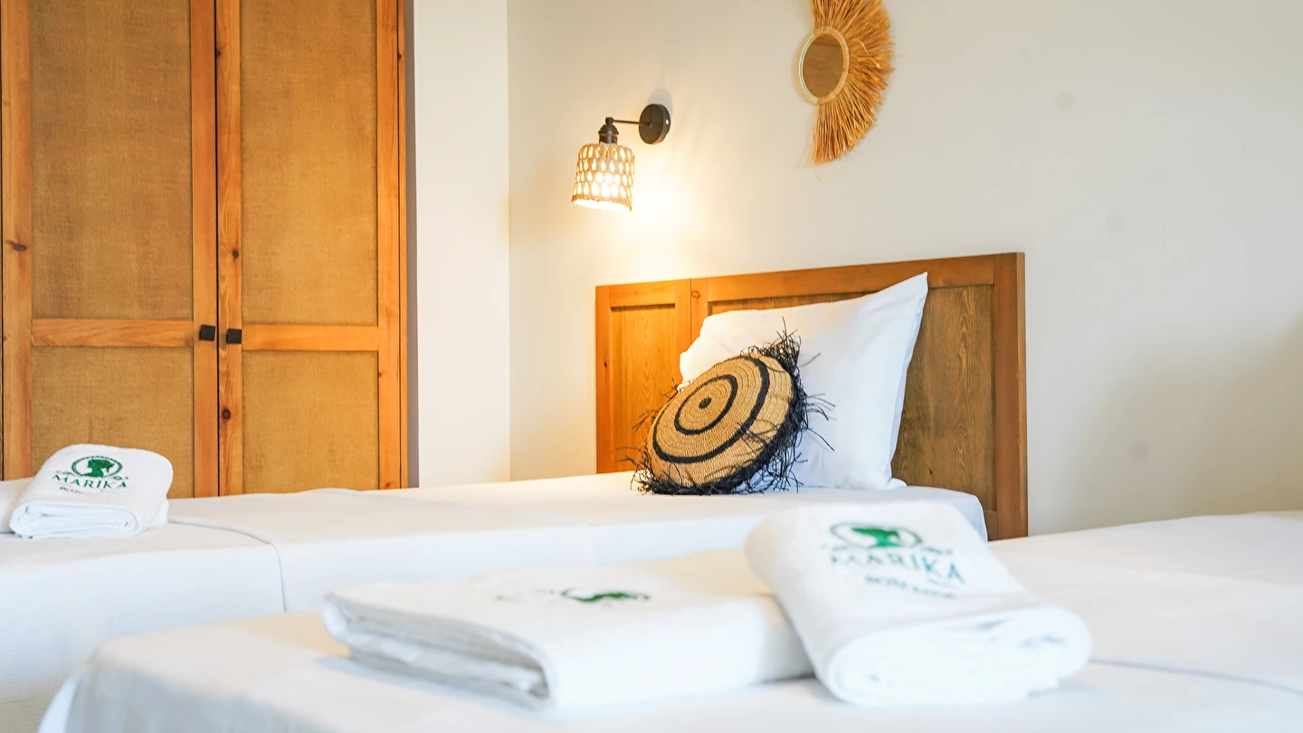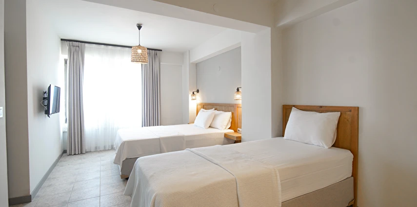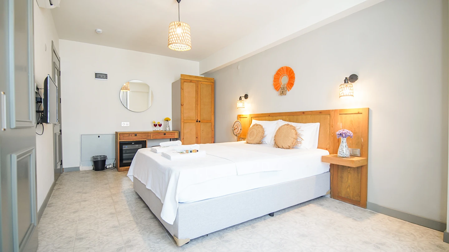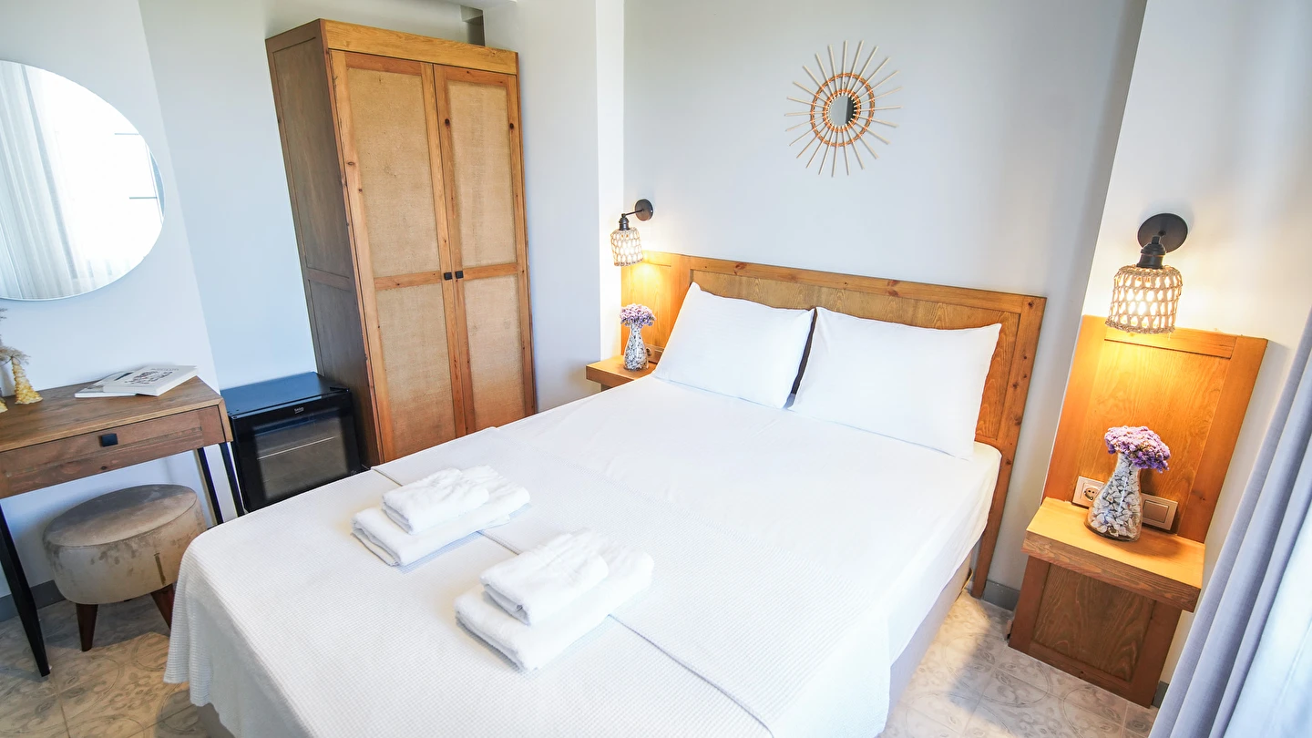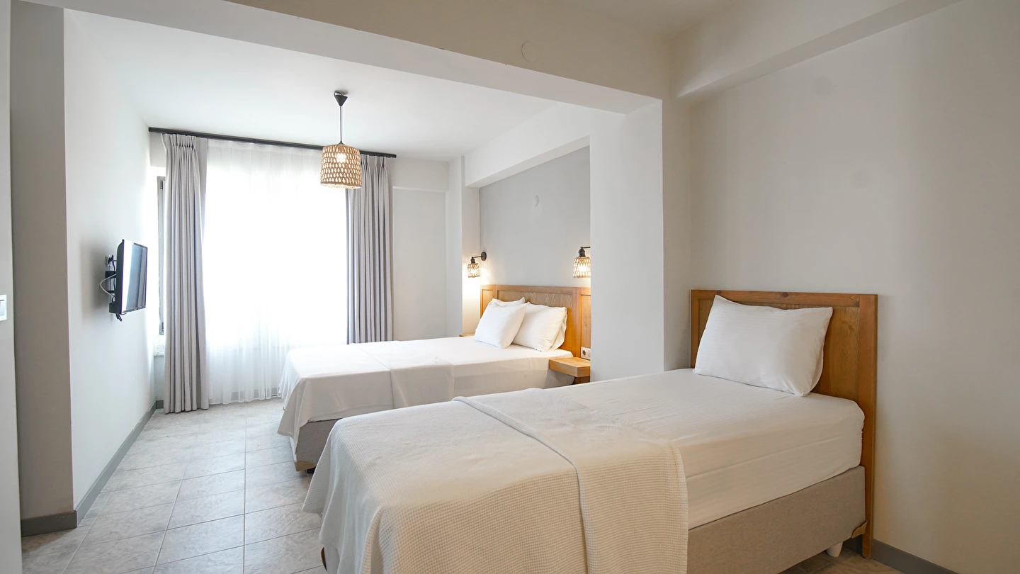 Marika Otel’in odaları aydınlık, ferah ve temiz tasarımlı olup, farklı oda tipleriyle çiftlerden ailelere kadar çeşitli konaklama ihtiyaçlarına uygundur. Birçok odadan bahçe ve deniz manzarası sunulur, böylece sabahları doğa ve denizle güne başlamak mümkündür.
