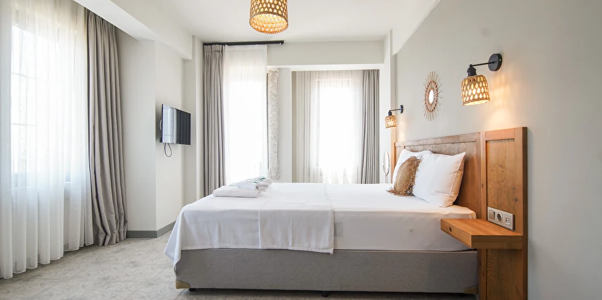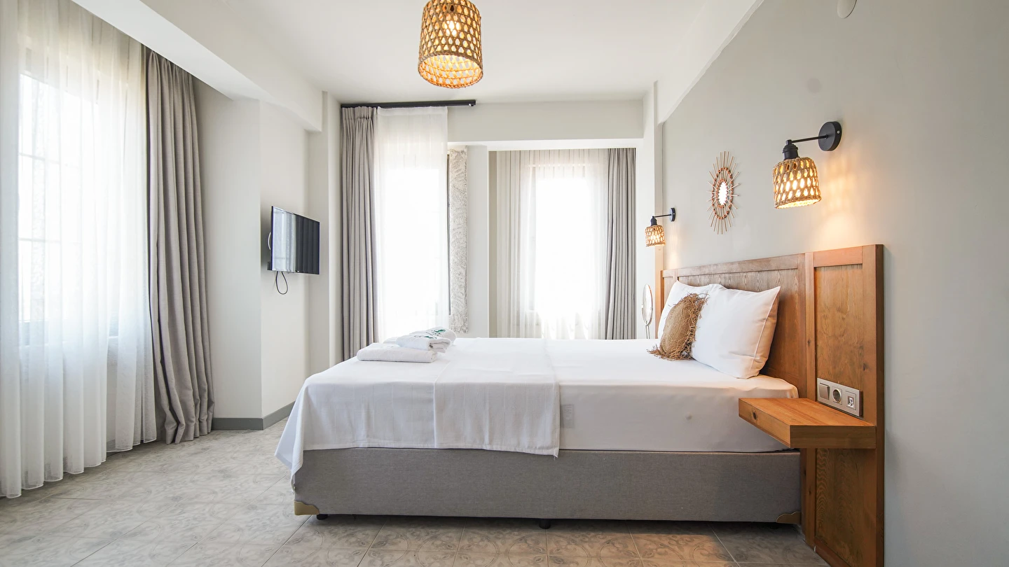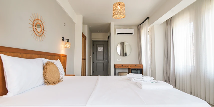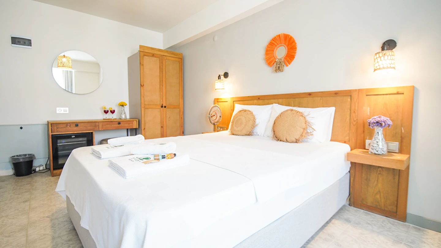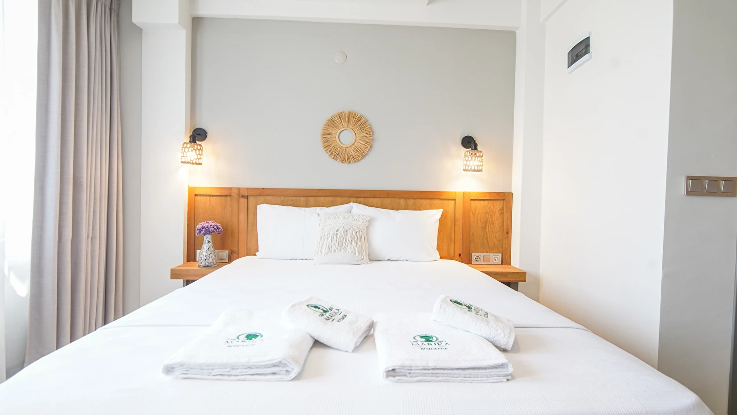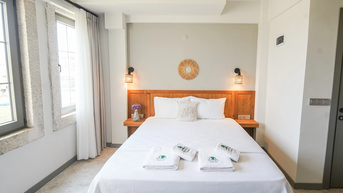 Marika Otel’in odaları aydınlık, ferah ve temiz tasarımlı olup, farklı oda tipleriyle çiftlerden ailelere kadar çeşitli konaklama ihtiyaçlarına uygundur. Birçok odadan bahçe ve deniz manzarası sunulur, böylece sabahları doğa ve denizle güne başlamak mümkündür.