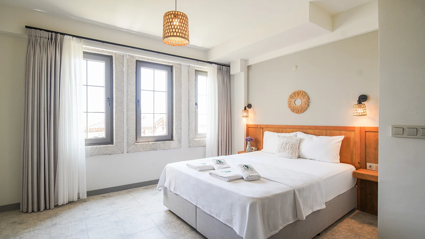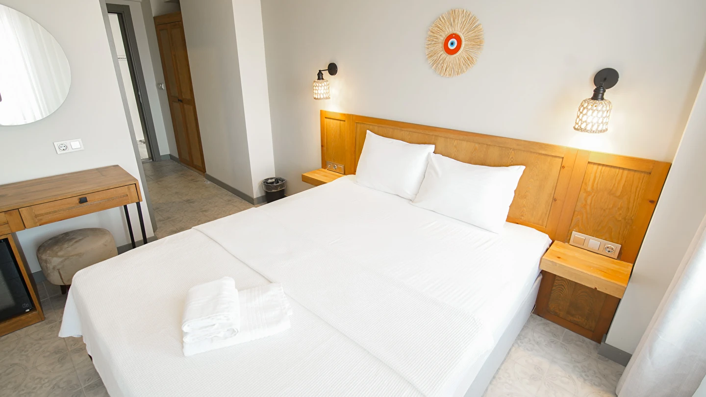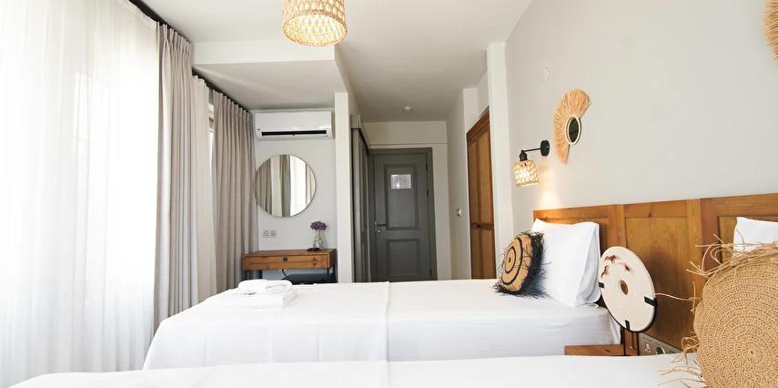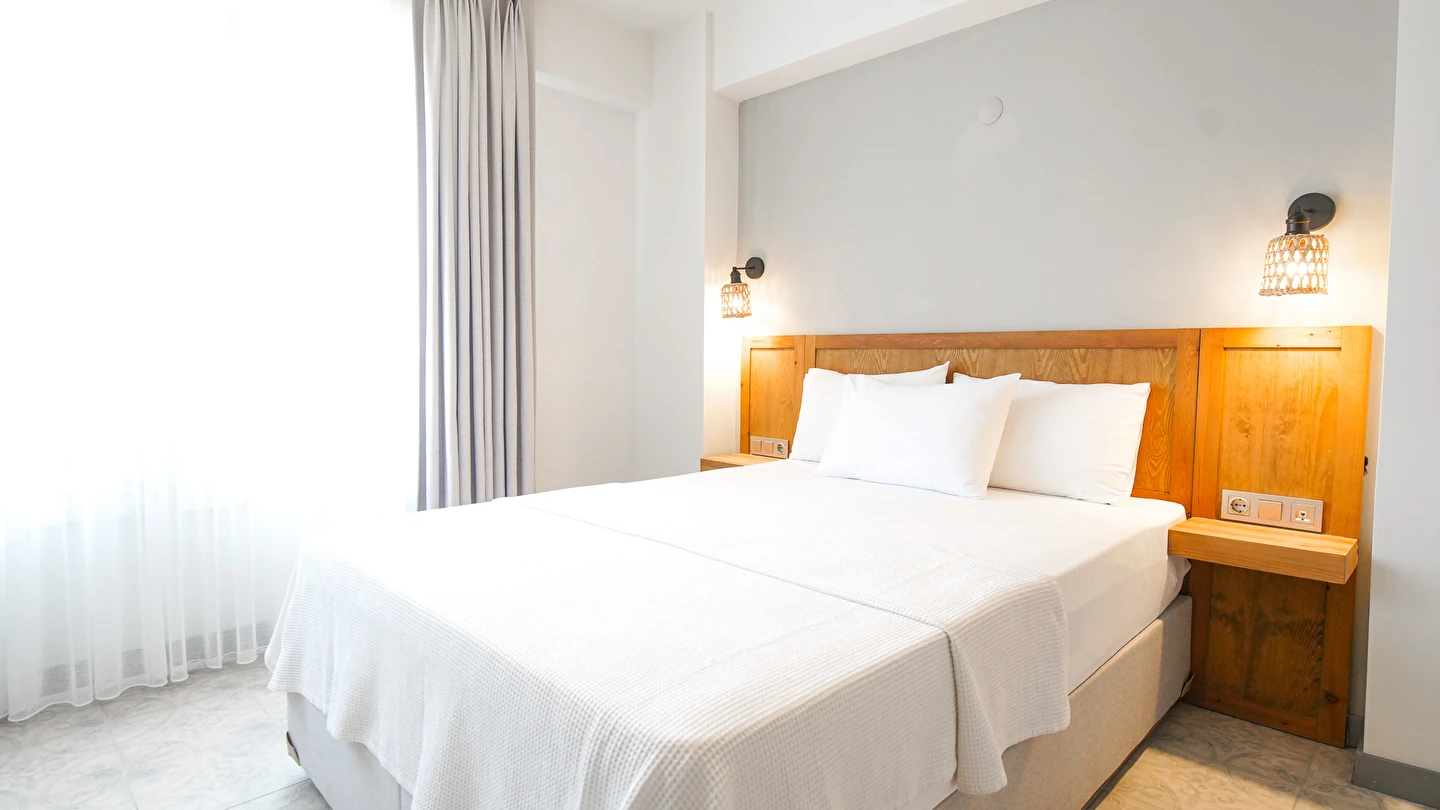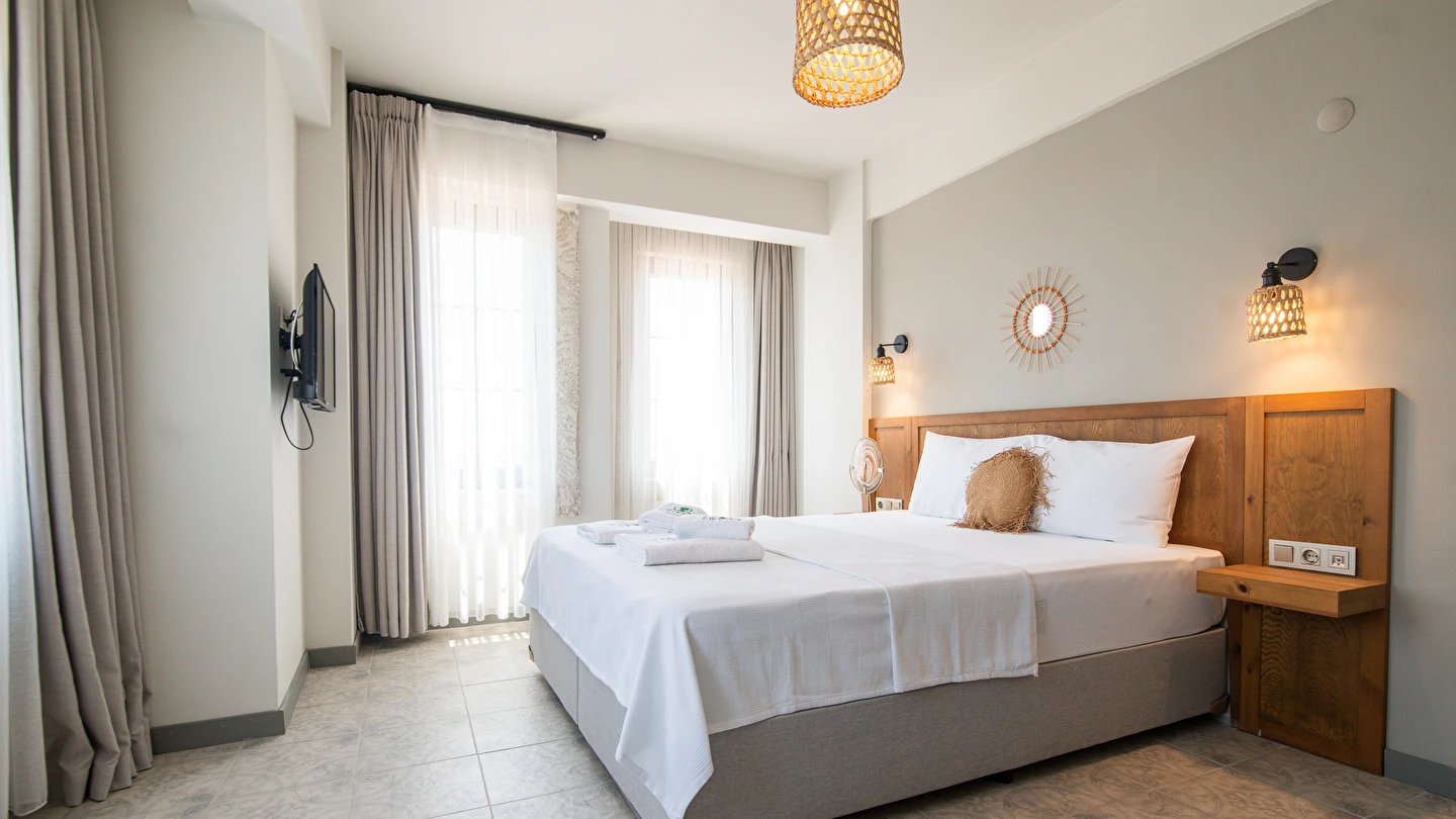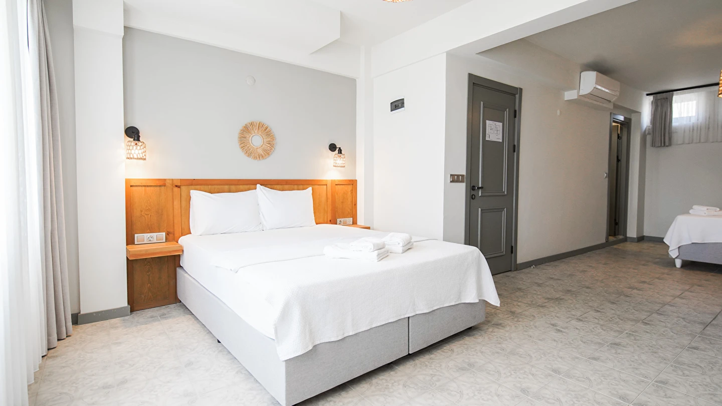 Marika Otel’in odaları aydınlık, ferah ve temiz tasarımlı olup, farklı oda tipleriyle çiftlerden ailelere kadar çeşitli konaklama ihtiyaçlarına uygundur. Birçok odadan bahçe ve deniz manzarası sunulur, böylece sabahları doğa ve denizle güne başlamak mümkündür.