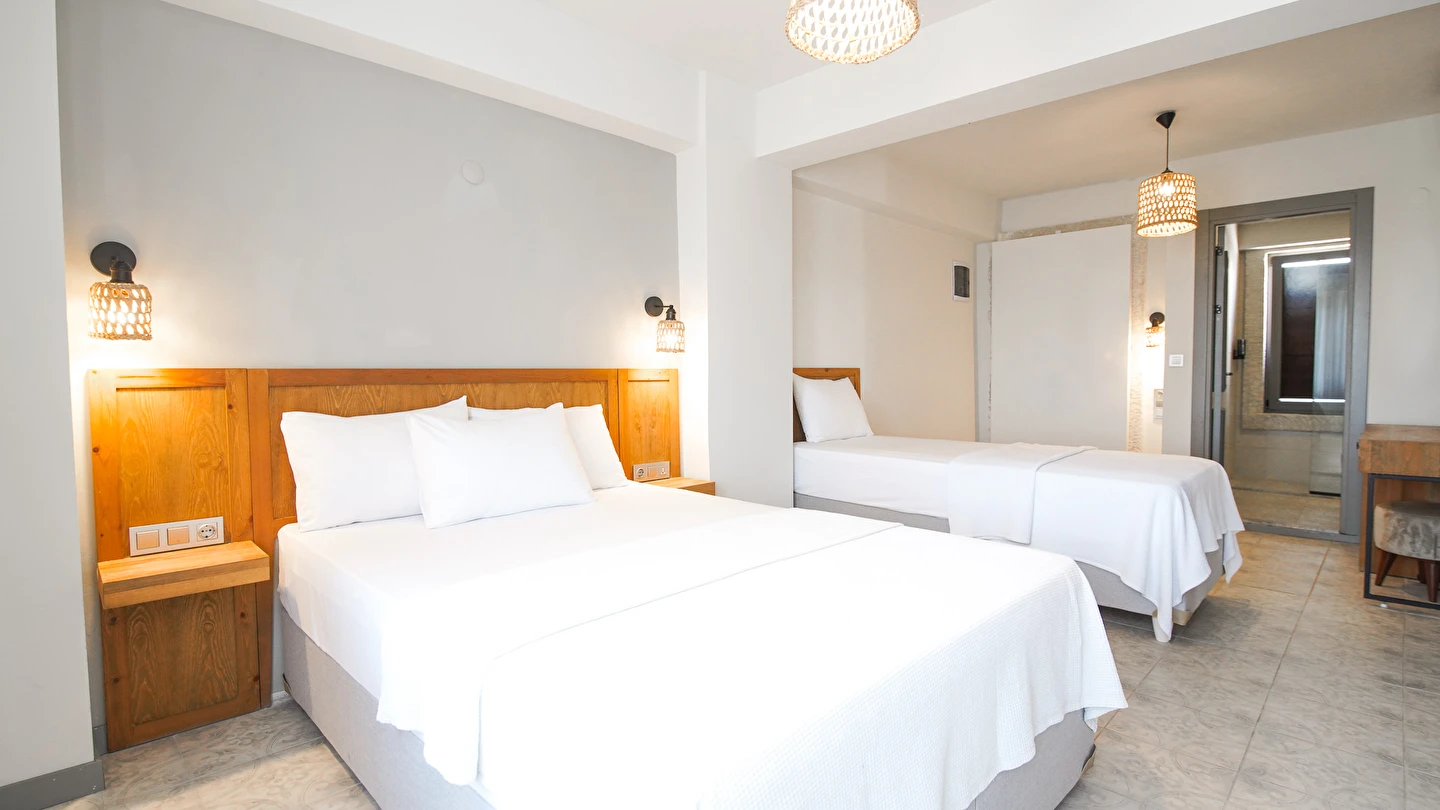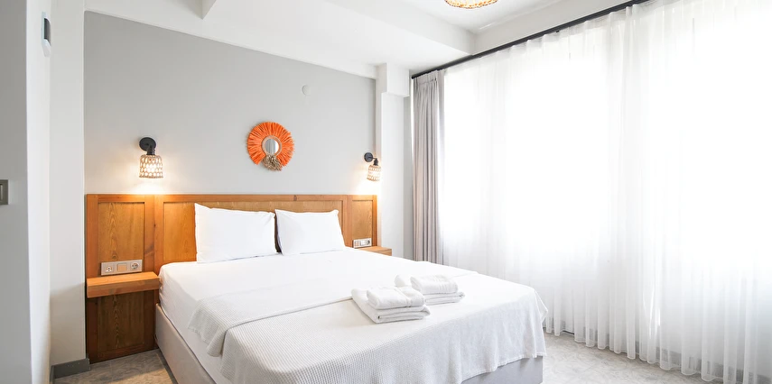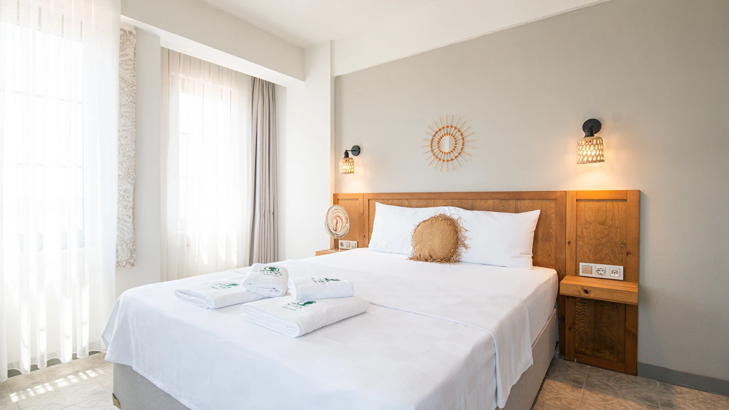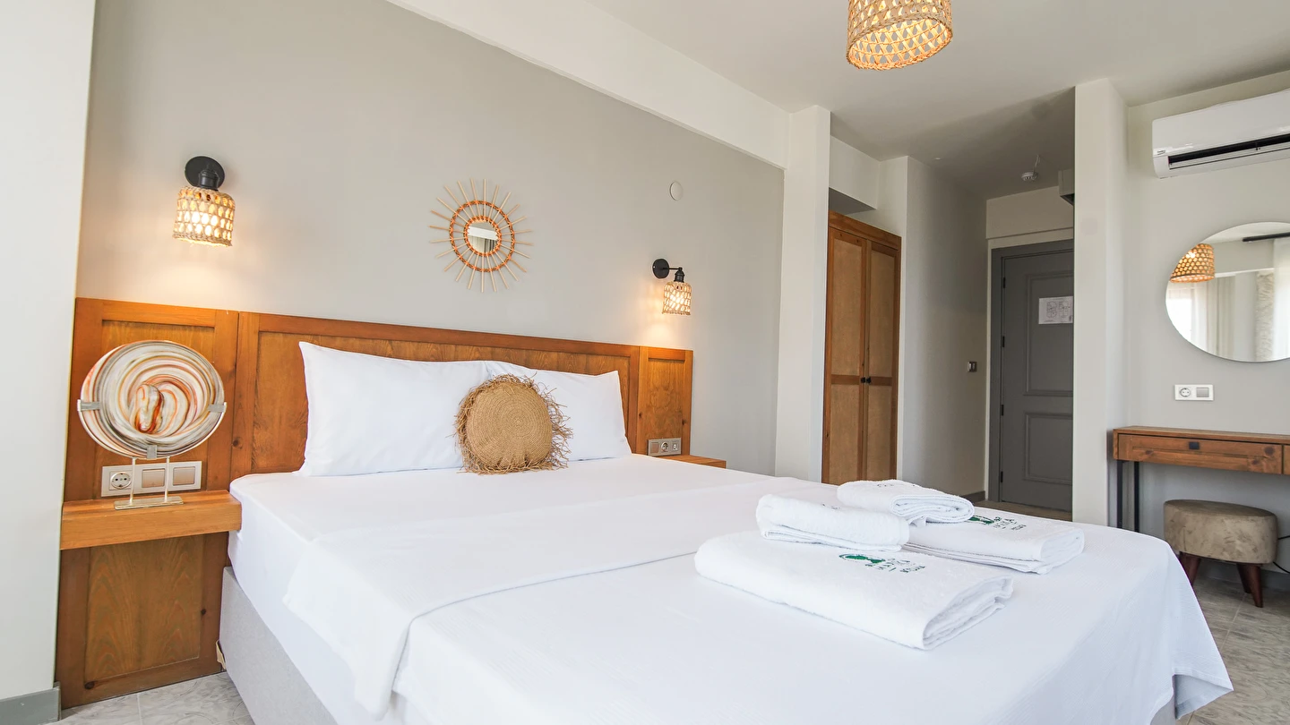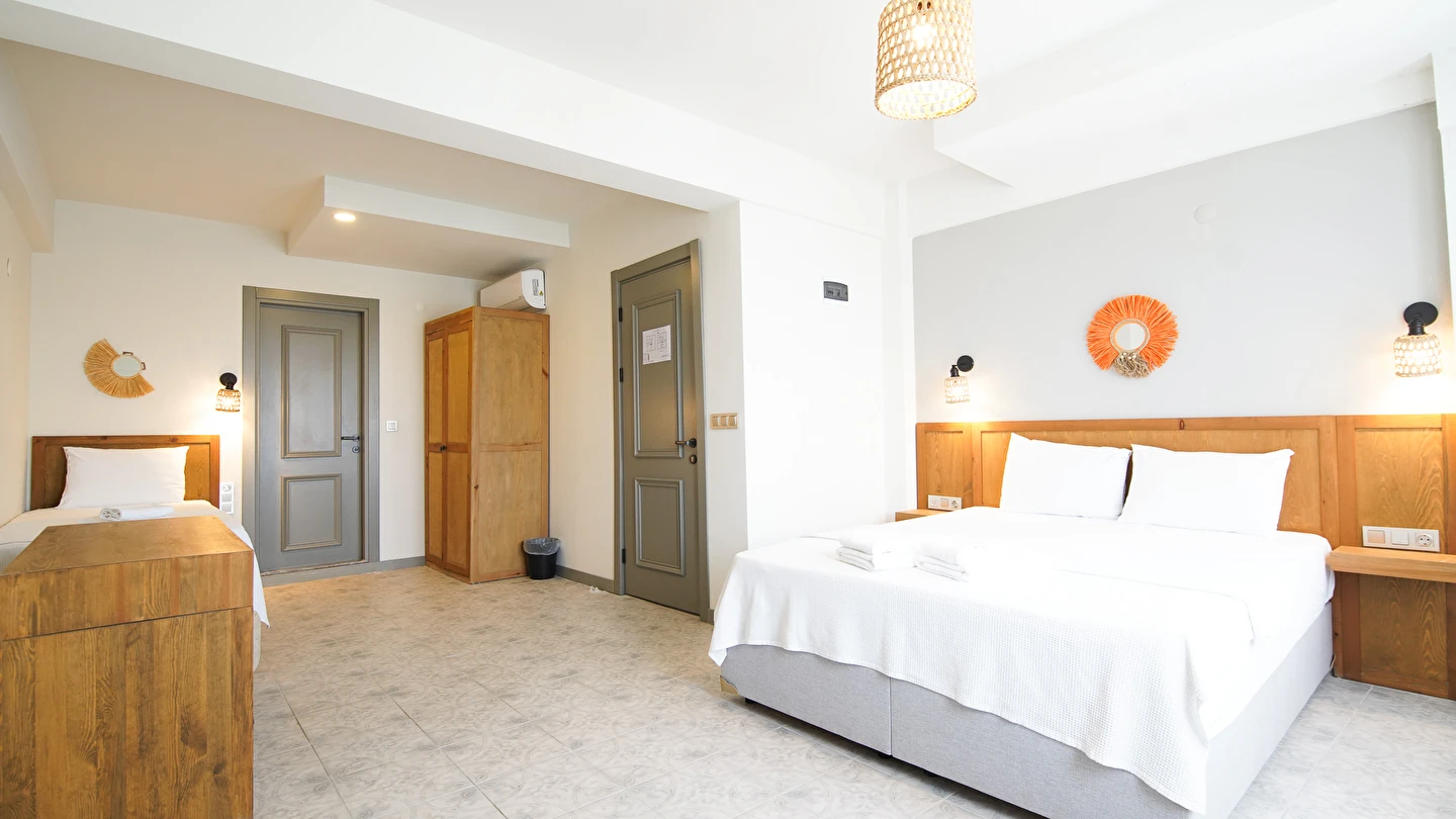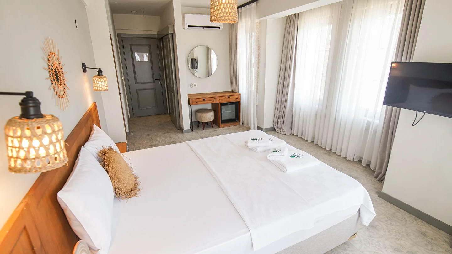 Marika Otel’in odaları aydınlık, ferah ve temiz tasarımlı olup, farklı oda tipleriyle çiftlerden ailelere kadar çeşitli konaklama ihtiyaçlarına uygundur. Birçok odadan bahçe ve deniz manzarası sunulur, böylece sabahları doğa ve denizle güne başlamak mümkündür.