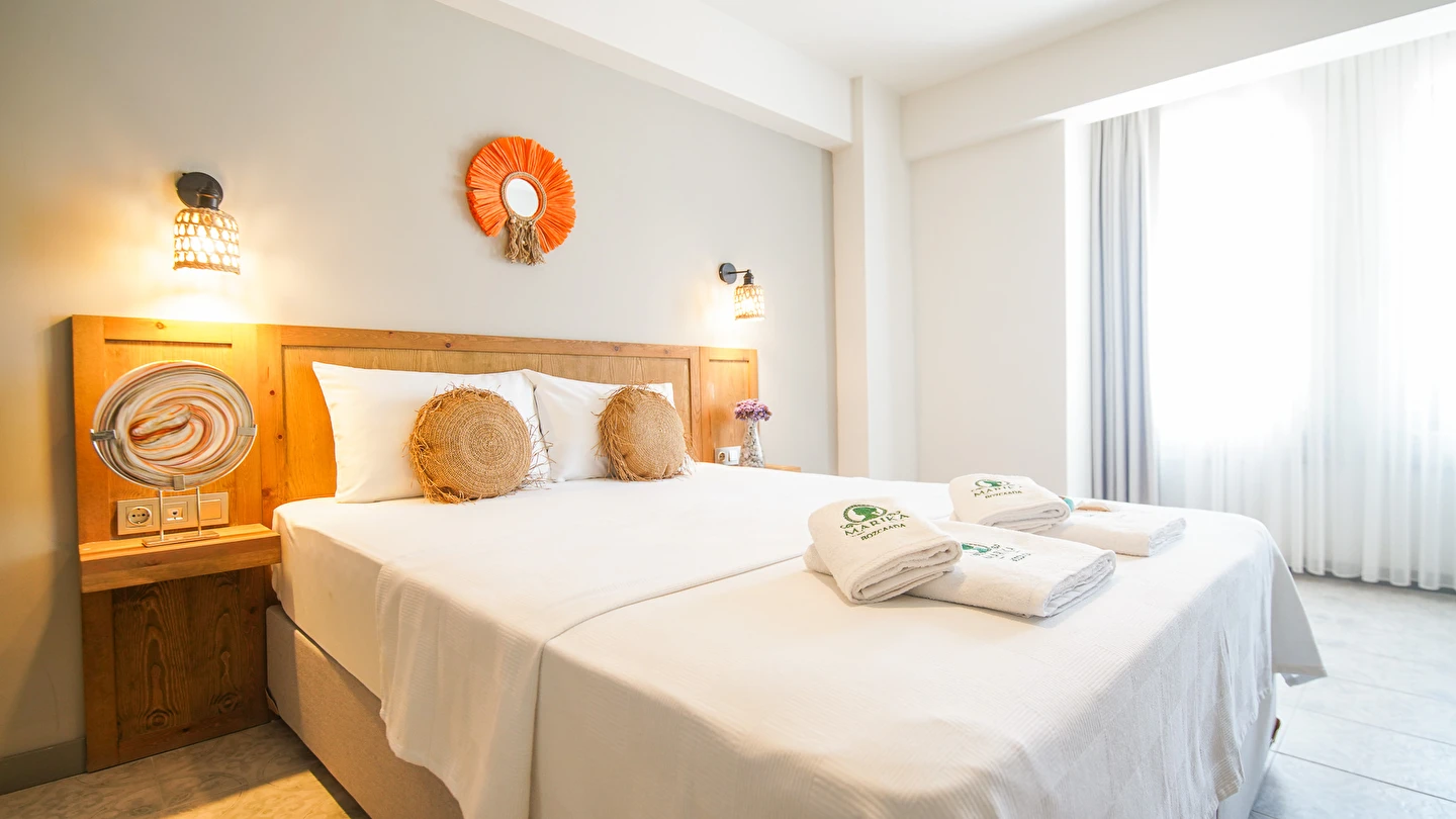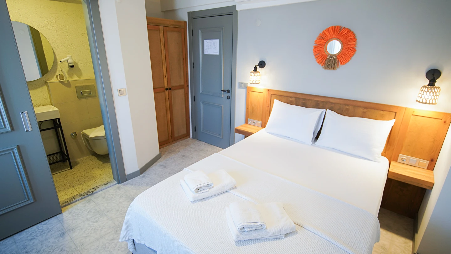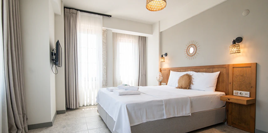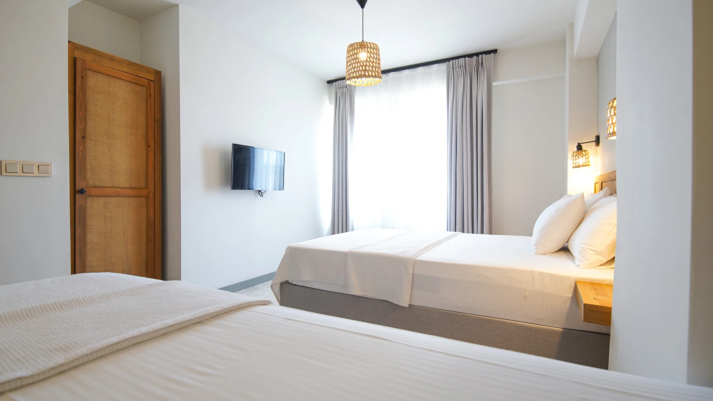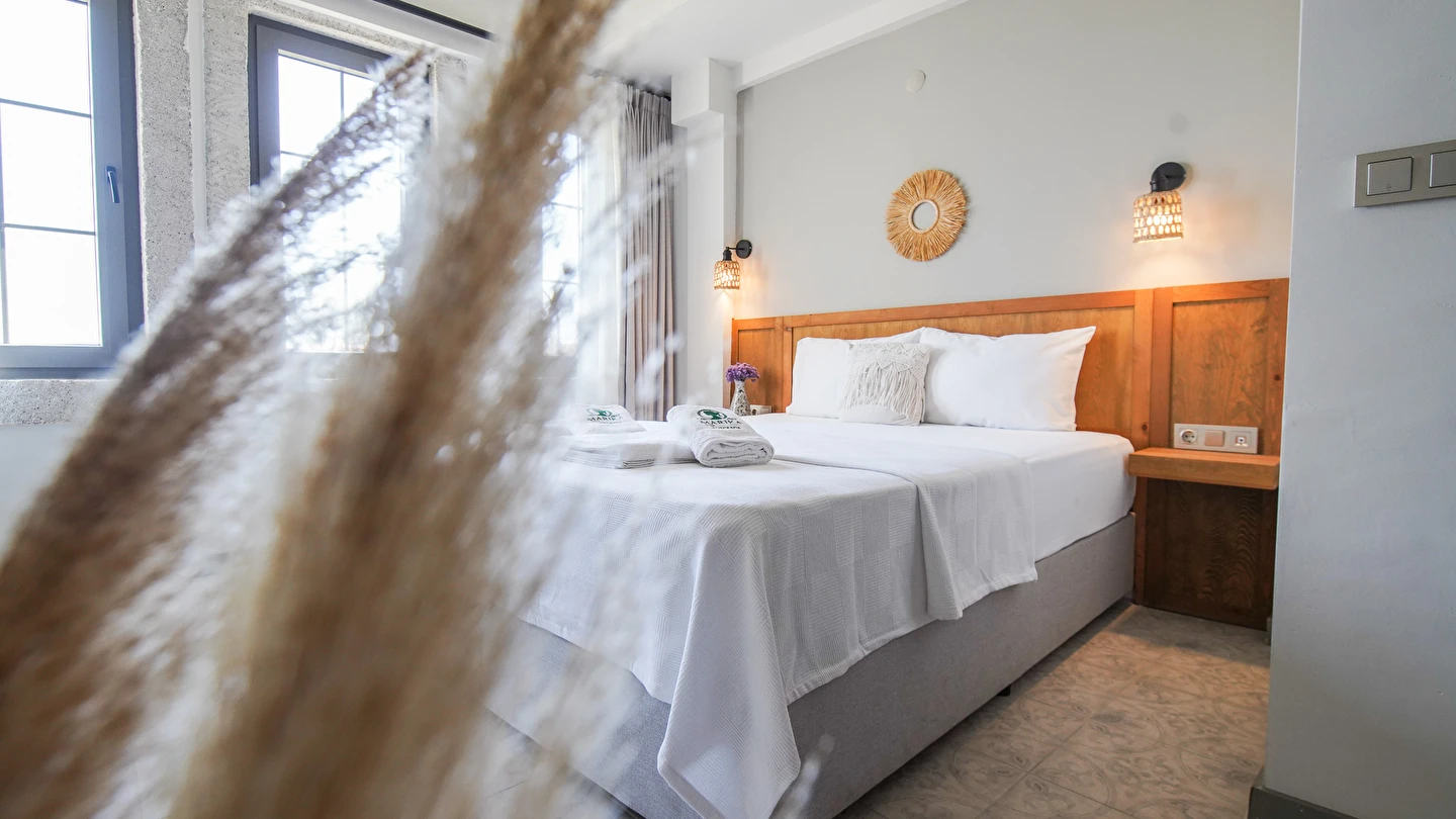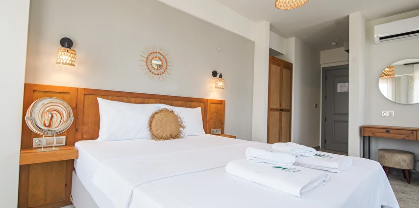 Marika Otel’in odaları aydınlık, ferah ve temiz tasarımlı olup, farklı oda tipleriyle çiftlerden ailelere kadar çeşitli konaklama ihtiyaçlarına uygundur. Birçok odadan bahçe ve deniz manzarası sunulur, böylece sabahları doğa ve denizle güne başlamak mümkündür.