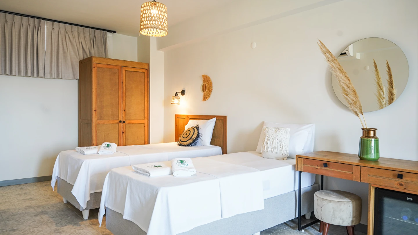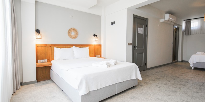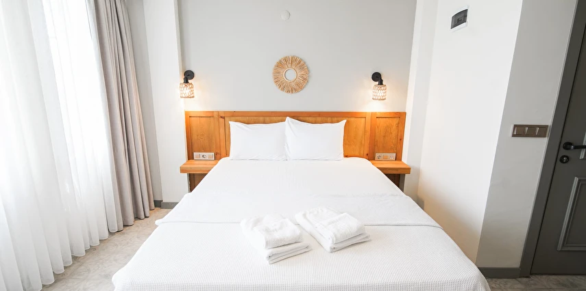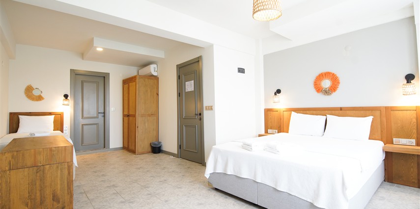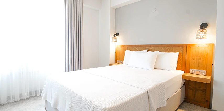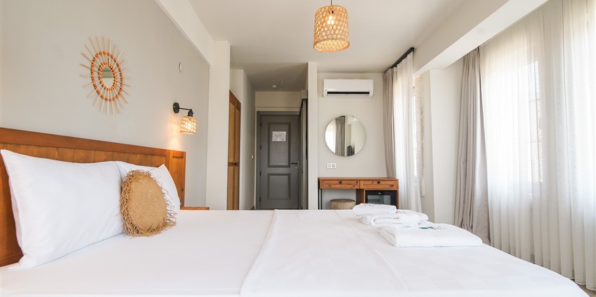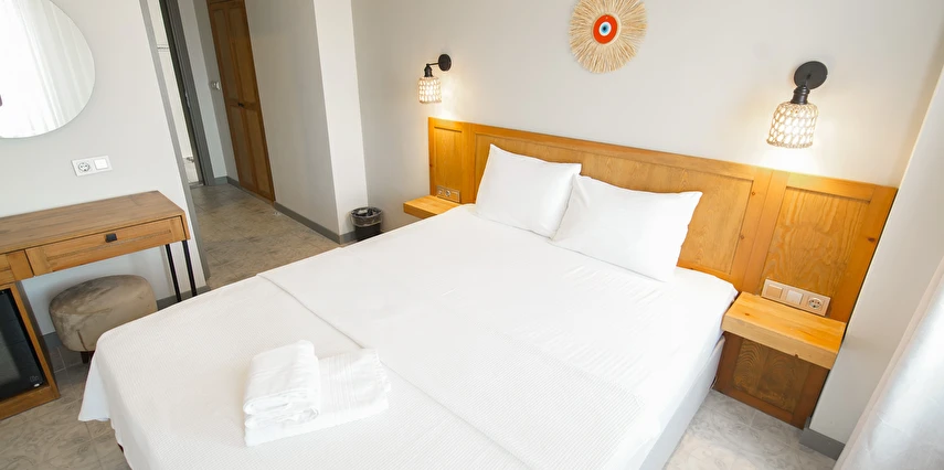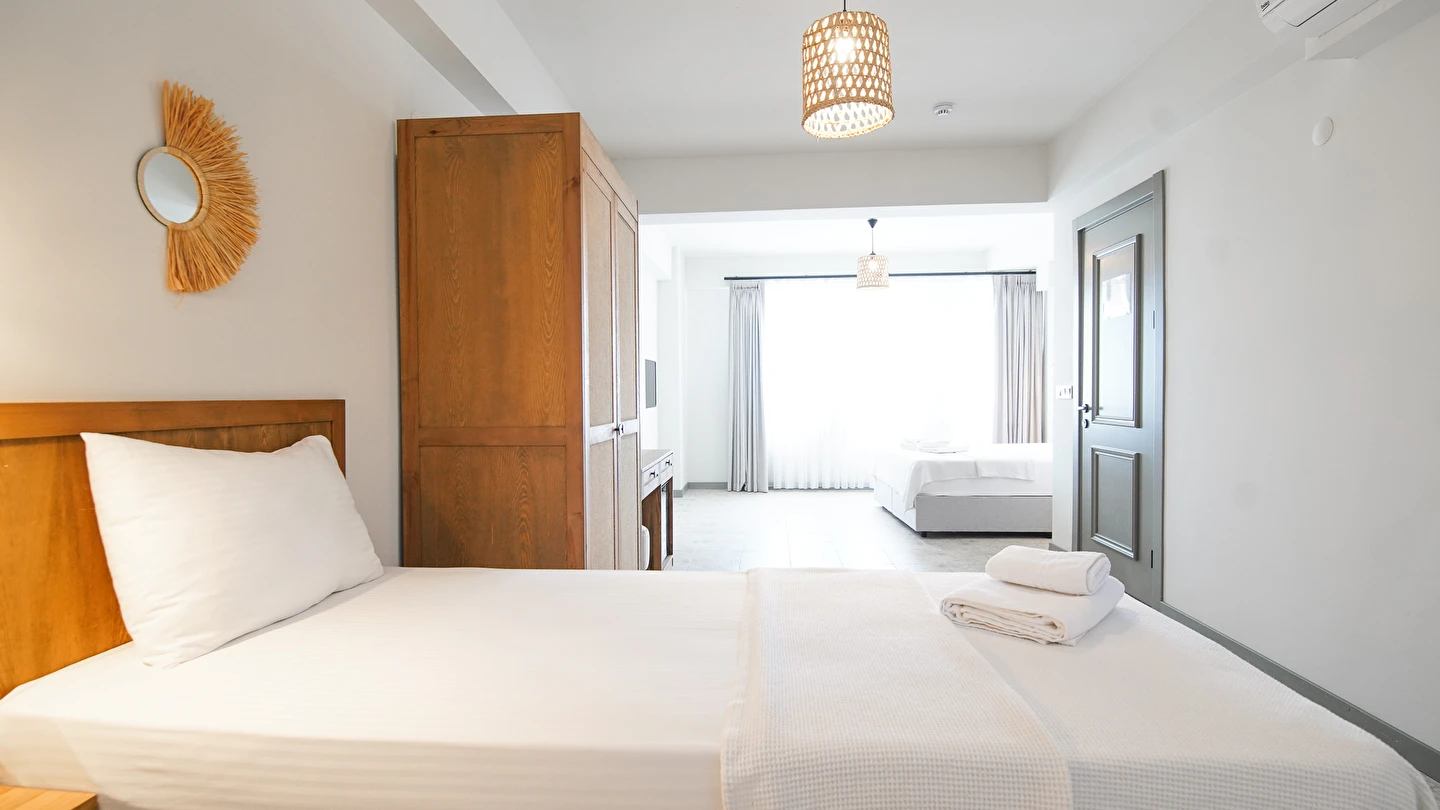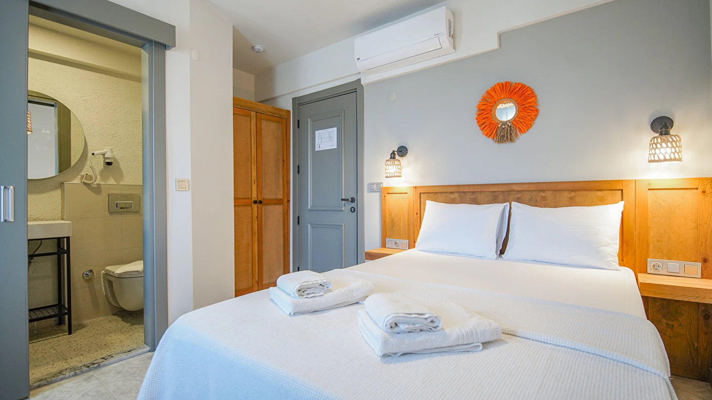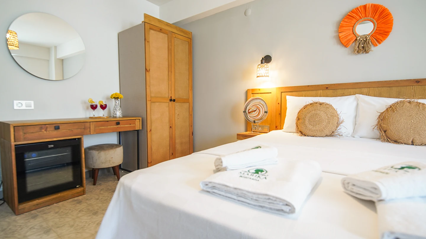 Marika Otel’in odaları aydınlık, ferah ve temiz tasarımlı olup, farklı oda tipleriyle çiftlerden ailelere kadar çeşitli konaklama ihtiyaçlarına uygundur. Birçok odadan bahçe ve deniz manzarası sunulur, böylece sabahları doğa ve denizle güne başlamak mümkündür.