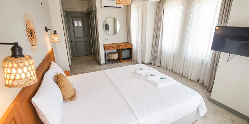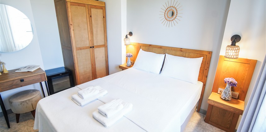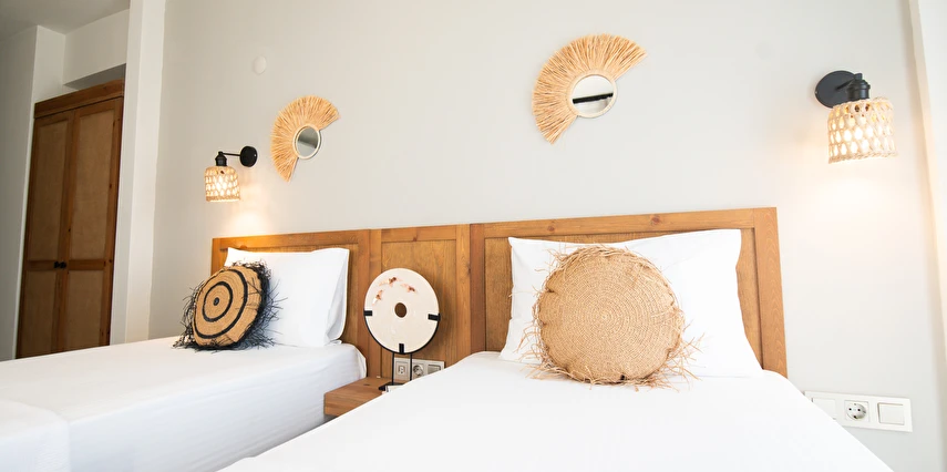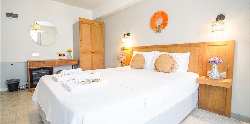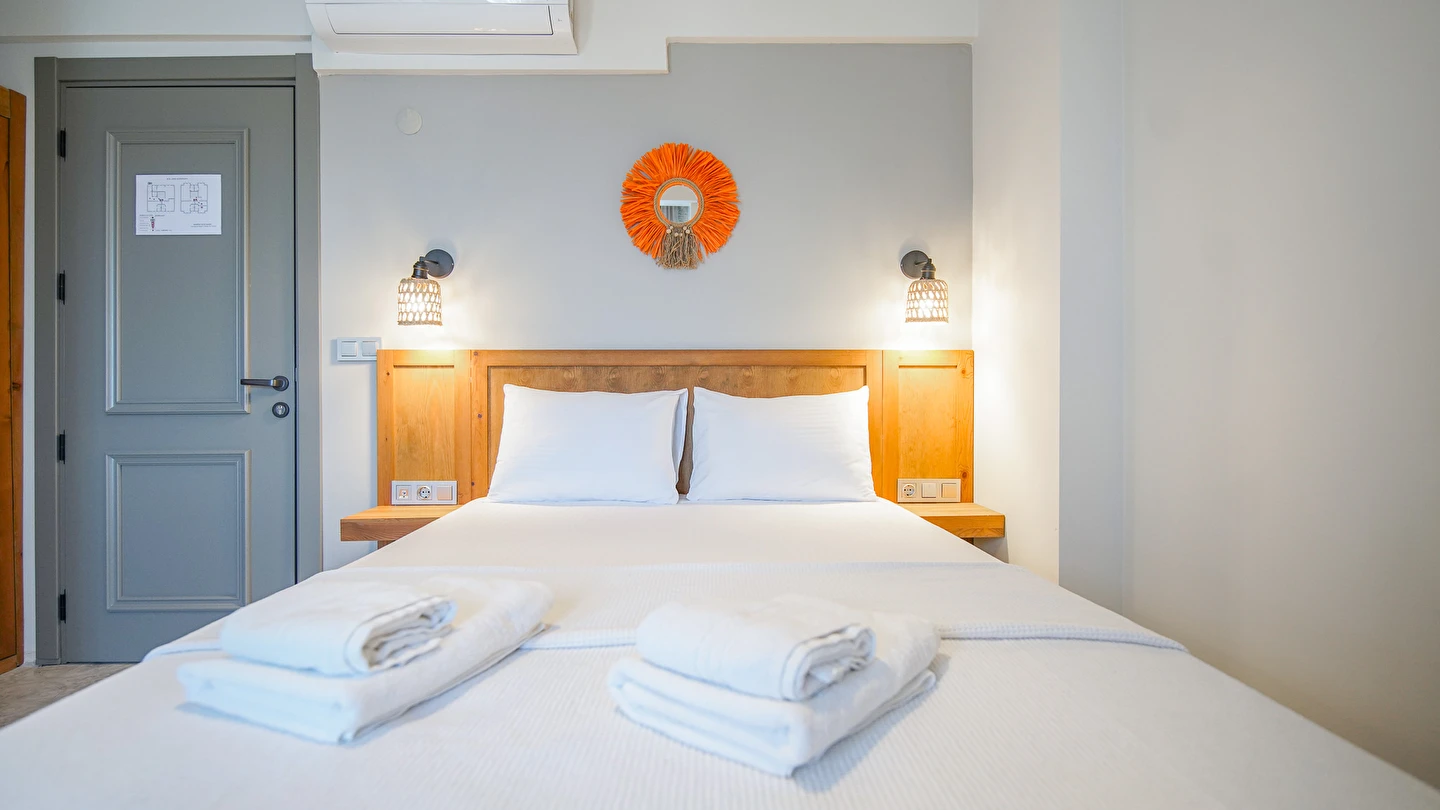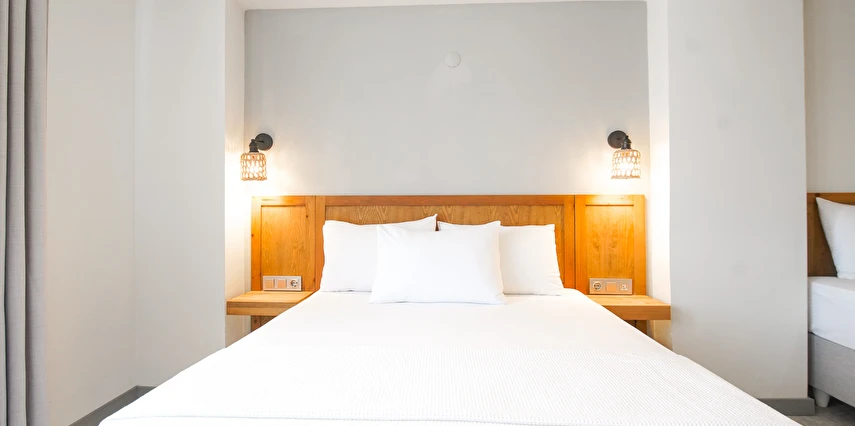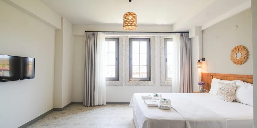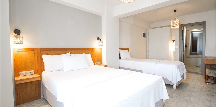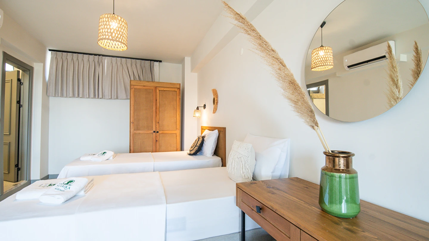 Marika Otel’in odaları aydınlık, ferah ve temiz tasarımlı olup, farklı oda tipleriyle çiftlerden ailelere kadar çeşitli konaklama ihtiyaçlarına uygundur. Birçok odadan bahçe ve deniz manzarası sunulur, böylece sabahları doğa ve denizle güne başlamak mümkündür.