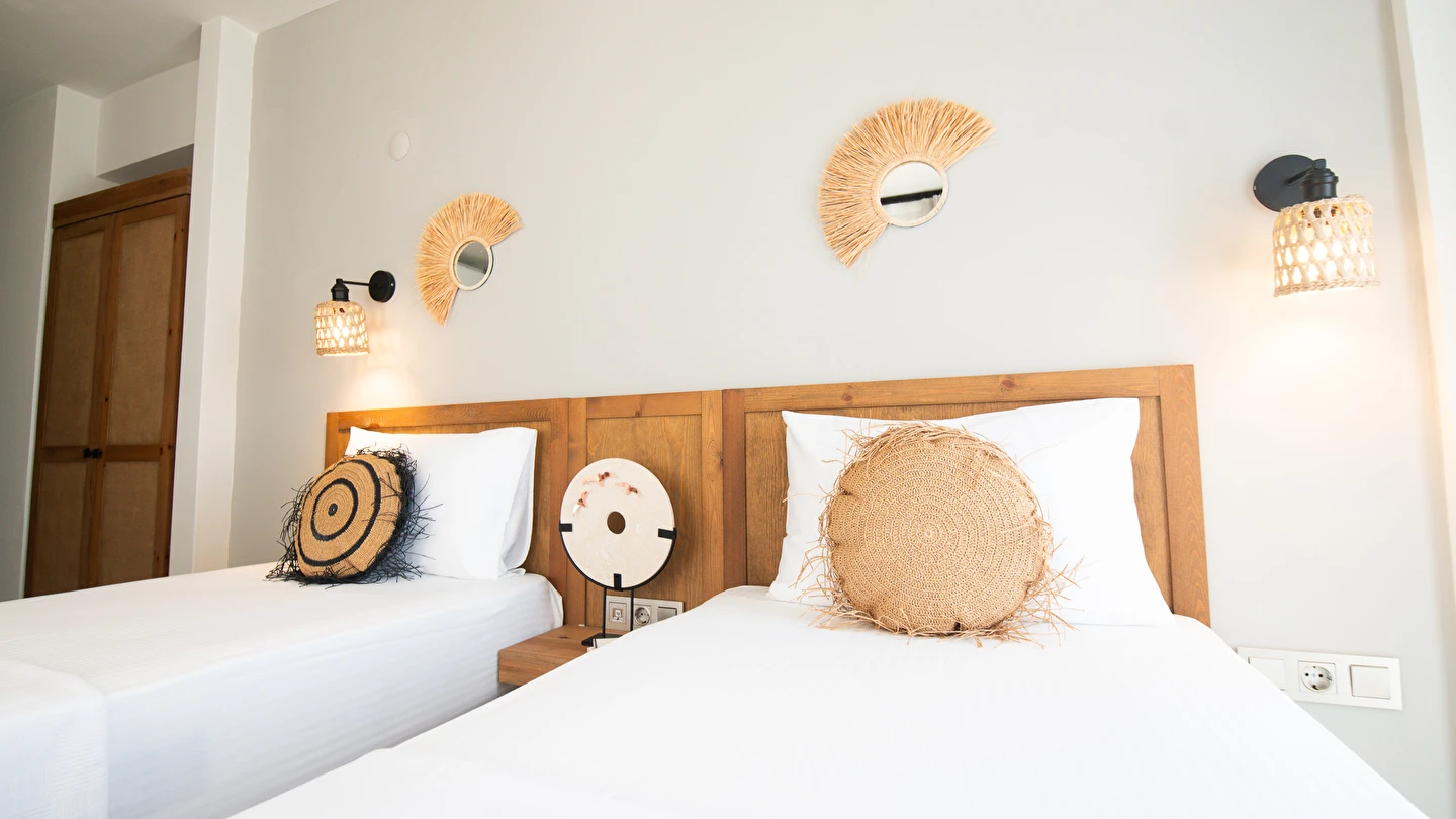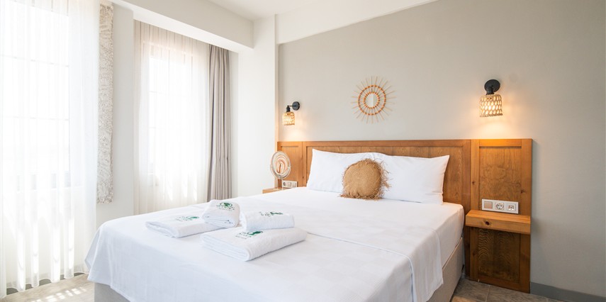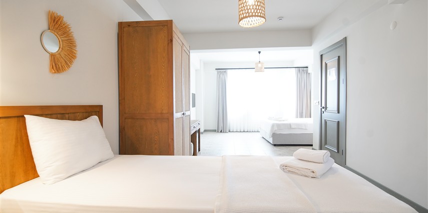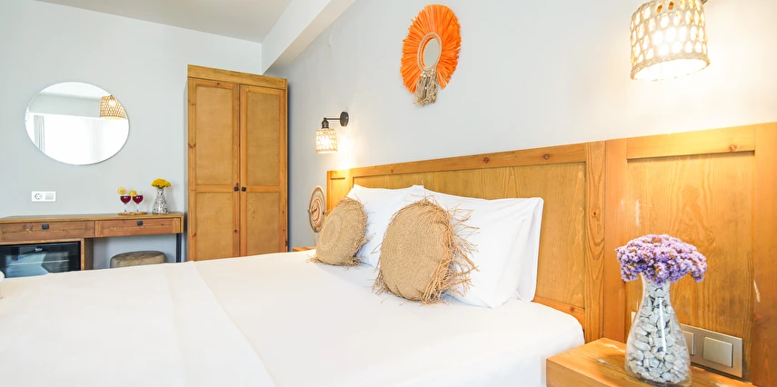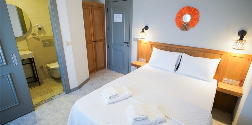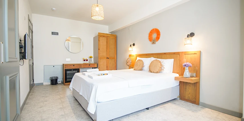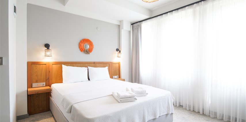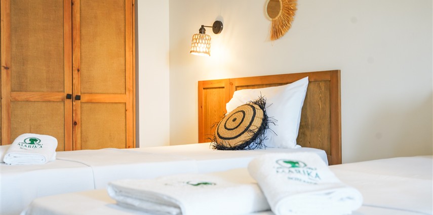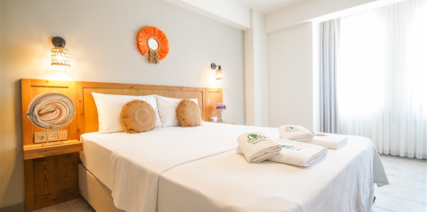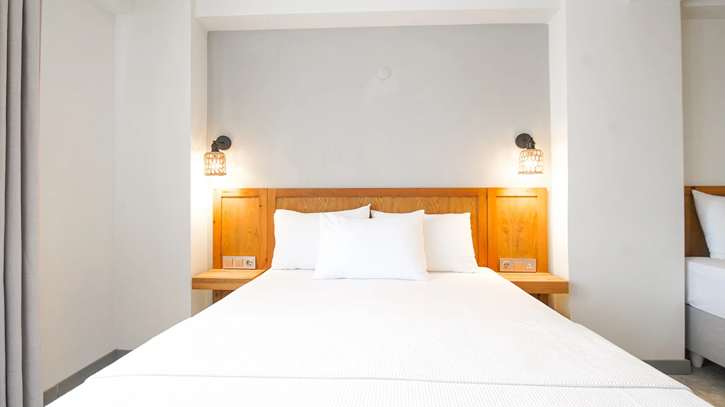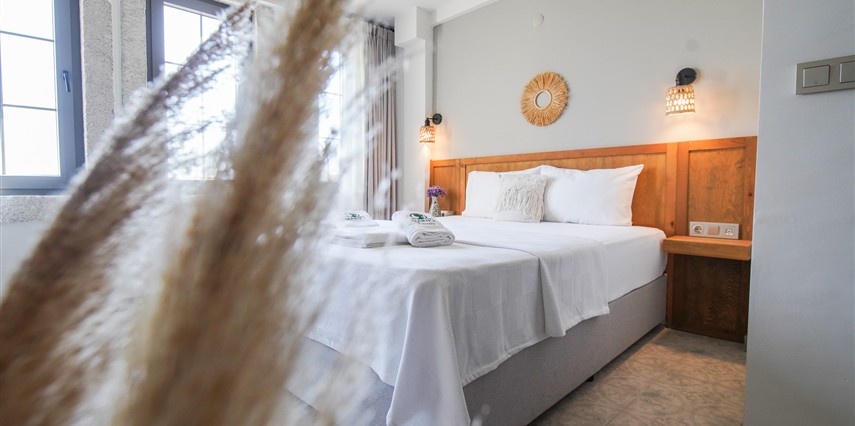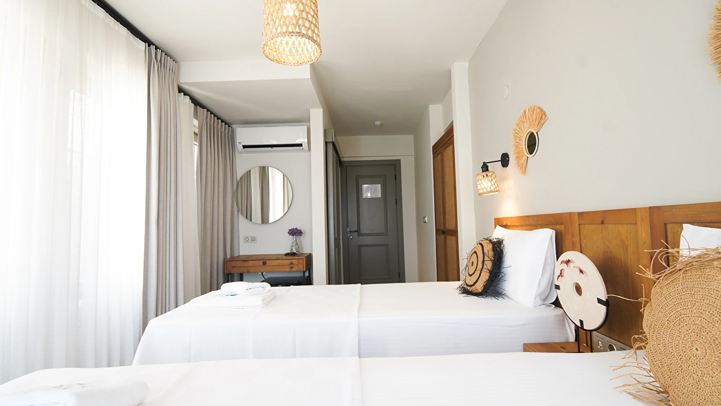 Marika Otel’in odaları aydınlık, ferah ve temiz tasarımlı olup, farklı oda tipleriyle çiftlerden ailelere kadar çeşitli konaklama ihtiyaçlarına uygundur. Birçok odadan bahçe ve deniz manzarası sunulur, böylece sabahları doğa ve denizle güne başlamak mümkündür.