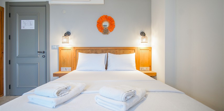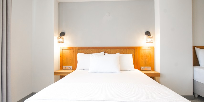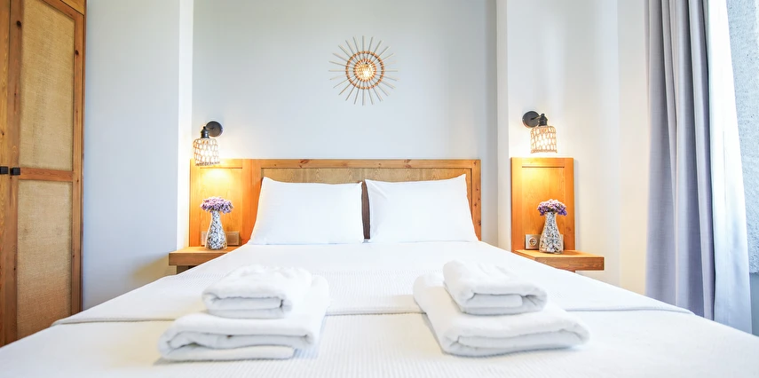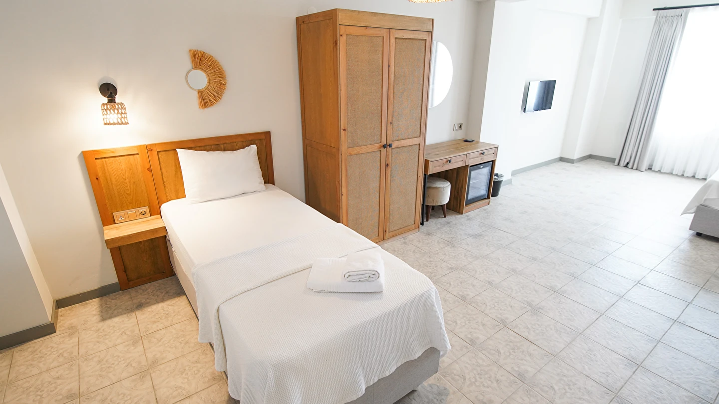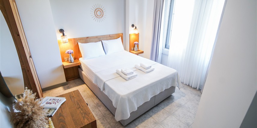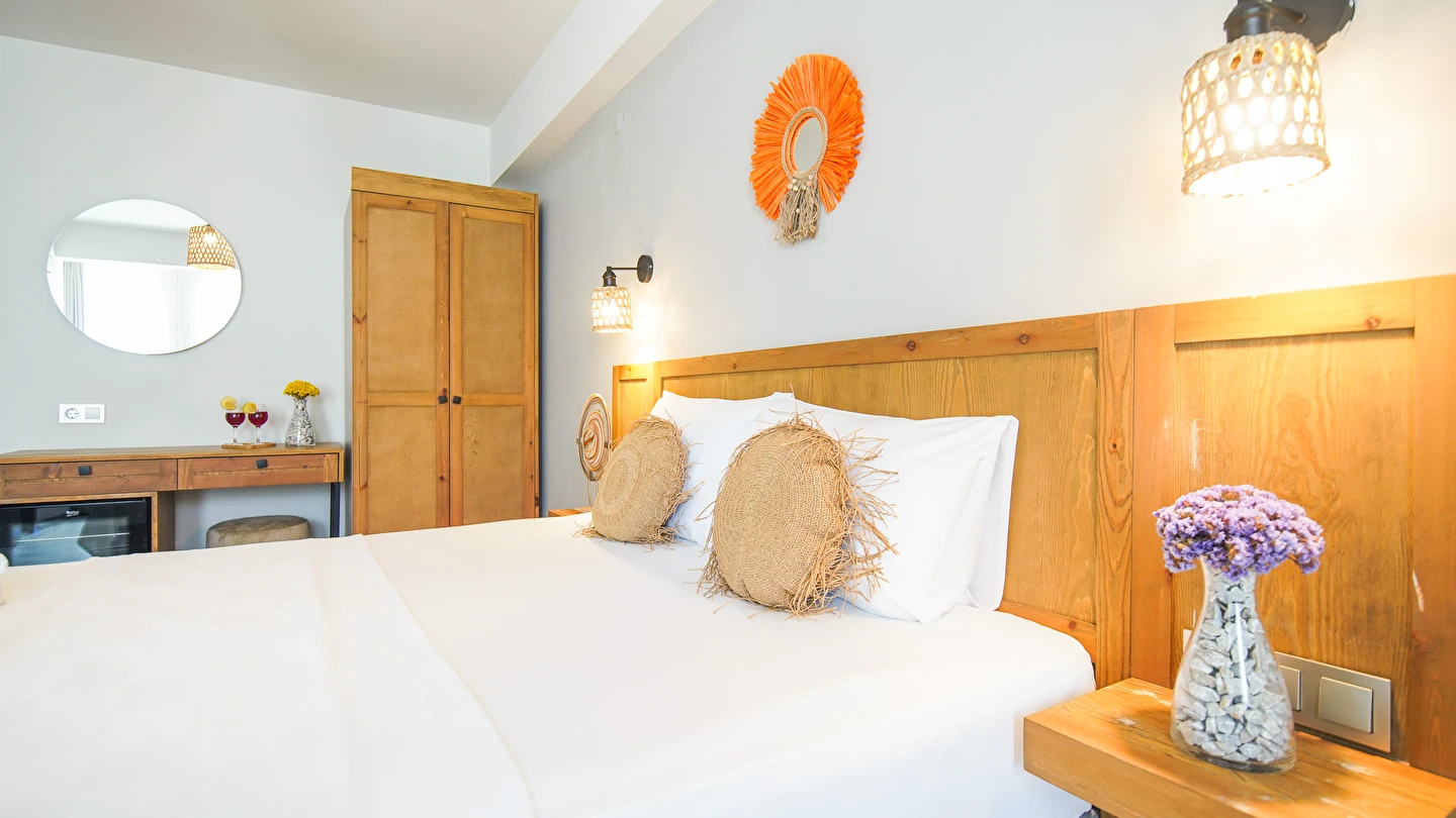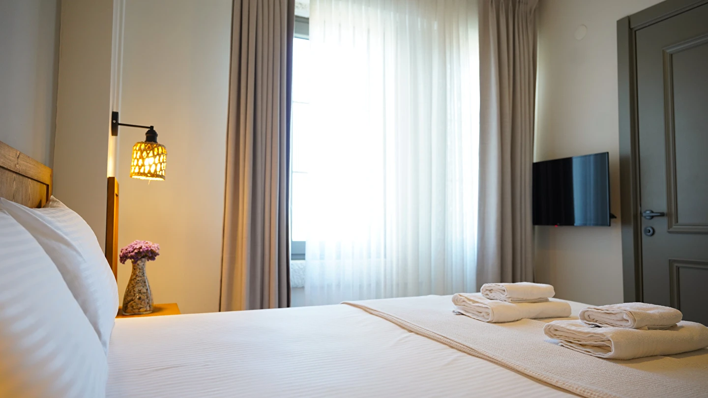 Marika Otel’in odaları aydınlık, ferah ve temiz tasarımlı olup, farklı oda tipleriyle çiftlerden ailelere kadar çeşitli konaklama ihtiyaçlarına uygundur. Birçok odadan bahçe ve deniz manzarası sunulur, böylece sabahları doğa ve denizle güne başlamak mümkündür.