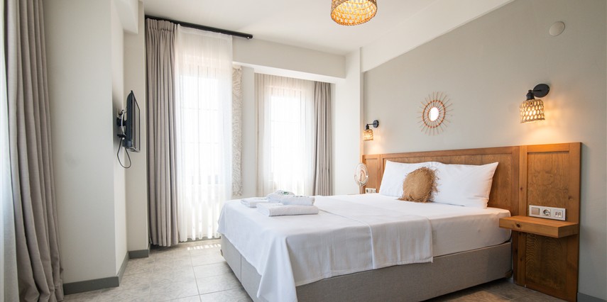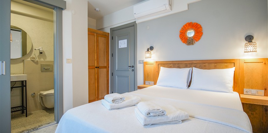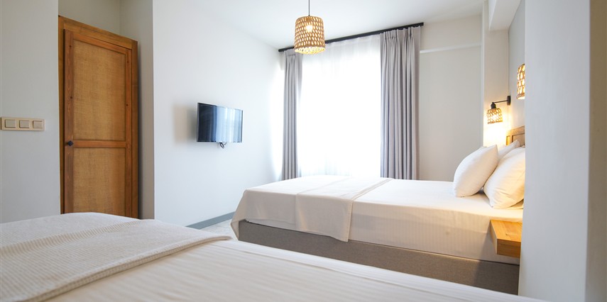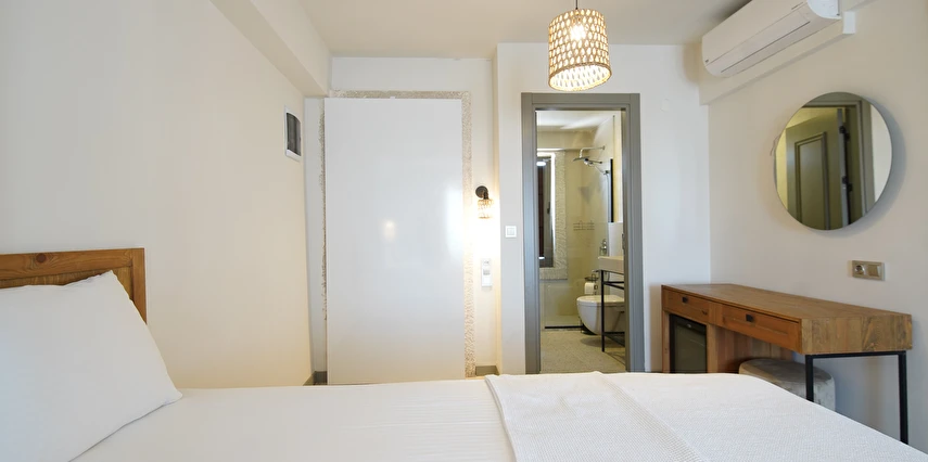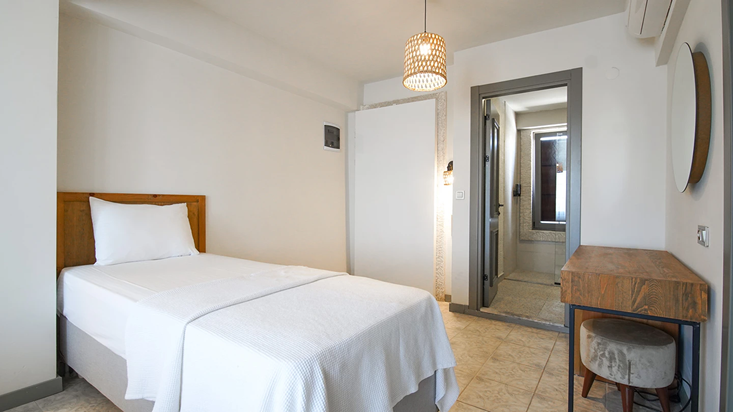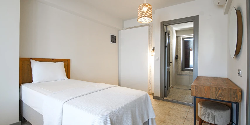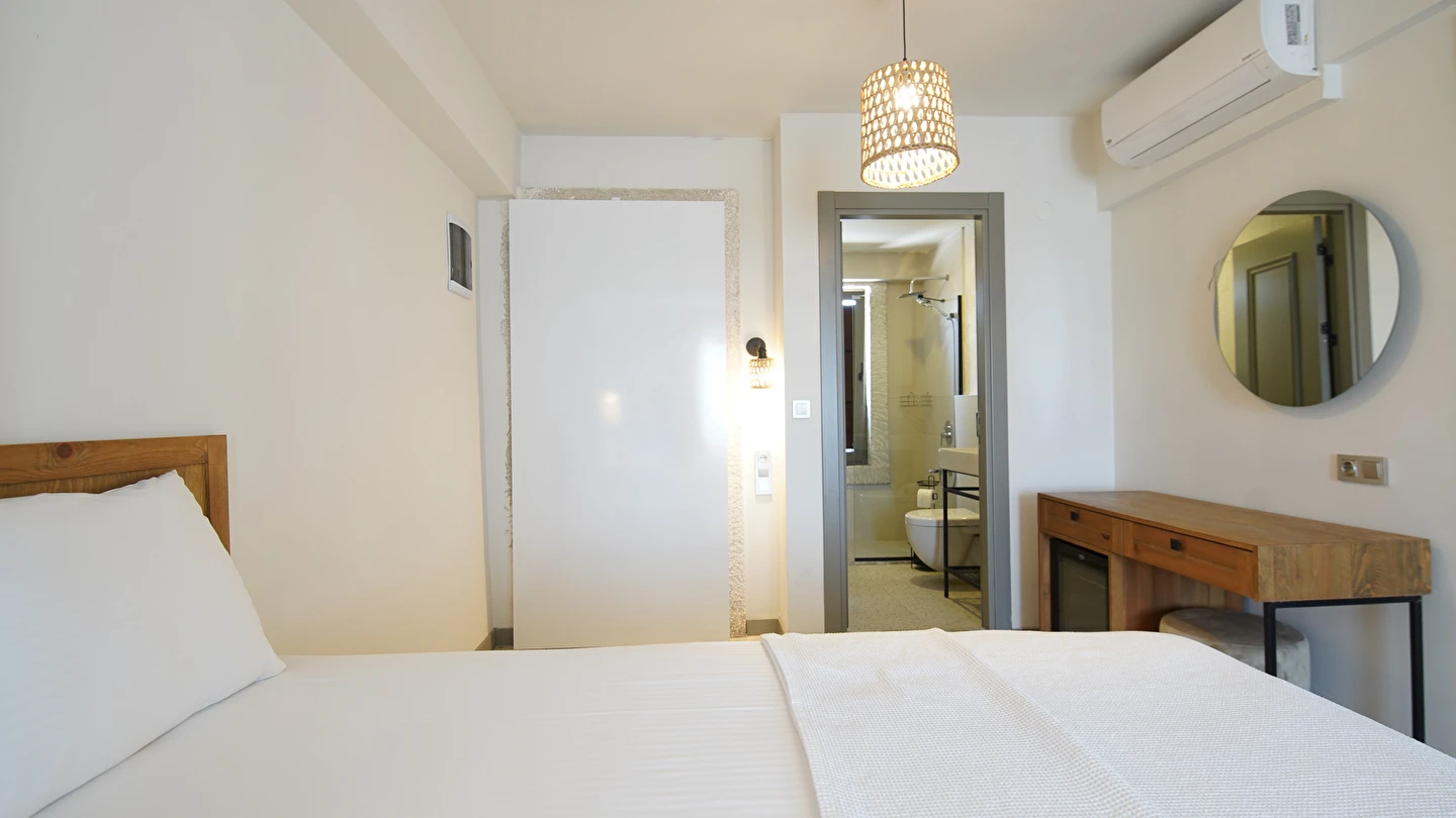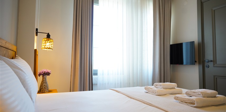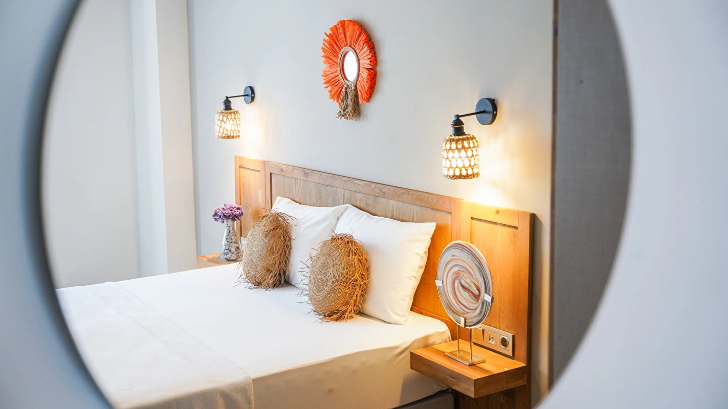 Marika Otel’in odaları aydınlık, ferah ve temiz tasarımlı olup, farklı oda tipleriyle çiftlerden ailelere kadar çeşitli konaklama ihtiyaçlarına uygundur. Birçok odadan bahçe ve deniz manzarası sunulur, böylece sabahları doğa ve denizle güne başlamak mümkündür.