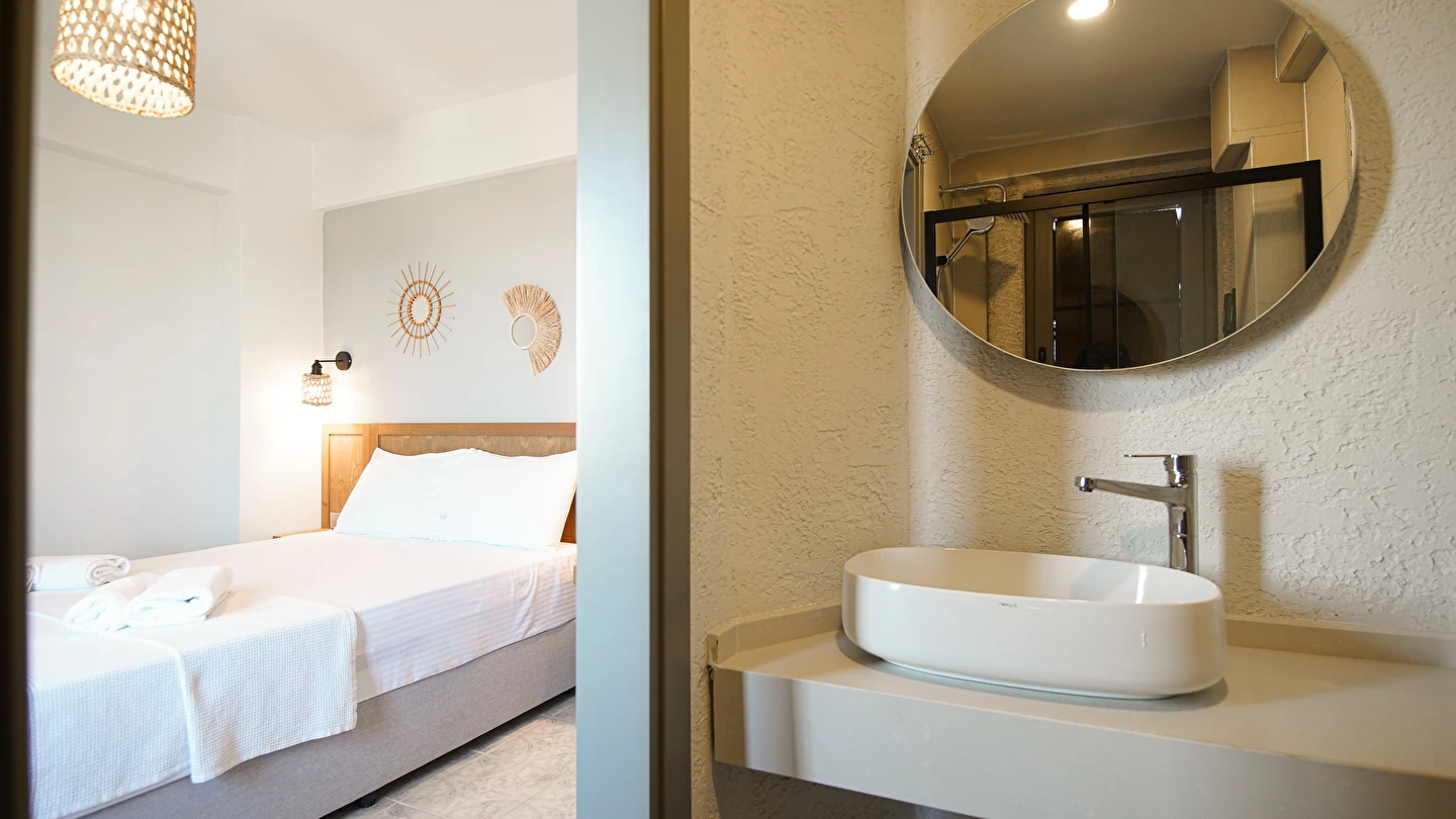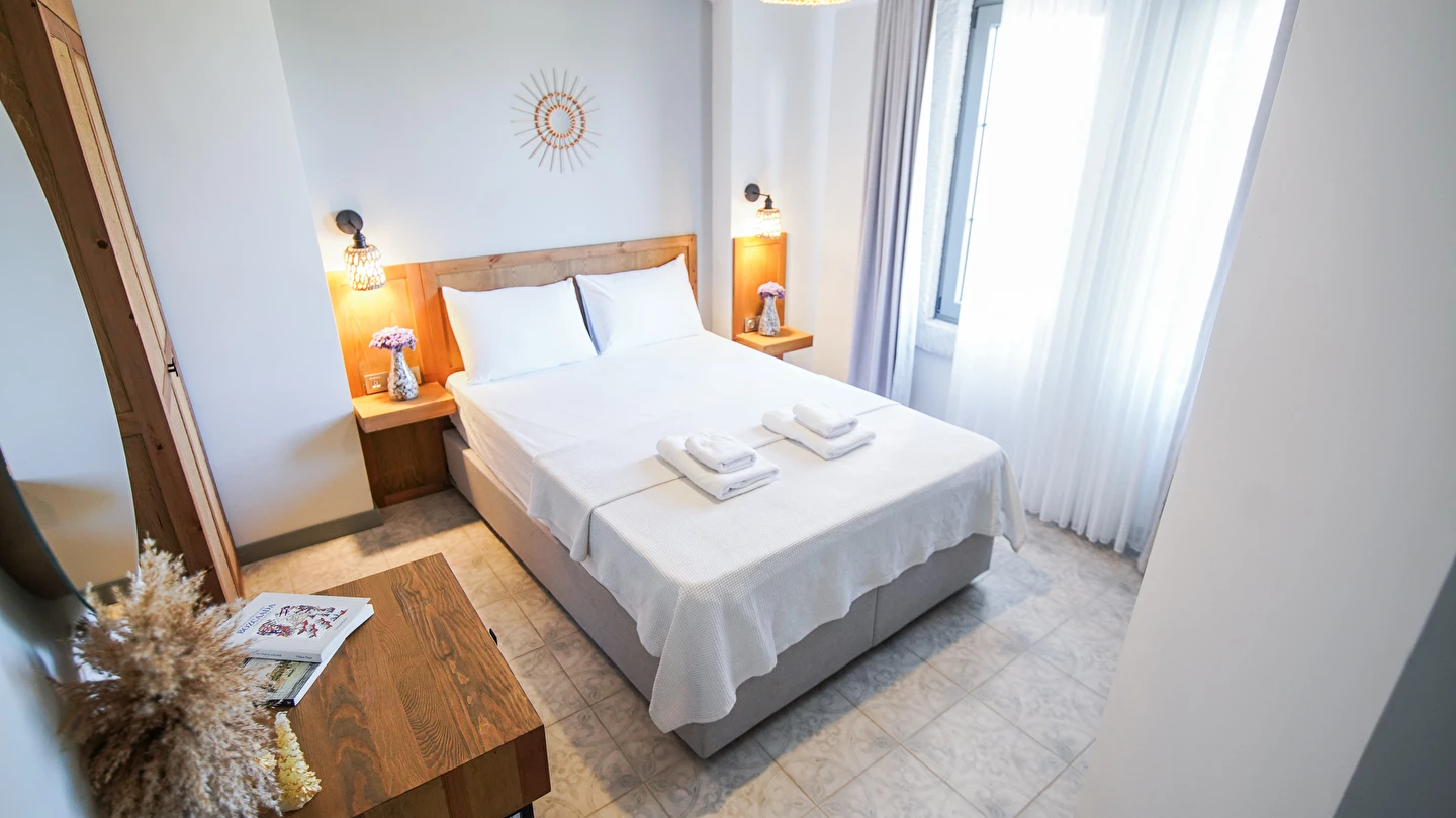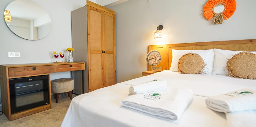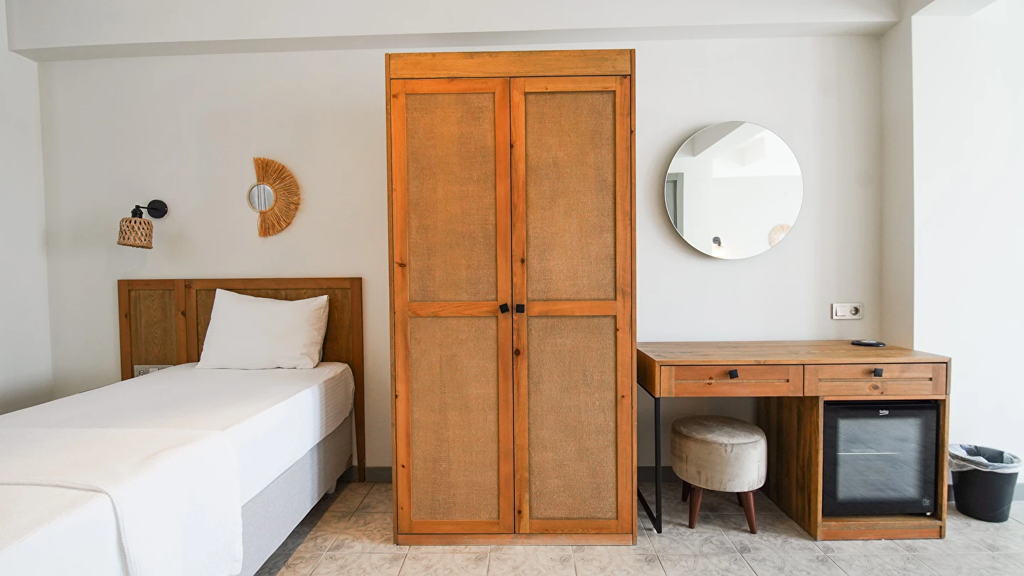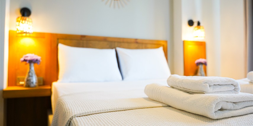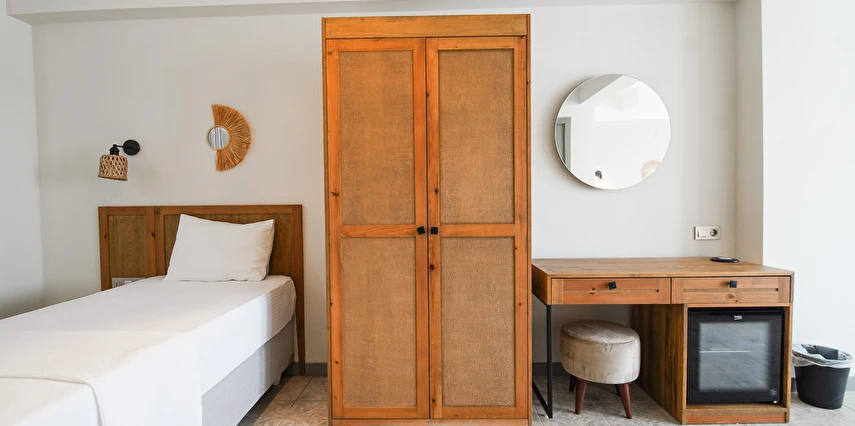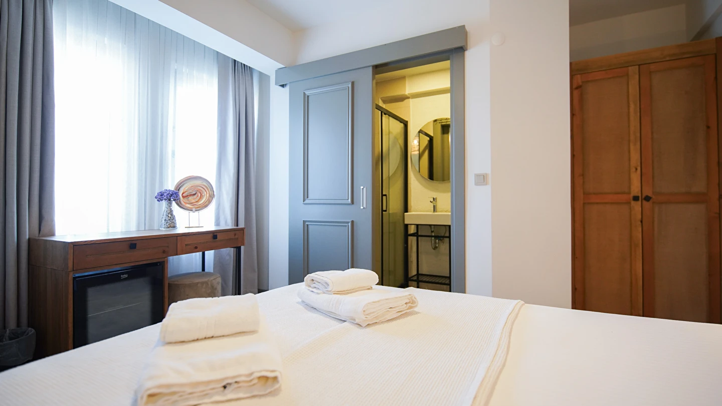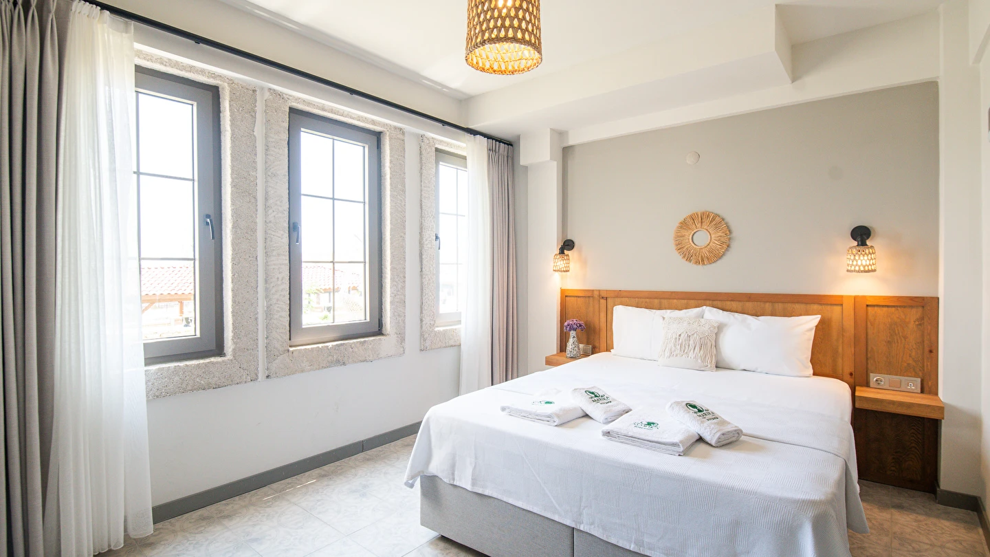 Marika Otel’in odaları aydınlık, ferah ve temiz tasarımlı olup, farklı oda tipleriyle çiftlerden ailelere kadar çeşitli konaklama ihtiyaçlarına uygundur. Birçok odadan bahçe ve deniz manzarası sunulur, böylece sabahları doğa ve denizle güne başlamak mümkündür.