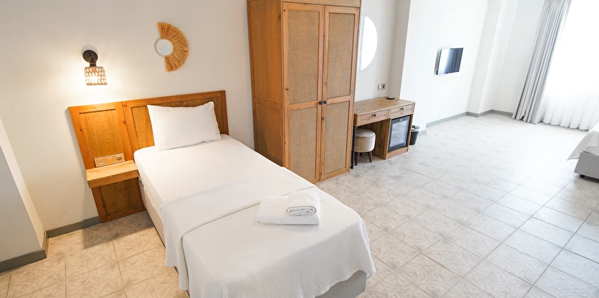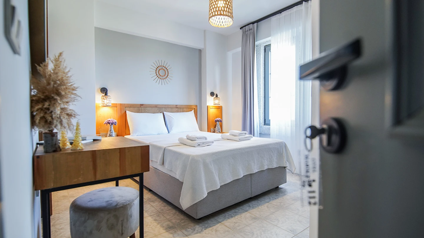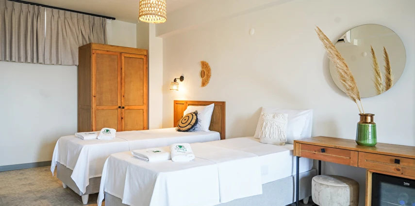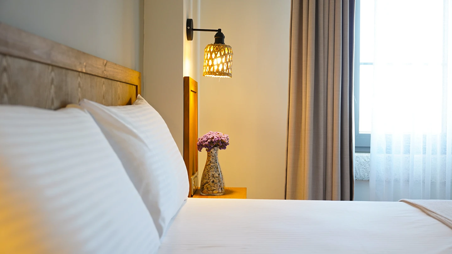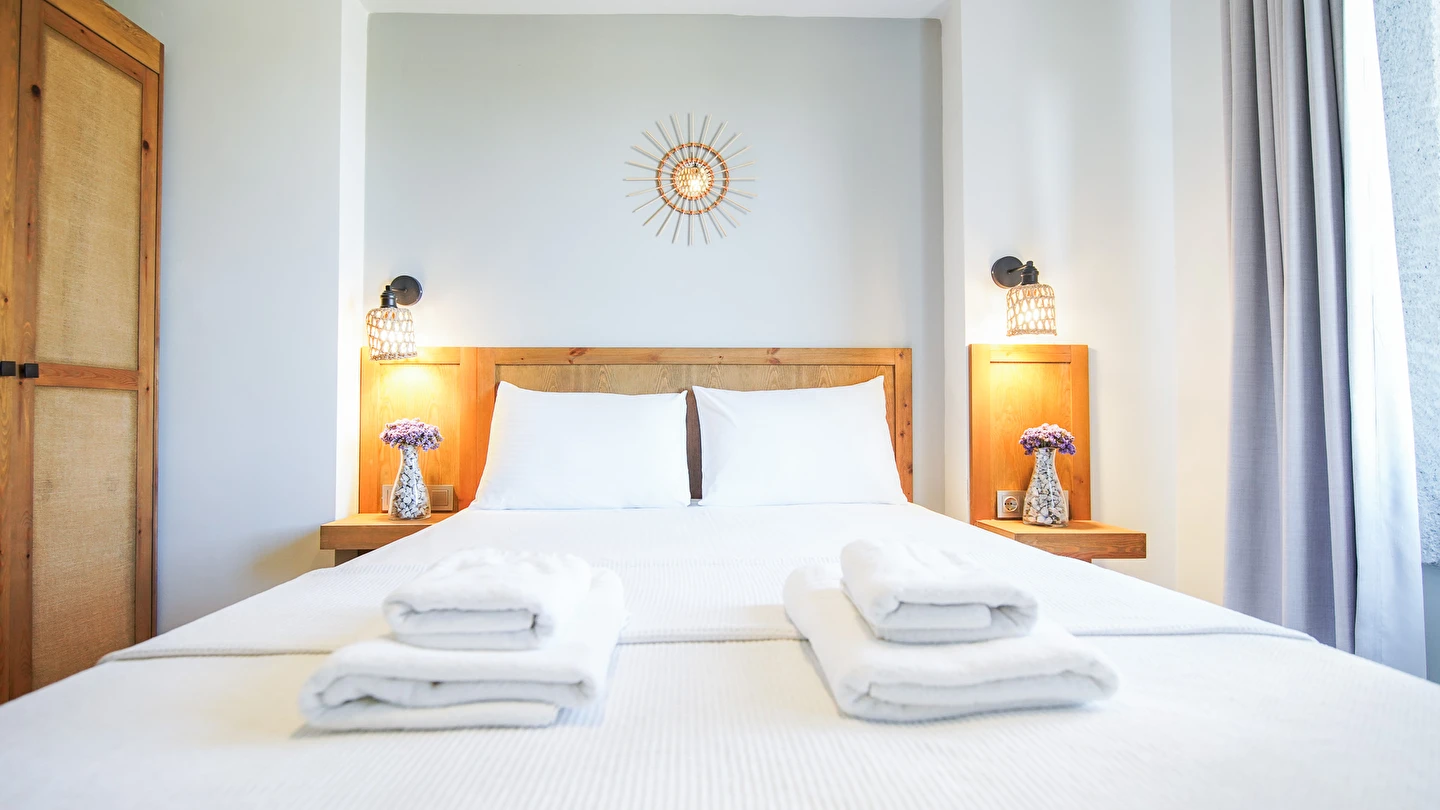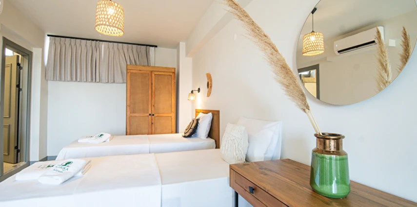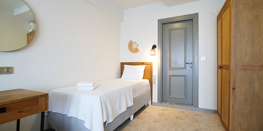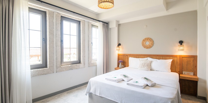 Marika Otel’in odaları aydınlık, ferah ve temiz tasarımlı olup, farklı oda tipleriyle çiftlerden ailelere kadar çeşitli konaklama ihtiyaçlarına uygundur. Birçok odadan bahçe ve deniz manzarası sunulur, böylece sabahları doğa ve denizle güne başlamak mümkündür.