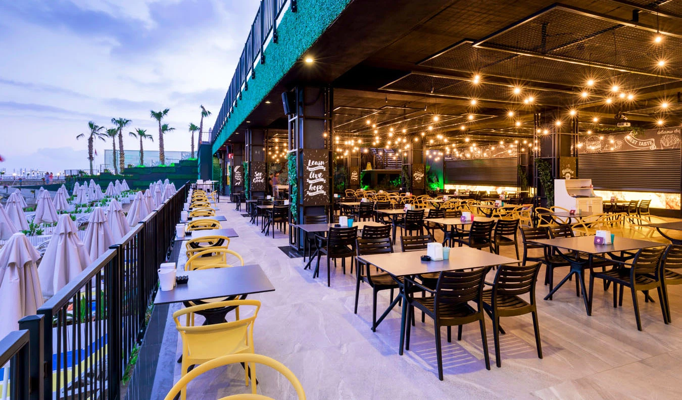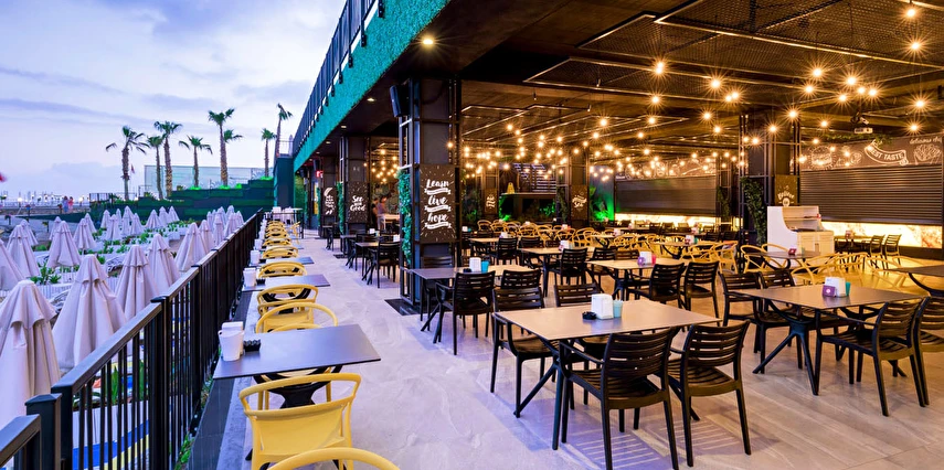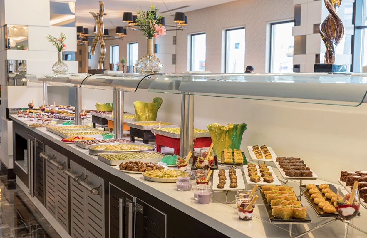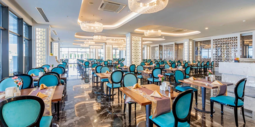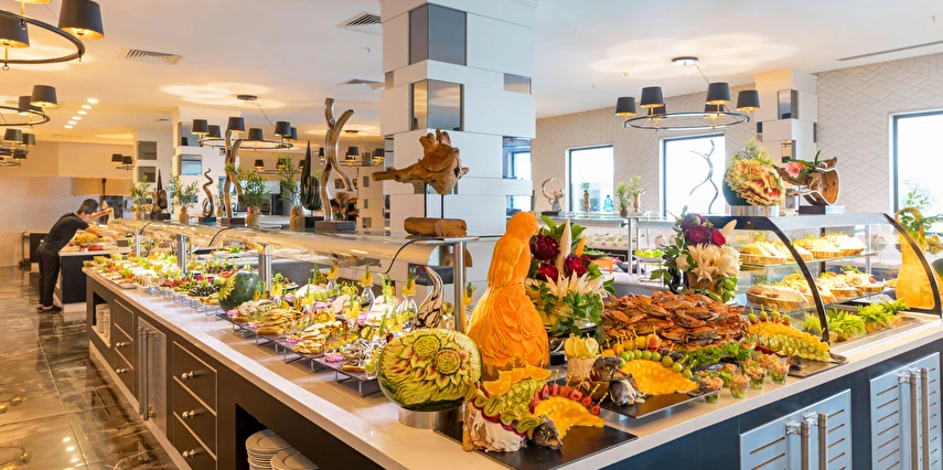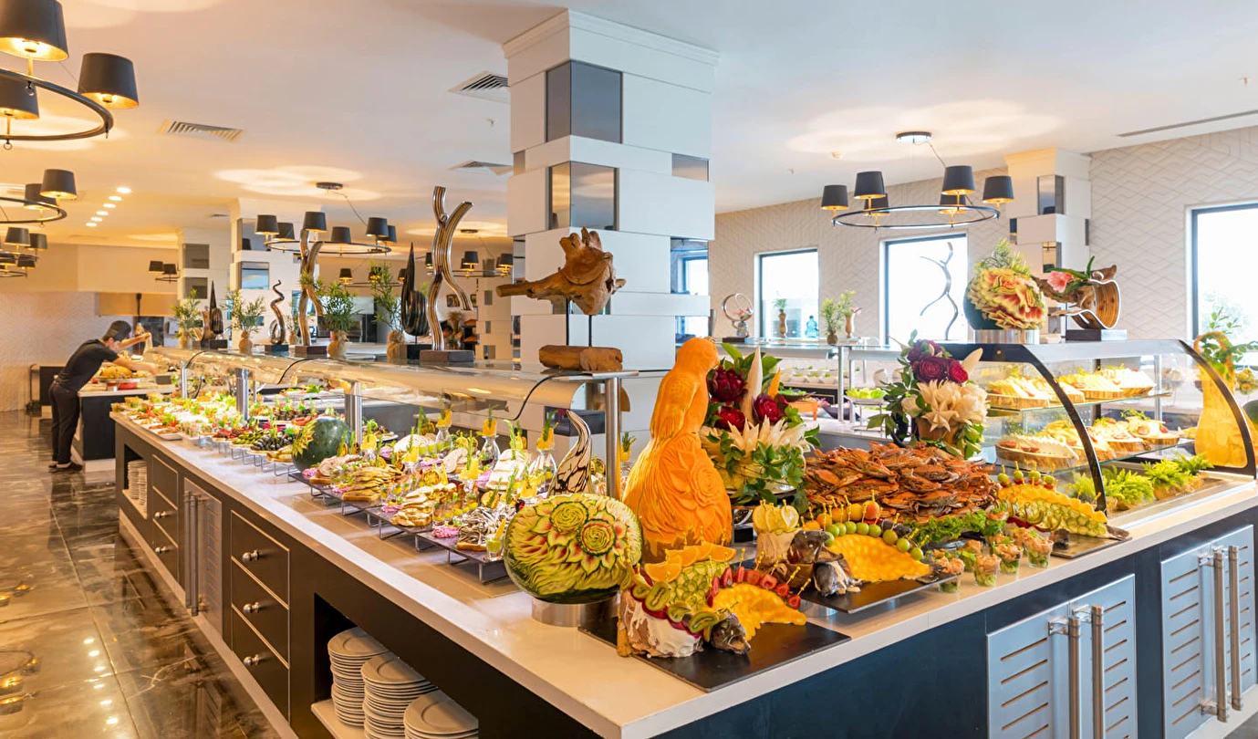 Sabah kahvaltısı, öğle ve akşam yemekleri açık büfe olup, tesisin belirlemiş olduğu markalar dahilinde 24 saat yerli alkollü ve alkolsüz içecekler ve bazı yabancı içecekler ücretsizdir. Türk Kahvesi ücretsizdir. Bazı İthal içecekler, kutu içecekler, paket dondurma ve taze sıkılmış meyve suları ücretli servis edilir.