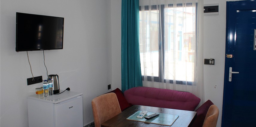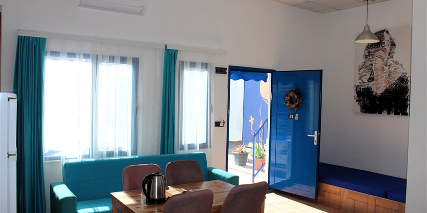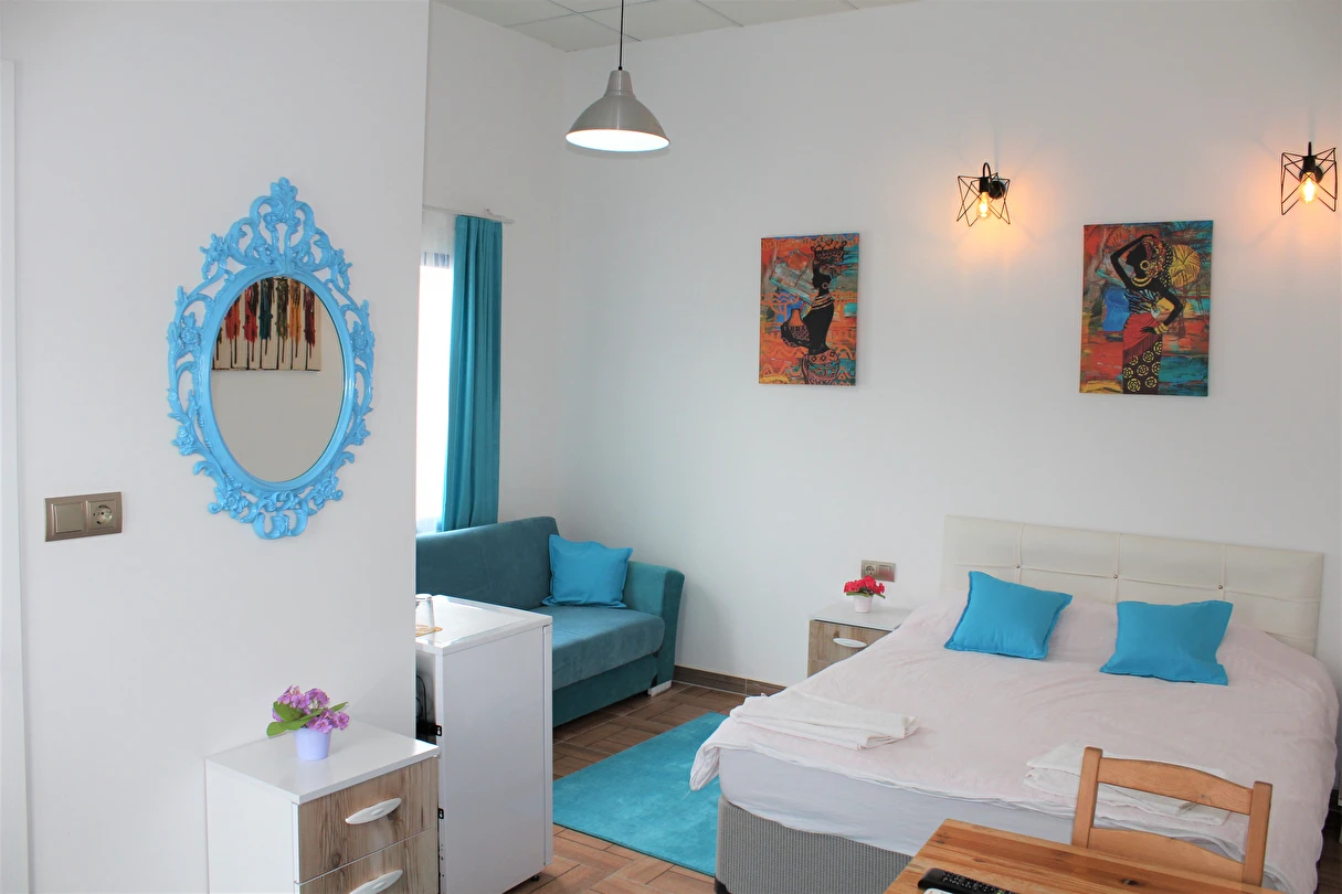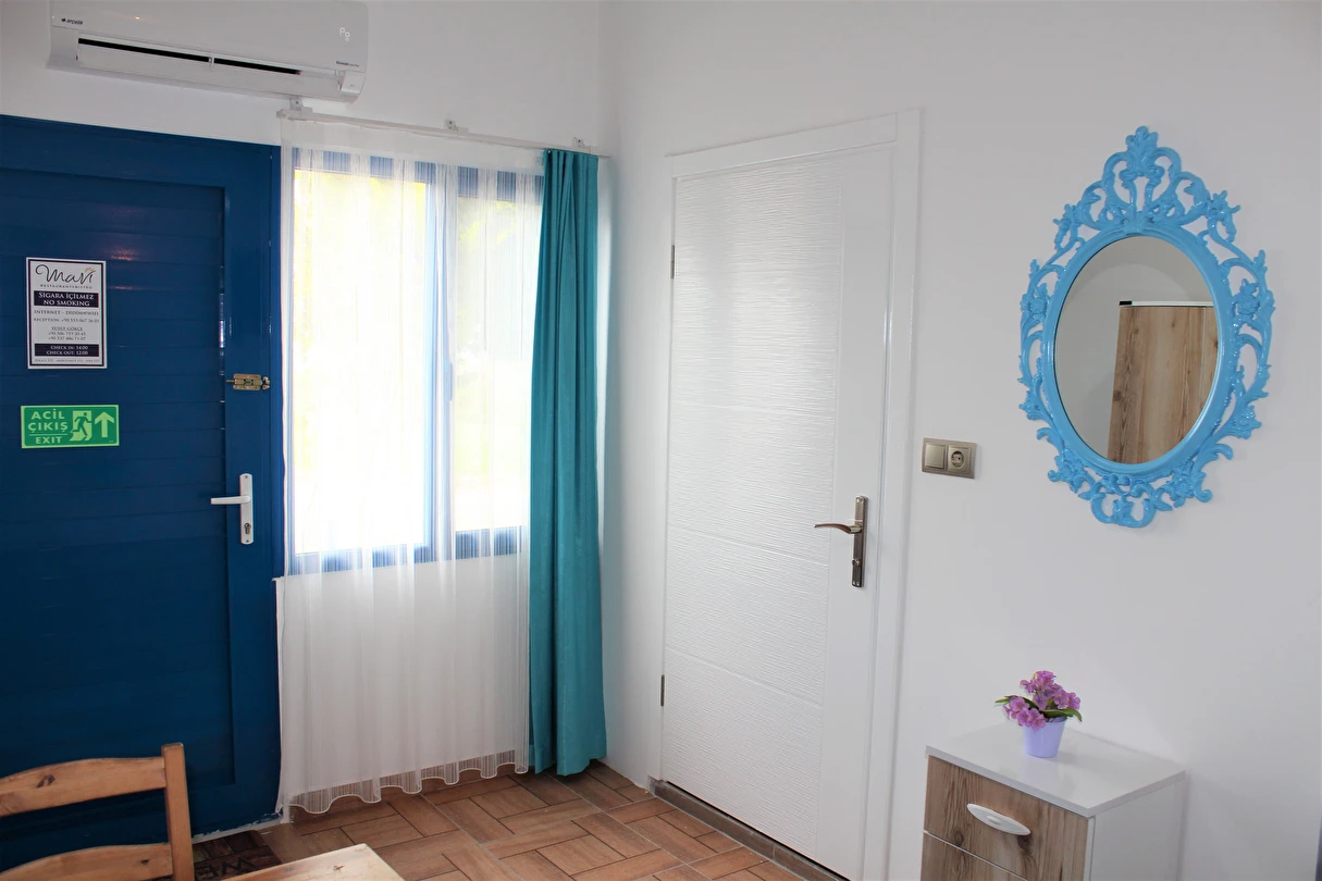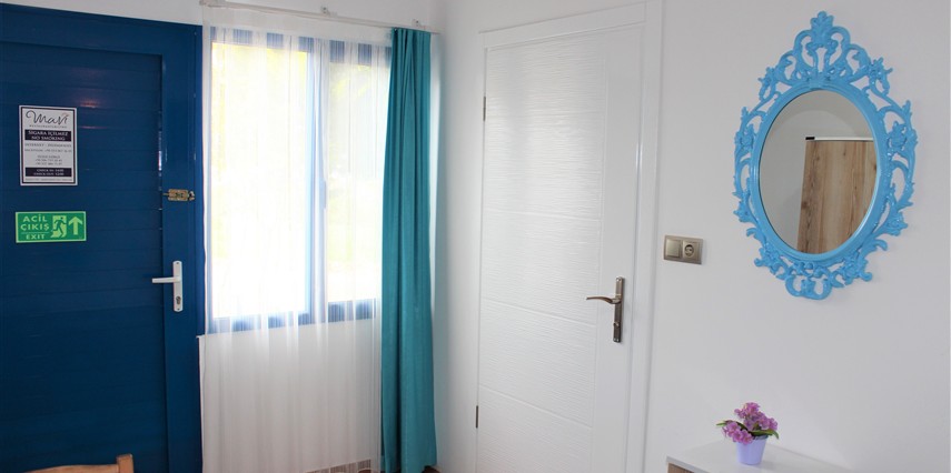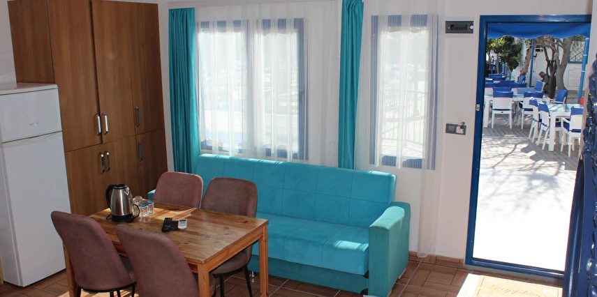 Mavi; Restaurant Hizmetinin Yanında Apart Daire ve Otel Odası Konseptinde Konaklama Hizmeti Vermektedir. Tüm Konaklamalarda Fiyatlandırmamız Kişi Sayısına Göre Yapılmaktadır. Restaurant Alanı İçerisinde Bulunan Ofisimiz Resepsiyon Olarak Kullanılmaktadır.