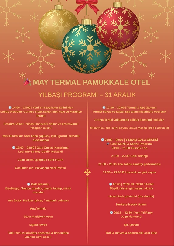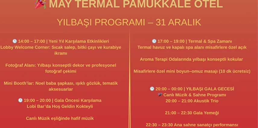 Termal suyun rahatlatıcı etkisini konforlu konaklama anlayışıyla birleştiren otel, hem kısa süreli termal kaçamaklar hem de uzun süreli konaklamalar için uygundur. Pamukkale’nin doğal ve tarihi güzelliklerine yakın konumuyla May Thermal Pamukkale Hotel, huzur dolu ve dengeli bir termal tatil arayanlar için öne çıkan bir seçenektir.
