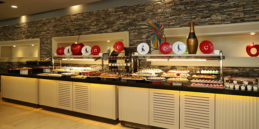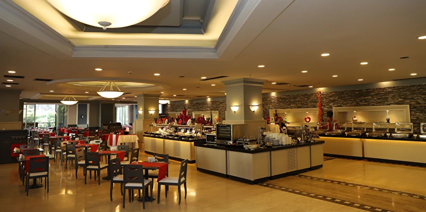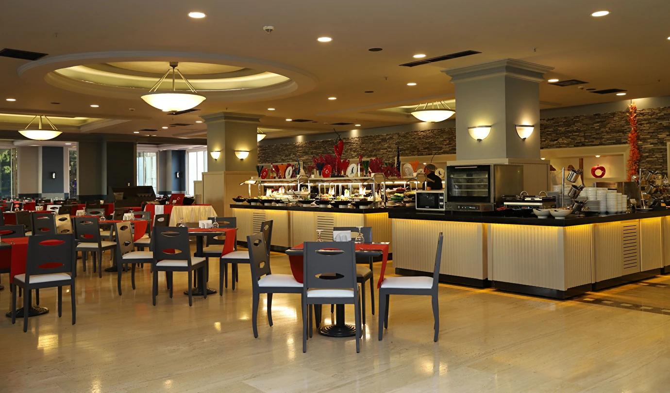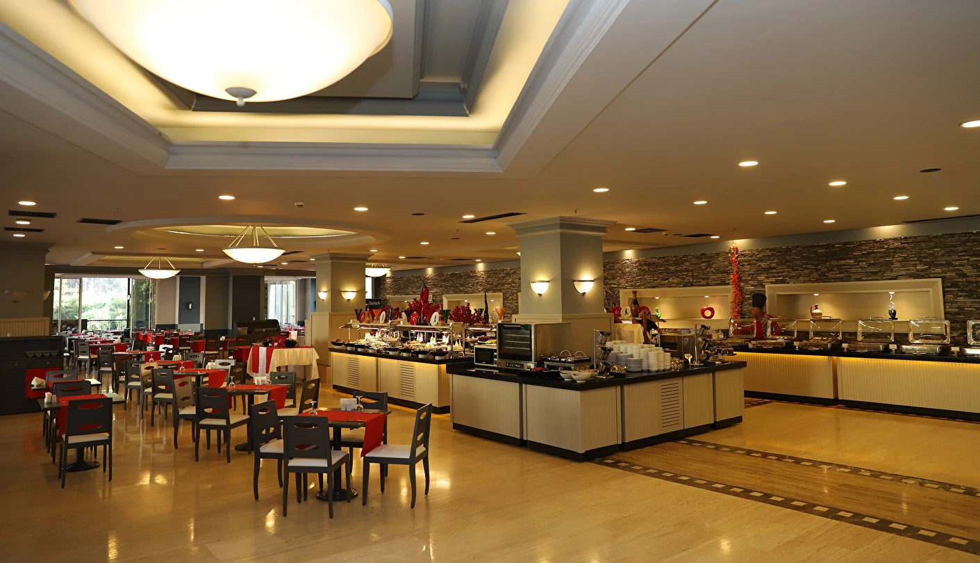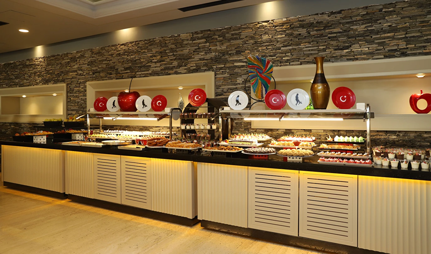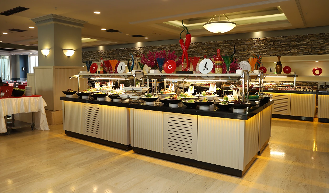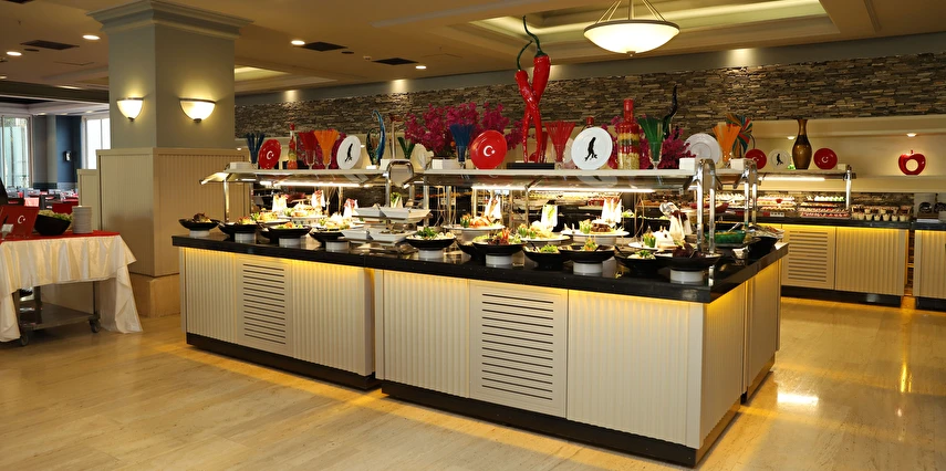 Sabah kahvaltısı, öğle ve akşam yemekleri açık büfe olup tesisin belirlediği markalar dahilinde 10:00 ile 02:00 saatleri arasında yerli alkollü alkolsüz ücretsizdir. İthal içecekler, şişe içecekler, taze sıkılmış meyve suları ve yerli şampanya ücretlidir. A la carte restoranlar için misafir ilişkilerinden 10:00-11:00 ve 13:00-16:00 saatleri arasında rezervasyon yapılmaktadır. A la carte restoranlarda yerli ve bazı ithal alkollü içecekler ve masa şarapları haricindeki şaraplar ücretlidir. Barlarda şişe içki servisi yapılmamaktadır. Türk kahvesi lobby barda ücretsizdir.