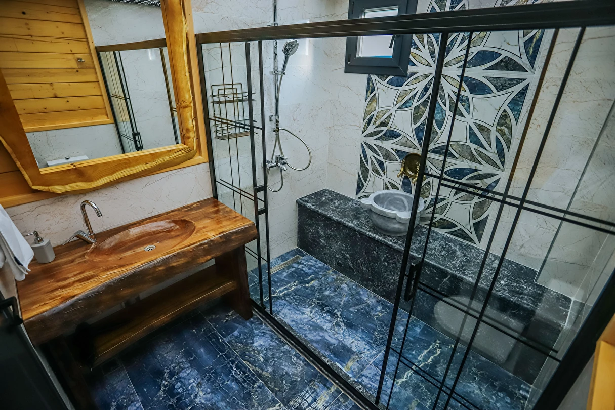 - Giriş katta: oturma bölümü + tam donanımlı mutfak + ebeveyn banyosu + Türk hamamı + 1 adet çift kişilik yatak + 2 adet açılabilir koltuk + Türk hamamı
