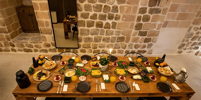 Güne mutlu ve enerjik başlamak için otelimiz, Mardin’in çevre köylerinden özenle seçilmiş, tamamen organik ürünlerle hazırlanmış serpme kahvaltı sunuyor. Mis gibi kokan domateslerden, taze yumurtalara, yerel peynir çeşitlerinden zeytinlere kadar birçok doğal lezzetle dolu bu kahvaltı, hem bağışıklık sisteminizi güçlendirecek hem de gün boyunca enerjinizi yüksek tutacak.