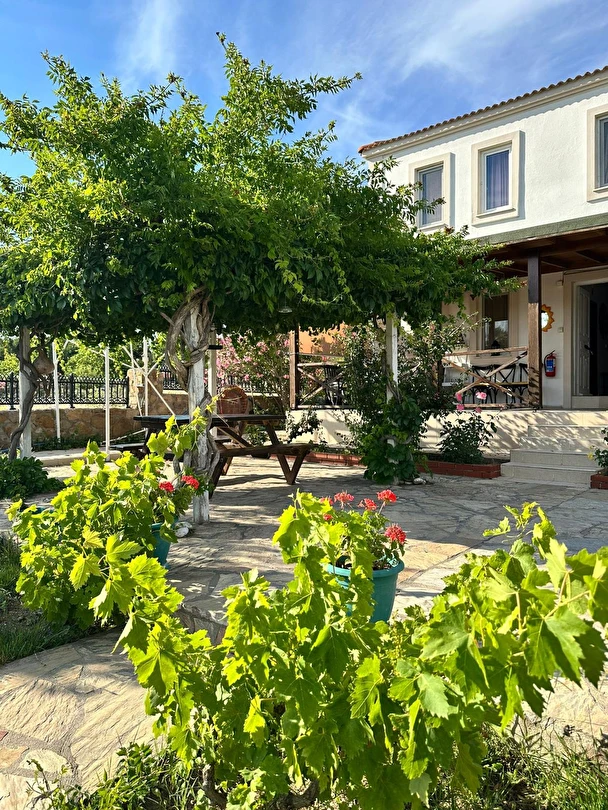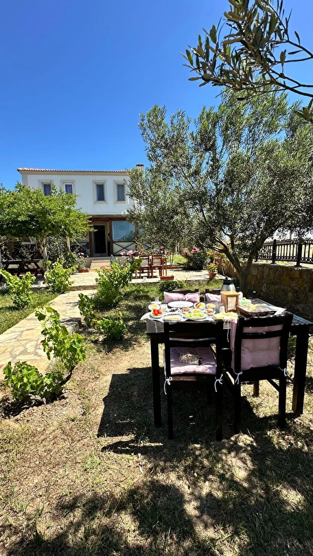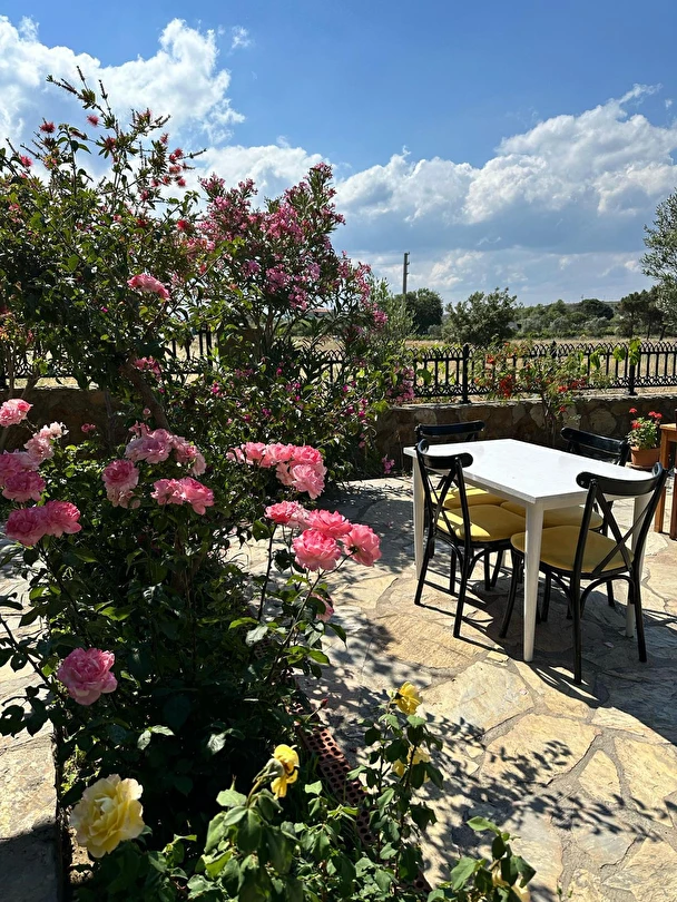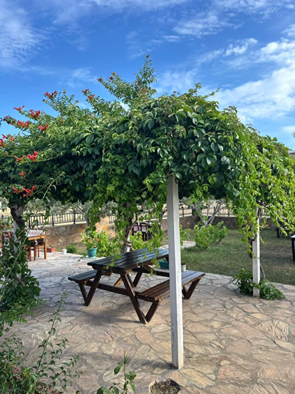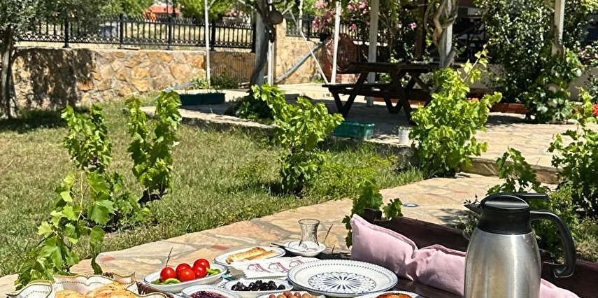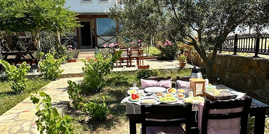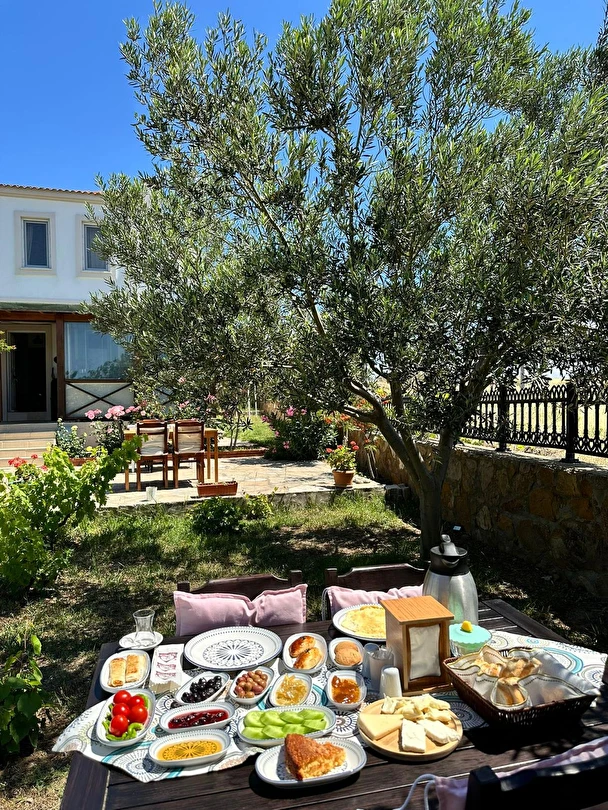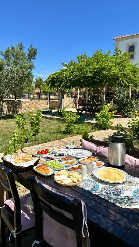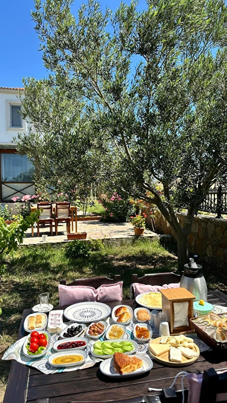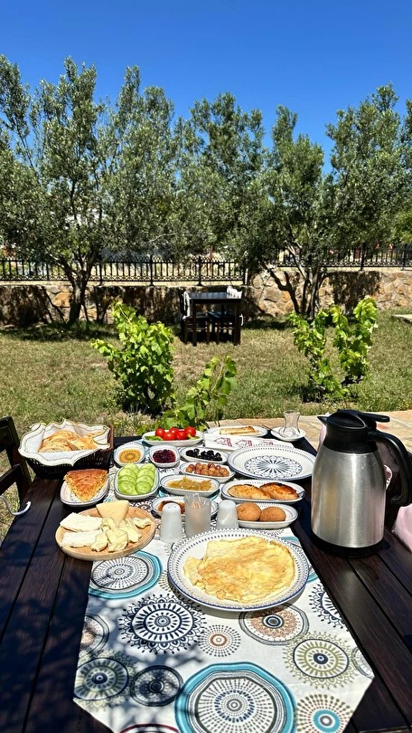 Her sabah servis edilen ücretsiz yerel tarz kahvaltı, zeytin ağaçları altında açık havada keyifle tadabileceğiniz lezzetli seçenekler sunar. Kahvaltı saatleri genellikle sabah 9:00–11:00 arasındadır.