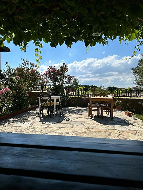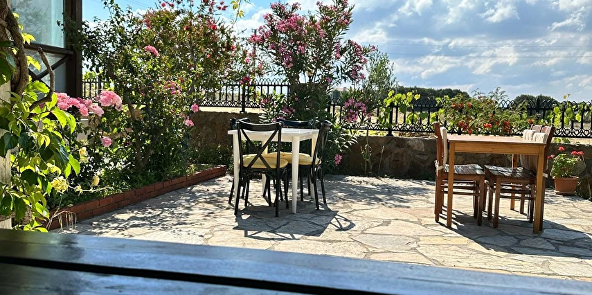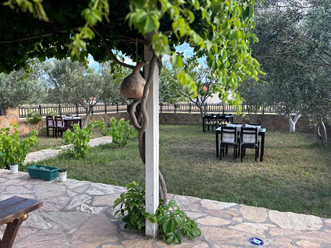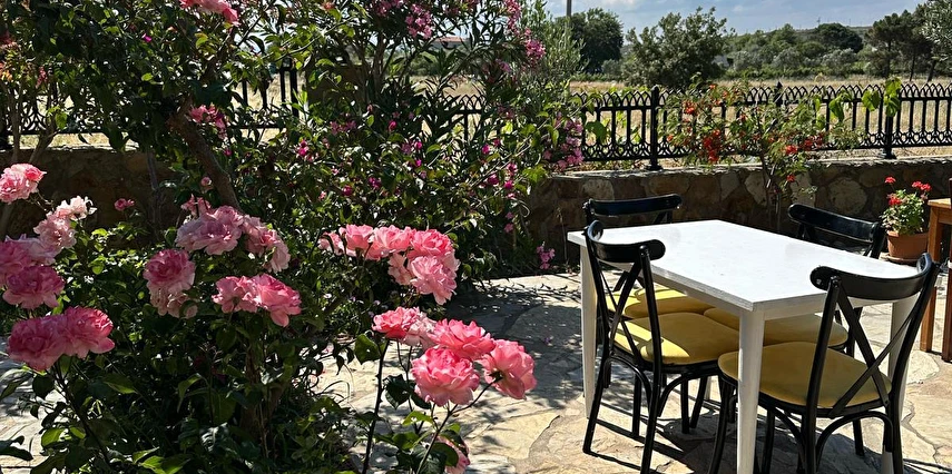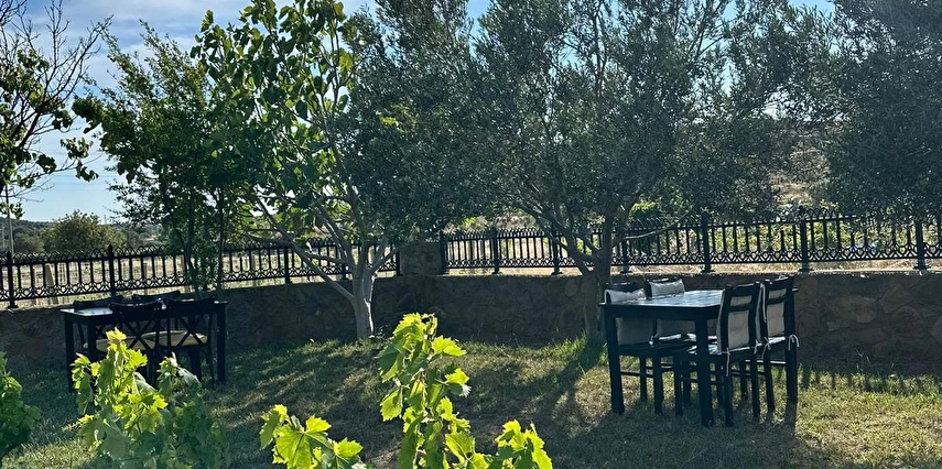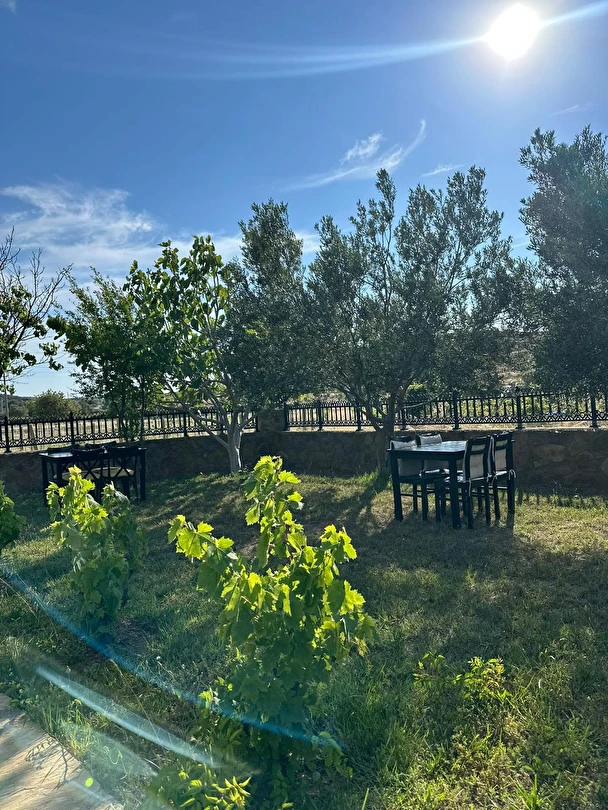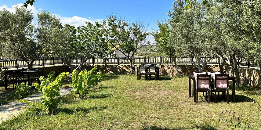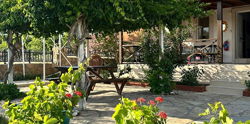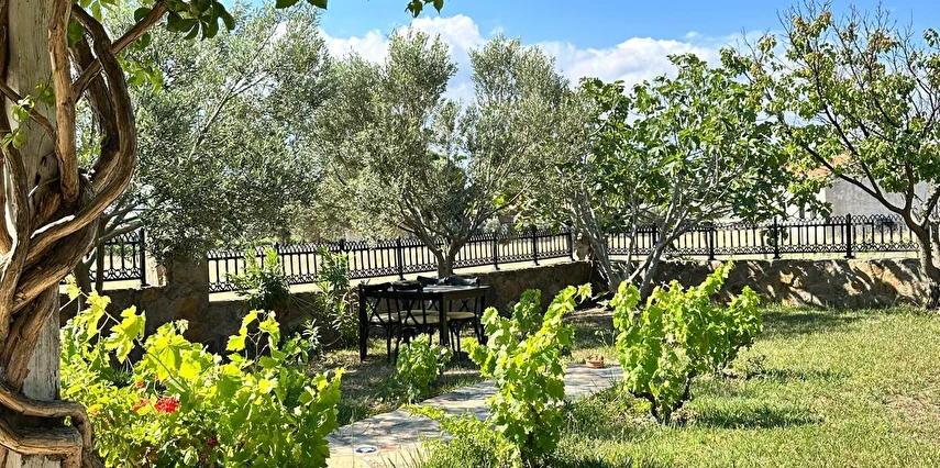 Her sabah servis edilen ücretsiz yerel tarz kahvaltı, zeytin ağaçları altında açık havada keyifle tadabileceğiniz lezzetli seçenekler sunar. Kahvaltı saatleri genellikle sabah 9:00–11:00 arasındadır.